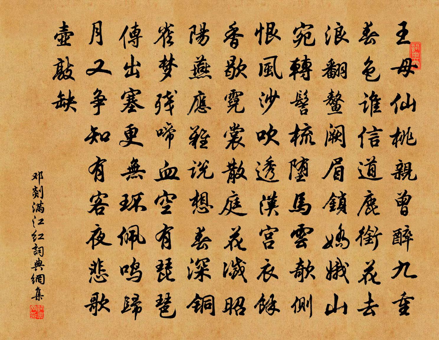 詩詞名句歷史字典書法欣賞書法字典國語詞典說文解字康熙字典古漢語字典標 題 作 者 詩 句 滿江紅作者:鄧剡 朝代:宋代滿江紅原文王母仙桃,親曾醉、九重春色。誰信道、鹿銜花去,浪翻鰲闕。眉鎖嬌娥山宛轉,髻梳墮馬雲欹側。恨風沙、吹透漢宮衣,余香歇。霓裳散,庭花滅。昭陽燕,應難說。想春深銅雀,夢殘啼血。空有琵琶傳出塞,更無環佩鳴歸月。又爭知、有客夜悲歌,壺敲缺。詩詞問答問:滿江紅的作者是誰?答:鄧剡問:滿江紅寫於哪個朝代?答:宋代鄧剡滿江紅書法欣賞滿江紅書法作品詩詞推薦雜曲歌辭。少年行二首杜牧〔唐代〕官為駿馬監,職帥羽林兒。兩綬藏不見,落花何處期。獵敲白玉鐙,怒袖紫金鎚。田竇長留醉,蘇辛曲護岐。豪持堪笑方岳〔宋代〕堪笑張華死不休,謾精象數古無儔。中台星拆何曾識,祗識龍泉動鬥牛。春寒陸游〔宋代〕滔天來洚水,震瓦戰昆陽。此敵猶能御,春寒不可當。瑞鷓鴣(為嬸壽)趙彥端〔宋代〕芙蓉池館一重重。留得黃花壽斝中。春到小春如有信,月臨良月正相同。芝蘭美應瑤階瑞,苹藻香吹翠沼風。此夜題項羽廟三首之一賀鑄〔宋代〕分張天下付群雄,回首鹹陽捲地空。六國三秦隨擾攘,錦衣何暇到江東。頌古一百則釋正覺〔宋代〕鳥之行空,魚之在水。江湖相忘,雲天得志。擬心一絲,對面千里。知恩報恩,人間几几。贈律師陳允平〔宋代〕傳來二十五條衣,晝夜修行晝夜持。老去任教零落盡,獼猴偷□□□□。蘇明允宗丈輓辭二首蘇頌〔宋代〕觀國五千里,成書一百篇。人方期遠到,天不與遐年。事業逢知己,文章有象賢。未終三聖傳,遺恨掩重泉。屏山夜雪胡寅〔宋代〕熟醉蓮盪風,未賞梅溪勝。踏雪訪屏山,今年得乘興。沁園春林正大〔宋代〕子陵先生,故人光武,以道相忘。幸炎符在握,六龍在御,臣來億兆,陽德方剛。自是先生,獨全高節,歸去江湖蝶戀花李之儀〔宋代〕萬事都歸一夢了。曾向邯鄲,枕上教知道。百歲年光誰得到。其間憂患知多少。無事且頻開口笑。縱酒狂歌,銷遣寄友釋文珦〔宋代〕疎索復疎索,世道今難托。驥騄筋力殘,鸞凰羽毛落。林公古人徒,風期諒如昨。歸來乎山中,攜手共行樂。句張順之〔宋代〕暗綠不遮春去路,亂紅翻作雨來天。酹江月(南康軍和蘇韻)文天祥〔宋代〕廬山依舊,淒涼處、無限江南風物。空翠晴嵐浮汗漫,還障天東半壁。雁過孤峰,猿歸危嶂,風急波翻雪。乾坤未內閣春帖子夏竦〔宋代〕銀箭初傳暖律延,微和漸扇物華妍。彩幡紅鏤宜春字,永奉宸慈億萬年。題彭州陽平化徐氏〔唐代〕尋真游勝境,巡禮到陽平。水遠波瀾碧,山高氣象清。殿嚴孫氏貌,碑暗系師名。夜月登壇醮,松風森磬聲。古風其十七李白〔唐代〕金華牧羊兒。乃是紫煙客。我願從之游。未去發已白。不知繁華子。擾擾何所迫。崑山采瓊蕊。 可以煉精魄。沈園陸游〔宋代〕城上斜陽畫角衰,沈園非復舊池台。傷心橋下春波綠,曾是驚鴻照影來。無題种放〔宋代〕樓台縹緲路岐傍,共說祈真白玉堂。株樹風高低絳節,靈台香冷醮虛皇。名傳六合何昭晰,事隔三清限渺茫。欲識禪人並化主寫真求贊釋正覺〔宋代〕兀然而然,湛存象先。曹溪昧橫畫,少室還默傳。體不匿而了了,用不勤而綿綿。得麟角兮石頭足,捋虎鬚兮林際名句推薦時人不識農家苦,將謂田中谷自生。顏仁郁《農家》 棄捐勿復道,努力加餐飯。佚名《行行重行行》 今我來思,雨雪霏霏。佚名《採薇》 枕上詩書閒處好,門前風景雨來佳。李清照《攤破浣溪沙·病起蕭蕭兩鬢華》 失之毫釐,差以千里。班固《漢書·傳·東方朔傳》 問他有甚堪悲處?思量卻也有悲時,重陽節近多風雨。辛棄疾《踏莎行·庚戌中秋後二夕帶湖篆岡小酌》 丹楓萬葉碧雲邊,黃花千點幽岩下。張掄《踏莎行·秋入雲山》 乍咽涼柯,還移暗葉,重把離愁深訴王沂孫《齊天樂·蟬》 何意百鍊剛,化為繞指柔。劉琨《重贈盧諶》 晴雲滿戶團傾蓋,秋水浮階溜決渠。杜甫《柏學士茅屋》
