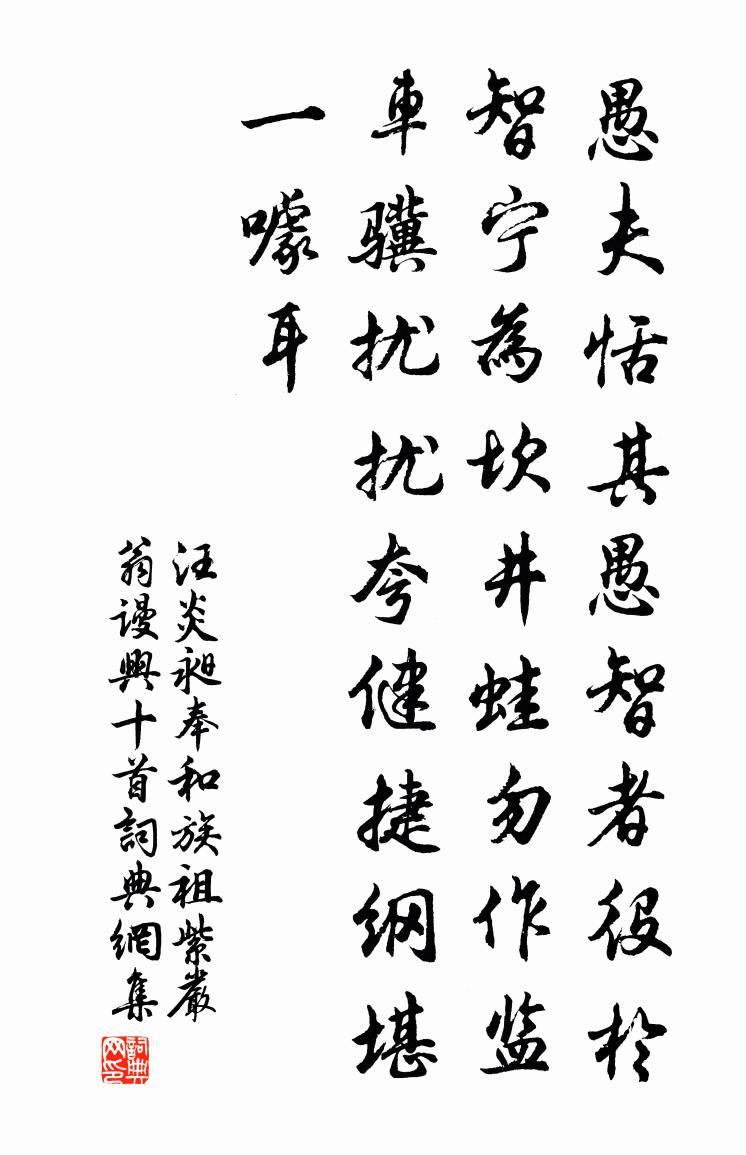 詩詞名句歷史字典書法欣賞書法字典國語詞典說文解字康熙字典古漢語字典標 題 作 者 詩 句 奉和族祖紫嚴翁謾興十首作者:汪炎昶 朝代:宋代奉和族祖紫嚴翁謾興十首原文愚夫恬其愚,智者役於智。寧為坎井蛙,勿作監車驥。擾擾夸健捷,綱堪一噱耳。詩詞問答問:奉和族祖紫嚴翁謾興十首的作者是誰?答:汪炎昶問:奉和族祖紫嚴翁謾興十首寫於哪個朝代?答:宋代汪炎昶奉和族祖紫嚴翁謾興十首書法欣賞奉和族祖紫嚴翁謾興十首書法作品詩詞推薦再呈仲庸裘萬頃〔宋代〕芳枝莫遣風吹折,要看枝頭千點雪。孤山疇昔盛開時,十里香颸飛不絕。蹇驢烏帽照霜顛,長吟竟日溪橋邊。自從贈別孟郊張籍〔唐代〕歷歷天上星,沉沉水中萍。幸當清秋夜,流影及微形。君生衰俗間,立身如禮經。純誠發新文,獨有金石聲。才名謝王進士惠近作袁說友〔宋代〕秋入淮鄉老,風連塞雁悲。一書煩故書,七字更新奇。我已歸帆日,公方客館時。天涯每相遇,不敢愛於詩。上林道李廌〔宋代〕憶昔驅車度函谷,解鞍訪古驪山麓。華清雖有亡國恨,繡嶺猶存舊時木。無情草木競爭春,不問興亡自紅綠。漢家雜詩絕句十七首梅堯臣〔宋代〕鵲銜高樹蟬,危脅繅車響。露腹不曾肥,殺之嗟已往。觀水嘆二首楊萬里〔宋代〕亂石厄江水,要使水無路。不知石愈密,激得水彌怒。回鋒打別港,勇往遮不住。我舟歷諸灘,閱盡水態度。一聞與楊秀才話別齊己〔唐代〕庾信哀何極,仲宣悲苦多。因思學文賦,不勝弄乾戈。自古有如此,於今終若何。到頭重策蹇,歸去舊煙蘿。飯祈澤寺王安石〔宋代〕駕言東南遊,午飯投僧館。山白梅蕊長,林黃柳芽短。笭箵沙際來,略彴桑閒斷。春映一川明,雪消千壑漫。魚隨野居池上看月姚系〔唐代〕悠然雲間月,復此照池塘。泫露蒼茫濕,沉波澹灩光。應門當未曙,歌吹滿昭陽。遠近徒傷目,清輝靄自長。偈頌六十首釋曇華〔宋代〕文殊據虎頭,山僧取虎尾。中間諸菩薩,隨列生歡喜。正月二十日,從吳天石處讀緯雲弟京邸春詞,陳維崧〔清代〕今年明月無情甚,偏向江東。只照軍容,不放銀花萬樹紅。鳳城飛下征南騎,一片刀弓。鐵甲呼風,愁煞思鄉沈侍十二月二十三日華亭小泊戴表元〔宋代〕一一歌游處,今年又寂寥。雞聲生塢樹,蜃氣雜江潮。斑白尋遺老,丹青詫麗譙。衰懷緣子女,不憚往來游。三鴉鎮題壁佚名〔宋代〕二年憔悴三鴉,無米無錢怎養家。每日兩養唯是藕,看看口裹是出蓮花。假山何耕〔宋代〕空庭幻出小嶙峋,假外應須別有真。只恐話頭成丙橛,若為融攝主和賓。和李校書新題樂府十二首縛戎人元稹〔唐代〕邊頭大將差健卒,入抄禽生快於鶻。但逢赬面即捉來,半是邊人半戎羯。大將論功重多級,捷書飛奏何超忽。聖朝句寇準〔宋代〕蒼芷溪煙晻靄山,翛然城角起天端。壽湖南汪倉十首廖行之〔宋代〕三年弱羽自清陰,行借高風入上林。猶向齊庭一伸喙,此鳴端亦為知音。新秋言懷寄魯望三十韻皮日休〔唐代〕新秋入破宅,疏淡若平郊。戶牖深如窟,詩書亂似巢。移床驚蟋蟀,拂匣動蠨蛸。靜把泉華掬,閒拈乳管敲。檜身秋夜出門觀月陸游〔宋代〕六十衰翁適得閒,一秋無事掩柴關。雁來慘澹沙場外,月出蒼茫雲海間。飲酒已衰猶愛客,著書初畢可藏山。此生楊州城樓陳杰〔宋代〕東南賦甲天下所,萬里西風生黍禾。禹貢九州今見一,晉軍三役古無多。水包楚蜀雖朝海,山引終嵩只隔河。巡得名句推薦高風吹玉柱,萬籟忽齊飄司空曙《風箏》 垂楊低映木蘭舟。半篙春水滑,一段夕陽愁。晁補之《臨江仙·綠暗汀洲三月暮》 午夢初回,捲簾盡放春愁去。周晉《點絳唇·訪牟存叟南漪釣隱》 黃鶴一去不復返,白雲千載空悠悠。崔顥《黃鶴樓 / 登黃鶴樓》 兵戈既未息,兒童盡東征。杜甫《羌村三首·其三》 示上以足,示下以惠,怨自削減。來俊臣《羅織經·固榮卷第六》 屏卻相思,近來知道都無益。王國維《點絳唇·屏卻相思》 小來思報國,不是愛封侯。岑參《送人赴安西》 此情可待成追憶?只是當時已惘然。李商隱《錦瑟》 當關不報侵晨客,新得佳人字莫愁。李商隱《富平少侯》