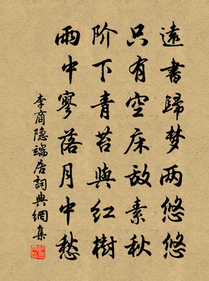 三、四兩句從室內的“空床”移向室外的“青苔”、“紅樹”。但並不是客觀地描繪,而是移情入景,使客觀景物對象化,帶上濃厚的主觀色彩。寂居異鄉,平日很少有人來往,階前長滿了青苔,更顯出寓所的冷寂。紅樹,則正是暮秋特有的景象。青苔、紅樹,色調本來是比較明麗的,但由於是在夜間,在迷濛雨色、朦朧夜月的籠罩下,色調便不免顯得黯淡模糊。在滿懷愁緒的詩人眼裡,這“階下青苔與紅樹”似乎也在默默相對中呈現出一種無言的愁緒和清冷寥落的意態。這兩句中“青苔”與“紅樹”,“雨中”與“月中”,“寥落”與“愁”,都是互文錯舉。“雨中”與“月中”,似乎不大可能是同一夜間出現的景象。但當詩人面對其中的一幅圖景時(假定是月夕),自不妨同時在心中浮現先前經歷過的另一幅圖景(雨夕)。這樣把眼前的實景和記憶中的景色交織在一起,無形中將時間的內涵擴展延伸了,暗示出像這樣地中宵不寐,思念遠人已非一夕。同時,這三組詞兩兩互文錯舉,後兩組又句中自對,又使詩句具有一種迴環流動的美。如果聯繫一開頭的“遠書”、“歸夢”來體味,那么這“雨中寥落月中愁”的青苔、紅樹,似乎還可以讓讀者聯想起相互遠隔的雙方“各在天一涯”默默相思的情景。風雨之夕,月明之夜,胸懷愁緒而寥落之情難以排遣,不禁令人滿腹悵然,亦生憐惜之心。