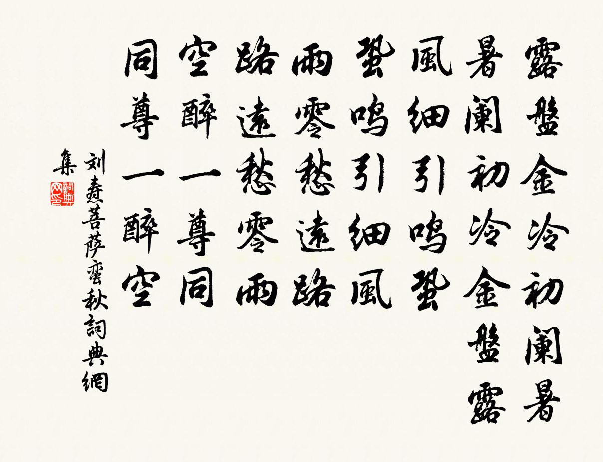 詩詞名句歷史字典書法欣賞書法字典國語詞典說文解字康熙字典古漢語字典標 題 作 者 詩 句 菩薩蠻(秋)作者:劉燾 朝代:宋代菩薩蠻(秋)原文露盤金冷初闌暑。暑闌初冷金盤露。風細引鳴蛩。蛩鳴引細風。雨零愁遠路。路遠愁零雨。空醉一尊同。同尊一醉空。詩詞問答問:菩薩蠻(秋)的作者是誰?答:劉燾問:菩薩蠻(秋)寫於哪個朝代?答:宋代問:菩薩蠻(秋)是什麼體裁?答:詞劉燾菩薩蠻(秋)書法欣賞菩薩蠻(秋)書法作品詩詞推薦曲尺山雲居寺王灼〔宋代〕循溪上坡坨,溪亦因山曲。行盡高深處,招提隱山腹。往者灰燼餘,白塔但孤矗。十年鬧斤斧,有此千間屋。阿師城東看柳陳郁〔宋代〕翻暖為寒一信風,畫橋南北岩西東。春歸楊柳無私意,深淺青黃自不同。雀趙崇鉘〔宋代〕短翅遍斕貝花紫,逐食飛行曉霜里。只知嘴爪求自肥,肥甘累人心弗知。天寒日暮向何處,前路多山慎勿去。吳兒已亥雜詩 297龔自珍〔清代〕蒼生氣類古猶今,安用冥鴻物外吟。不是九州同急難,尼山誰識憮然心。兒啼索飯楊萬里〔宋代〕飽暖君恩豈不知,小兒窮慣只長飢。朝朝聽得兒啼處,正是炊粱欲熟時。壽客史鑄〔宋代〕東籬寂寞舊家鄉,頭白大生須又黃。歲歲相陪重九宴,主人傳得引年方。送巡撫侍讀呂司諫王禹偁〔宋代〕三十軍城百萬家,侍臣分命走軺車。長春殿里承丹詔,乙夜書邊別翠華。駐馬只教看壠麥,憂民無暇醉溪花。歸朝己已秋七月不雨人心焦然乃戊午齋宿致城隍清牟巘五〔宋代〕幾度看雲眼欲穿,不應氣數總關天。去年兵又今年旱,守也於民自豪緣。臨江仙·點滴芭蕉心欲碎納蘭性德〔清代〕點滴芭蕉心欲碎,聲聲催憶當初。欲眠還展舊時書。鴛鴦小字,猶記手生疏。倦眼乍低緗帙亂,重看一半模糊。幽奉和御製扇徐鉉〔唐代〕齊紈新裂月輪全,蟬雀分明彩翠鮮。救暍自符仁主意,揚風須假手中扇。暫遮樓日霞光透,半掩歌唇寶靨圓。一曲奉使契丹道中答劉原父桑乾河見寄之作歐陽修〔宋代〕憶昨初受命,同下紫宸朝。問君當何之,笑指北斗杓。共念到幾時,春風約回鑣。所持既異事,前後忽相遼。歲月宿池上賈島〔唐代〕泉來從絕壑,亭敞在中流。竹密無空岸,松長可絆舟。蟪蛄潭上夜,河漢島前秋。異夕期深漲,攜琴卻此游。蝶戀花(次張俊臣韻)楊冠卿〔宋代〕舞處曾看花滿面。獨倚東風,往事思量遍。綠怨紅愁春不管。天涯芳草人腸斷。一紙雲箋魚雁遠。歸鳳求凰,誰識雜曲歌辭結客少年場行沉彬〔唐代〕重義輕生一劍知,白虹貫日報仇歸。片心惆悵清平世,酒市無人問布衣。句宋祁〔宋代〕至公三籍在儲胥。次韻謝張安撫以詩送梅實項安世〔宋代〕此物從來作計疏,洛陽櫻筍正馳驅。絕知不可時人口,只有微酸愜腐儒。和湯倅春雪虞儔〔宋代〕雪瑞元來竟不空,豐年訊息喜潛通。故憐梅老扶衰白,未放桃夭嫁小紅。夜動檐花猶帶雨,晴看隴麥待搖風。強顏寄金山良書記章甫〔宋代〕浮玉山頭屋數椽,同龕彌勒憶當年。只今輸與良書記,睡起晴窗看釣船。同德麟仲寶過謝公定酌酒賞菊以悲哉秋之為氣李廌〔宋代〕楚女唱桃葉,楚巫歌竹枝。壯士撫長鋏,語闌亦興悲。君看拱把松,中有千歲姿。蕣華不及夕,柯葉漫成籬。已亥雜詩 44龔自珍〔清代〕毫霜擲罷倚天寒,任作淋漓淡墨看。何敢自矜醫國手,藥方只販古時丹。名句推薦行人悵望王孫去,買斷金釵十二愁。俞紫芝《詠草》 桐花半畝,靜鎖一庭愁雨。周邦彥《瑣窗寒·寒食》 蒲生我池中,其葉何離離。甄宓《塘上行》 記取江湖泊船處,臥聞新雁落寒汀。陸游《夜泊水村》 行行重行行,與君生別離。佚名《行行重行行》 淺不足與測深,愚不足與謀智,坎井之蛙,不可與語東海之樂。荀子《荀子·正論》 天與秋光,轉轉情傷,探金英知近重陽。李清照《行香子·天與秋光》 微雨眾卉新,一雷驚蟄始。韋應物《觀田家》 握手一長嘆,淚為生別滋蘇武《留別妻》 幾度紅窗,誤認鳴鑣。斷腸風月可憐宵。蔡伸《一剪梅·堆枕烏雲墮翠翹》