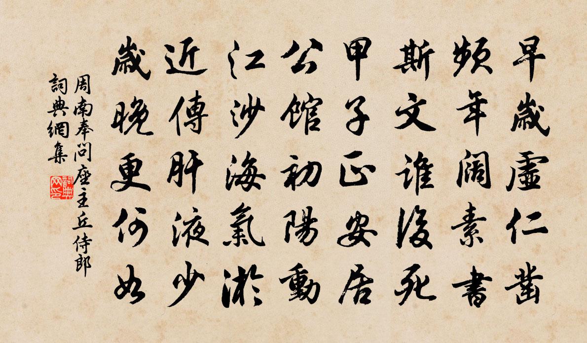 詩詞名句歷史字典書法欣賞書法字典國語詞典說文解字康熙字典古漢語字典標 題 作 者 詩 句 奉問座主丘侍郎作者:周南 朝代:宋代奉問座主丘侍郎原文早歲虛仁鑿,頻年闊素書。斯文誰後死,甲子正安居。公館初陽動,江沙海氣淤。近傳肝液少,歲晚更何如。詩詞問答問:奉問座主丘侍郎的作者是誰?答:周南問:奉問座主丘侍郎寫於哪個朝代?答:宋代周南奉問座主丘侍郎書法欣賞奉問座主丘侍郎書法作品詩詞推薦游城南,留元九、李二十晚歸白居易〔唐代〕老遊春飲莫相違,不獨花稀人亦稀。更勸殘杯看日影,猶應趁得鼓聲歸。書蘭莫德全壁潘璵〔宋代〕誰謂居廛身未清,在家心似出家僧。銅壺慣買梅花插,相對無言悟小乘。答陳公美四首蘇洵〔宋代〕仲尼魯司寇,官職亦已優。從祭肉不及,戴冕奔諸侯。當時不之知,為肉誠可羞。君子意有在,眾人但愆尤。置之和子瞻過嶺蘇轍〔宋代〕山林瘴霧老難堪,歸去中原荼亦甘。有命誰令終返北,無心自笑欲巢南。蠻音慣習疑傖語,脾病縈纏帶嶺嵐。手挹李白謫仙詩(此詩或謂李白作)蘇軾〔宋代〕我居青空里,君隱黃埃中。聲形不相吊,心事難形容。欲乘明月光,訪君開素懷。天杯飲清露,展翼登蓬萊。佳人呂郎治先以職事至常山縣不敢越境以書致兩郡曾幾〔宋代〕子到常山縣,饒陽有敝廬。相望百里地,空得數行書。睡思茶料理,愁懷酒破除。新秋即在眼,過我定何如。寒食張鎡〔宋代〕地僻人稀到,檐虛燕未過。清愁詩酒少,寒食雨風多。名字因農具,襟懷屬釣蓑。莫驚時節換,安分看如何。山閣張埴〔宋代〕絳甲至今尋四百,東風吹酒楚天涯。有時咄咄口三唾,無事由由手一叉。不怨雨聲聾客耳,只愁春思亂楊花。弄烏癸卯豫章貢闈酬贈教授張安叔曾豐〔宋代〕吾與子所居,相去二百里。建昌吾之鄰,其實同郡耳。已久聞姓名,不專為科第。論心雖所共,舉足若相避。只今癸水亭落成,示坐客長老之記曰︰癸水繞東城范成大〔宋代〕天將福地鞏嚴城,形勝山川表里明。舊說桂林無瘴氣,今知灕水辟刀兵。雲深銅柱邊聲樂,月冷珠池海面平。願挽題隱圃贈蔣希魯范師道〔宋代〕勇退人難事,明公識慮長。波濤濟舟輯,霜雪見松篁。林下開前圃,花間撤亞槍。二疏良宴會,老杜好篇章。道向丙辰年鄜州遇寒食城外醉吟五首韋莊〔唐代〕滿街楊柳綠絲煙,畫出清明二月天。好是隔簾花樹動,女郎撩亂送鞦韆。雕陰寒食足遊人,金鳳羅衣濕麝薰。腸斷食薺十韻陸游〔宋代〕舍東種早韭,生計似庾郎;舍西種小果,戲學蠶叢鄉。惟薺天所賜,青青被陵岡,珍美屏鹽酪,耿介凌雪霜。採擷薛舍人母方氏太恭人挽章二首楊萬里〔宋代〕熊膽平生苦,魚軒脕歲榮。芝蘭今柱史,苗裔古玄英。寒食花爭泣,元宵燭半明。從今好時節,萱砌罷君口。湖山村戴表元〔宋代〕老去生涯學釣魚,溪山忽憶似湘湖。風林四畔動竽瑟,煙雨一篙行畫圖。小市篝明沽郭索,平園柵樹奮於菟。偶然初發桂林,有出嶺之喜,但病餘便覺登頓,至范成大〔宋代〕桂林獨宜人,無瘴古所傳。北客守炎官,恃此以泰然。堂高愜宴坐,訟簡容佳眠。不計身落南,璇柄三回天。今朝水龍吟蕭元之〔宋代〕人生何必求名,身閒便是名高處。臥雲衣袂,何因自染,修塗塵土。世路羊腸,人情狙賦,翻雲覆雨。把從前舊夢次君用借屋鄭恕齋〔宋代〕拋卻西湖舊綠簑,閉門無計奈愁何。非關豪氣消磨盡,自是中年感慨多。漫漫平波魚自躍,陰陰垂柳鳥能歌。小樓蓬萊客 贈吳庵師馬鈺〔元代〕庵師急。庵師和尚迎仙客。迎仙客。香菸繚繞,把予眸隔。如麻觀者難籌測。良緣共結功無溺。功無溺。龍華三會自曉存心訣晃逈〔宋代〕心息音,混融深。智先覺,念無侵。隨辦及,即漫尋。用此法,存於心。名句推薦增冰峨峨,飛雪千里些。屈原《招魂》 以五十步笑百步。孟子《孟子·梁惠王章句上·第三節》 不明察,不能燭私。韓非及後人《韓非子·孤憤》 漢家旌幟滿陰山,不遣胡兒匹馬還。戴叔倫《塞上曲二首·其二》 古木陰中系短篷,杖藜扶我過橋東。志南《絕句》 天下者、大具也,不可以小人有也,不可以小道得也,不可以小力持也。荀子《荀子·正論》 楚人悲屈原,千載意未歇。蘇軾《屈原塔》 未必素娥無悵恨,玉蟾清冷桂花孤。晏殊《中秋月》 欲渡黃河冰塞川,將登太行雪滿山。李白《行路難·其一》 今年春淺臘侵年。冰雪破春妍。蘇軾《一叢花·今年春淺侵年》