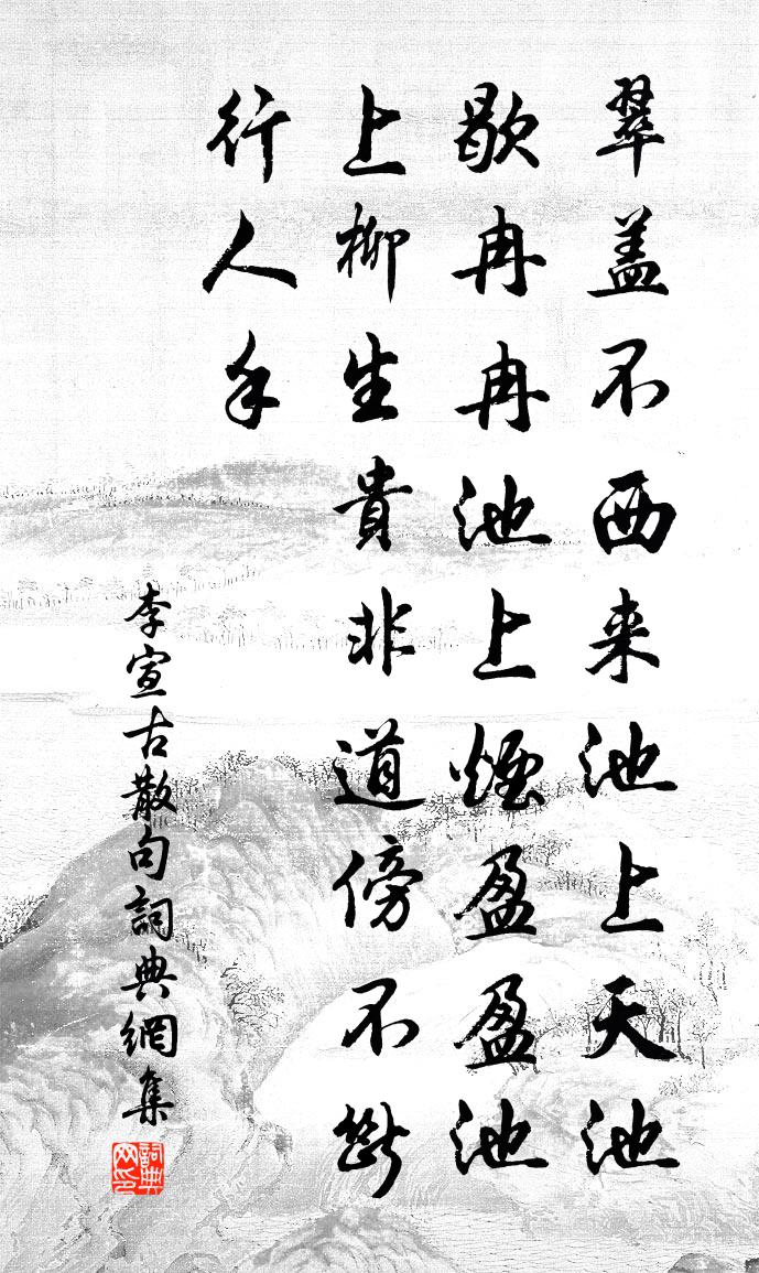 詩詞名句歷史字典書法欣賞書法字典國語詞典說文解字康熙字典古漢語字典標 題 作 者 詩 句 句作者:李宣古 朝代:唐代句原文翠蓋不西來,池上天池歇。冉冉池上煙。盈盈池上柳。生貴非道傍,不斷行人手。詩詞問答問:句的作者是誰?答:李宣古問:句寫於哪個朝代?答:唐代問:句是什麼體裁?答:句李宣古句書法欣賞句書法作品注釋全唐詩:卷552-21詩詞推薦送李侍郎赴常州賈至〔唐代〕雪晴雲散北風寒,楚水吳山道路難。今日送君須盡醉,明朝相憶路漫漫。初夏幽居雜賦陸游〔宋代〕過盡一春雨,園林氣少和。偶然扶楖栗,復爾坐盤陀。小草數行字,殘花一曲歌。公卿非傲汝,無奈愛閒何!八景歌趙汝鐩〔宋代〕西顥沆碭露華白,河漢浩浩浴素魄。平湖萬頃搖銀光,祗留君山一點碧。帝子揚靈駕飛龍,鼓瑟來游水精宮。聲徹折楊柳(一作沈佺期詩)宋之問〔唐代〕玉樹朝日映,羅帳春風吹。拭淚攀楊柳,長條宛地垂。白花飛歷亂,黃鳥思參差。妾自肝腸斷,傍人那得知。秋日懷江上友人羅鄴〔唐代〕行子豈知煙水勞,西風獨自泛征艘。酒醒孤館秋簾卷,月滿寒江夜笛高。黃葉夢餘歸朔塞,青山家在極波濤。去年又和宋侯三首劉克莊〔宋代〕梨園部里奏雲和,衰惰煩公發藥多。有囀春鶯觴客酒,無如龍馬暴民禾。盍陪天下傳柑宴,且聽民間秀麥歌。歸對滁上謫居王禹偁〔宋代〕跡去金鑾殿,官移玉筍班。才高寧免妬,命薄不如閒。曉監悲華發,春醪慰病顏。為郎身漸老,自笑不歸山。菊葉茵〔宋代〕壽客若為情,風流友麴生。殿秋安晚節,為隱被香名。曼衍南陽種,淒涼楚澤英。見山應自語,今古風淵明。送朱大入秦孟浩然〔唐代〕遊人五陵去,寶劍值千金。分手脫相贈,平生一片心。偈頌四十一首釋慧暉〔宋代〕今宵分歲限陰陽,賓主交和曾不藏。寒雪苦辛霜後路,明朝明旭露春芳。宿道士觀朱慶餘〔唐代〕堂閉仙人影,空壇月露初。閒聽道家子,盥漱讀靈書。次韻周敏卿秋興三首喻良能〔宋代〕悠悠草根蟲,鳴聲近我床。皎皎林間月,亦已照我牆。感此動萬慮,聊復舉一觴。何以侑我酒,清嘯聞疏篁。和新篁韻衛宗武〔宋代〕竹君清絕潤於玉,譜牒出自淇之澳。移根分種置吾廬,才隔樊牆即家塾。塾之所有無非書,師友摛文剪其蕪。此君相和歌辭採蓮曲僧齊己〔唐代〕越江女,越江蓮,齊菡萏,雙嬋娟。嬉遊向何處,採摘且同船。浩唱發容與,清波生漪漣。時逢島嶼泊,幾共鴛鴦方壺自詠汪莘〔宋代〕三萬六千刻,四千三百時。不思人事汩,只怪歲華馳。拚命嘗因道,忘家亦為詩。幽懷聊自遣,俗子莫令知。暉仲惠梅花數枝韓元吉〔宋代〕莫問南枝與北枝,幽香先與小春期。直從的皪寒梢數,看到飄零似雪時。月袁郊〔唐代〕嫦娥竊藥出人間,藏在蟾宮不放還。后羿遍尋無覓處,誰知天上卻容奸。頌一百則釋重顯〔宋代〕雙收雙放若為宗,騎虎由來要絕功。笑罷不知何處去,只應千古動悲風。送張太傅還鄉蔡襄〔宋代〕置器功成佚退身,故園南望整車茵。青冥直上無餘事,白首歸來有幾人。門外離筵晴日曉,江邊行路雜花春。橐金相和歌辭善哉行僧齊己〔唐代〕大鵬刷翮謝溟渤,青雲萬層高突出。下視秋濤空渺彌,舊處魚龍皆細物。人生在世何容易,眼濁心昏信生死。願除名句推薦登泰山而小天下。孟子《孟子·盡心章句上·第二十四節》 解釋春風無限恨,沉香亭北倚闌乾。李白《清平調·其三》 黃鶯百舌正相呼,玉樹後庭花帶雨。牛殳《琵琶行》 半天涼月色,一笛酒人心。袁枚《夜過借園見主人坐月下吹笛》 晚風庭院落梅初。淡雲來往月疏疏。李清照《浣溪沙·髻子傷春慵更梳》 仕宦當作執金吾,娶妻當得陰麗華。范曄《後漢書·本紀·皇后紀上》 泠泠七弦上,靜聽松風寒。劉長卿《聽彈琴》 言無二貴,法不兩適。韓非及後人《韓非子·問辯》 世間花葉不相倫,花入金盆葉作塵。李商隱《贈荷花》 行人刁鬥風沙暗,公主琵琶幽怨多。李頎《古從軍行》