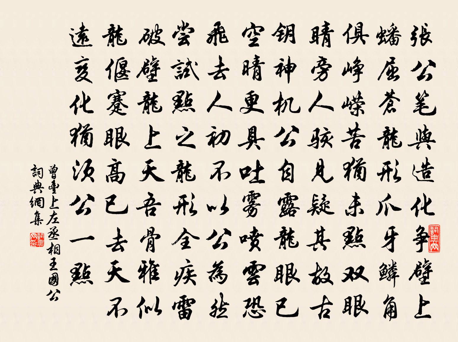 詩詞名句歷史字典書法欣賞書法字典國語詞典說文解字康熙字典古漢語字典標 題 作 者 詩 句 上左丞相王國公作者:曾豐 朝代:宋代上左丞相王國公原文張公筆與造化爭,壁上蟠屈蒼龍形。爪牙鱗角俱崢嶸,苦猶未點雙眼睛。旁人駭見疑其故,古鑰神機公自露。龍眼已空晴更具,吐霧噴雲恐飛去。人初不以公為然,嘗試點之龍形全,疾雷破壁龍上天。吾骨雅似龍偃蹇,眼高已去天不遠,變化猶須公一點。詩詞問答問:上左丞相王國公的作者是誰?答:曾豐問:上左丞相王國公寫於哪個朝代?答:宋代曾豐上左丞相王國公書法欣賞上左丞相王國公書法作品詩詞推薦詠史上劉向陳普〔宋代〕 * 明光奏五侯,帝鄉寥隔在溫柔。甘泉太乙重招起,聊答青藜照白苹。留侯衛宗武〔宋代〕狙擊豈良圖,命幾危博浪。既受黃石書,顛秦而蹶項。報韓志已酬,興漢車仍贊。歷陳借箸計,潛消刻印患。定封月灣癖地山中誅芭歸隱怡如賦詩次韻贊決徐瑞〔宋代〕作意歸來孰謂非,挹芳有地復何疑。遲留固是全交道,勇退方知識事宜。尚用侍郎書戶契,肯求節度賣山貲。風流哭曼卿歐陽修〔宋代〕嗟我識君晚,君時猶壯夫。信哉天下奇,落落不可拘。軒昂懼驚俗,自隱酒之徒。一飲不計斗,傾河竭昆墟。作詩獨至香山憶謝學士歐陽修〔宋代〕伊水弄春沙,山臨水上斜。曾為謝公客,◇入梵王家。陰澗初生草,春岩自落花。卻尋題石處,歲月已堪嗟。賦得謁帝承明廬詩江總〔隋代〕霧開仁壽殿。雲繞承明廬。輪停紺幰引。馬度紅塵余。香貂拜黻袞。花綬拂玄除。謁帝升清漢。何殊入紫虛。夏日城中作二首齊己〔唐代〕三面僧鄰一面牆,更無風路可吹涼。他年舍此歸何處,青壁紅霞裹石房。竹低莎淺雨濛濛,水檻幽窗暑月中。有境江上孫介〔宋代〕灘頭鳴榔去,偃仰醉霜月。意倦早歸來,風波渺愁絕。荒齋晝坐為鳴鳶所聒宋祁〔宋代〕喜鈔寒鴟六翮輕,蕭條墟落恣飛鳴。屠鄰腐肉知無限,少作揚州餓箭聲。柳枝詞十三首司馬光〔宋代〕依依高村出宮牆,搖曳青絲百尺長。願與宣溫萬年樹,年年歲歲奉君王。頌古釋道顏〔宋代〕袖頭打領無添減,腋下剜襟有短長。大庾嶺頭一尊佛,疏山兩度放毫光。送曹商之宿州兼簡駱偃釋宇昭〔宋代〕病起春城暮,行心暗結愁。全吳無舊業,半世祇羈游。島霧沈晴樹,汀煙入夜舟。故人應老大,佐幕久淹流。金牛長老德鎧寫平園真求贊周必大〔宋代〕經傳白馬,寺假金牛。祖意西來,江水東流。於我何有,色見音求。千帆任過,長對沙洲。郴江百詠並序東山寺阮閱〔宋代〕竹外長橋過水西,林中鐘磬舊禪扉。筇迎殘月僧包去,帆背斜陽客艇歸。奉陪府公賽雪橋公廟紀事兼呈粹幕諸君蘇頌〔宋代〕北走出都門,寒坰冒初雪。言瞻漢三公,嚴祠奉遺烈。襜帷未行春,首茲薦腥血。念昨冬愆陽,時風少凝冽。長人送流人張籍〔唐代〕獨向長城北,黃雲暗塞天。流名屬邊將,舊業作公田。擁雪添軍壘,收冰當井泉。知君住應老,須記別鄉年。恩敕尚書省僚宴昆明池應制(同用堯字)張嘉貞〔唐代〕靈沼初開漢,神池舊浴堯。昔人徒習武,明代此聞韶。地脈山川勝,天恩雨露饒。時光牽利舸,春淑覆柔條。芳醞青衫濕遍·悼亡納蘭性德〔清代〕青衫濕遍,憑伊慰我,忍便相忘。半月前頭扶病,剪刀聲、猶在銀釭。憶生來、小膽怯空房。到而今,獨伴梨花影育闍黎房見秋蘭有花作毛滂〔宋代〕南風吹露畦,苦菜日夜花。同榮有蔓草,托質多長蛇。邇來合蕭條,淒風寄蒹葭。禪房向幽寂,雲日曖庭沙。竹根荷葉杯·一點露珠凝冷溫庭筠〔唐代〕一點露珠凝冷,波影,滿池塘。綠莖紅艷兩相亂,腸斷,水風涼。名句推薦寄語洛城風日道,明年春色倍還人。杜審言《春日京中有懷》 傷心秦漢經行處,宮闕萬間都做了土。張養浩《山坡羊·潼關懷古》 江闊雲低、斷雁叫西風。蔣捷《虞美人·聽雨》 寧我負人,毋人負我。陳壽《三國志·魏書·武帝紀》 琵琶弦上說相思。當時明月在,曾照彩雲歸。晏幾道《臨江仙·夢後樓台高鎖》 恩威同施,才德相較,苟無功,得無天耶?來俊臣《羅織經·治下卷第三》 古之君子,過則改之。孟子《孟子·公孫丑章句下·第九節》 昔時人已沒,今日水猶寒。駱賓王《於易水送人 / 於易水送別》 雪霏霏,風凜凜,玉郎何處狂飲?魏承班《滿宮花·雪霏霏》 碧野朱橋當日事,人不見,水空流。秦觀《江城子·西城楊柳弄春柔》