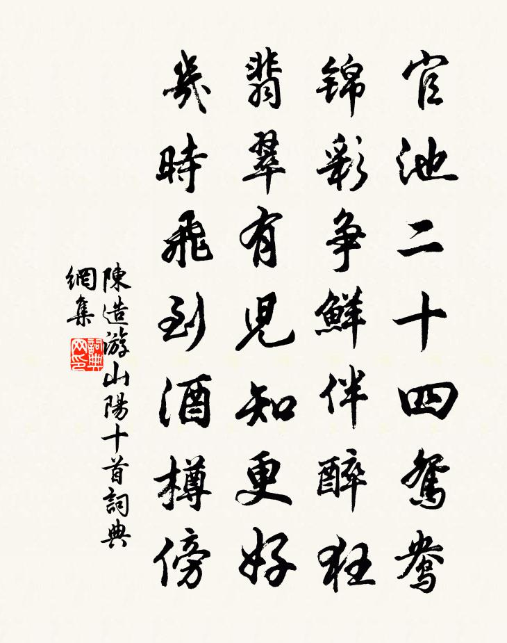 詩詞名句歷史字典書法欣賞書法字典國語詞典說文解字康熙字典古漢語字典標 題 作 者 詩 句 游山陽十首作者:陳造 朝代:宋代游山陽十首原文官池二十四鴛鴦,錦彩爭鮮伴醉狂。翡翠有兒知更好,幾時飛到酒樽傍。詩詞問答問:游山陽十首的作者是誰?答:陳造問:游山陽十首寫於哪個朝代?答:宋代陳造游山陽十首書法欣賞游山陽十首書法作品詩詞推薦和張功父榿木巴欖花韻楊萬里〔宋代〕南湖窠木已交加,種欖栽榿更北涯。生眼錯呼為夜合,新鶯知不是桃花。綠陰四合藏雲屋,翠浪全機織素紗。桂隱點絳唇(夜飲青雲樓,聞更漏近,如在腳底,因思向事,追念故作)趙長卿〔宋代〕瓦濕鴛鴦,夜深霜重江風冷。月華明映。清浸梅梢粉。漏斷寒濃,惹起當年恨。君休問。雁飛欲盡。沒個南來信。游茅山五首儲光羲〔唐代〕十年別鄉縣,西雲入皇州。此意在觀國,不言空遠遊。九衢平若水,利往無輕舟。北洛反初路,東江還故丘。春山商州客舍孟郊〔唐代〕商山風雪壯,遊子衣裳單。四望失道路,百憂攢肺肝。日短覺易老,夜長知至寒。淚流瀟湘弦,調苦屈宋彈。識聲春晏北園三首宋祁〔宋代〕春物在無幾,景隨人意閒。筍生迷塢缺,花盡失林殷。墜絮來何所,輕雲久未還。持杯問流照,肯信有朱顏。句佚名〔唐代〕人生分外愁。(郇伯與范酇為友,酇得句云:“歲盡天涯雨。”久而莫屬,郇伯云云,范甚賞之。見《北夢瑣言》秋蕊香晏殊〔宋代〕梅蕊雪殘香瘦。羅幕輕寒微透。多情只是春楊柳。占斷可憐時候。蕭娘勸我杯中酒。翻紅袖。金烏玉兔長飛走。爭下山歌宋之問〔唐代〕下嵩山兮多所思,攜佳人兮步遲遲。松間明月長如此,君再游兮復何時?病中思出遊陸游〔宋代〕病境雖猶在,秋天已自清。閒思尋酒伴,嬾畏主詩盟。煙艇桐江去,籃輿剡縣行。會心隨處住,便足了餘生。冬深(一作即日)杜甫〔唐代〕花葉隨天意,江溪共石根。早霞隨類影,寒水各依痕。易下楊朱淚,難招楚客魂。風濤暮不穩,舍棹宿誰門。十二時/憶少年佚名〔宋代〕聖明代,海縣澄清。惠化洽寰瀛。時康歲足,治定功成。遐邇賀昇平。嘉壇上,昭事神靈。薦明誠。報本禪雲亭。送陳景明尚書赴召四首黃公度〔宋代〕鼎軸今虛席,憂勤軫我皇。蒼生思起謝,丹詔急徵黃。風欲回三代,恩難私一方。願公攄遠業,吾道倍輝光。詠史下謝安陳普〔宋代〕地陷天傾不廢棋,謝安阮籍好同時。江東殘局危亡勢,似太元初尚可為。畫堂春(上老母壽)張孝祥〔宋代〕蟠桃一熟九千年。仙家春色無邊。書堂日暖卷非煙。晝永風妍。看取蔬封湯沐,何妨頻棹觥船。方瞳綠髮對儒仙。戲答皇甫監 時皇甫監初喪偶。白居易〔唐代〕寒宵勸酒君須飲,君是孤眠七十身。莫道非人身不暖,十分一盞暖於人。洞仙歌(壽稼軒)楊炎正〔宋代〕帶湖佳處,仿佛真蓬島。曾對金樽伴芳草。見桃花流水,別是春風,笙歌里,誰信東君曾老。功名都莫問,總是神暑中雜興方岳〔宋代〕只鋤蔬甲亦妨閒,久與溪雲斷往還。今日偶來僧卻在,共煎茶吃話廬山。別林黃中帥湖南陳藻〔宋代〕清秋緩轡馬如雲,論定忠邪黑白分。湘水傳呼新刺史,霸陵改觀舊將軍。平生孤節人難到,自此一番名愈聞。定有湖上戴復古〔宋代〕久住人情熟,湖邊酒可賒。來時飛柳絮,今日見梅花。十載身為客,幾封書家到。斜陽照林屋,獨立數棲鴉。夜望寇準〔宋代〕南亭閒坐欲忘機,望久前村島嶼微。數點寒燈起煙浪,江艇應見夜漁歸。名句推薦萬馬不嘶,一聲寒角,令行柳營。劉過《沁園春·張路分秋閱》 接漢疑星落,依樓似月懸。盧照鄰《十五夜觀燈》 家住層城臨漢苑,心隨明月到胡天。皇甫冉《春思》 奇外無奇更出奇,一波才動萬波隨。元好問《論詩三十首·二十二》 士有妒友,則賢交不親;君有妒臣,則賢人不至。荀子《荀子·大略》 辭君向天姥,拂石臥秋霜。李白《別儲邕之剡中》 使君宏放,談笑洗盡古今愁。陸游《水調歌頭·多景樓》 巧媳婦煮不得沒米粥馮夢龍《警世通言·卷十二》 相送巴陵口,含淚上舟行。陳子龍《三洲歌》 秋草六朝寒,花雨空壇。更無人處一憑闌。朱彝尊《賣花聲·雨花台》