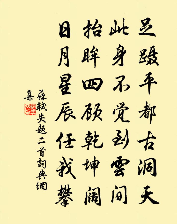 詩詞名句歷史字典書法欣賞書法字典國語詞典說文解字康熙字典古漢語字典標 題 作 者 詩 句 失題二首作者:蘇軾 朝代:宋代失題二首原文足躡平都古洞天,此身不覺到雲間。抬眸四顧乾坤闊,日月星辰任我攀。詩詞問答問:失題二首的作者是誰?答:蘇軾問:失題二首寫於哪個朝代?答:宋代問:蘇軾的名句有哪些?答:蘇軾名句大全蘇軾失題二首書法欣賞失題二首書法作品詩詞推薦夜宿甓社湖呂定〔宋代〕湖光如鏡迥無山,耿耿銀河路可攀。萬象不移天地外,一塵能到水雲間。月明孤嶼森樓閣,夜靜飛仙過佩環。借問湖上鄭獬〔宋代〕湖山只合住真仙,家在鄖溪未有緣。欲把金錢三百萬,萬松嶺上買雲眠。病鶴何若〔宋代〕仙骨珊珊瘦怯風,褵褷晴曬石橋東。丹砂靈圃何緣覓,華表荒城半已空。羽化定教隨子晉,舞衣久不悅羊公。聽他錦石岩某子發〔宋代〕巉巉怪石錦鮮明,不假人為自織成。頻向水晶簾外立,泉聲那更雜溪聲。范丞相堯夫輓詞二首蘇轍〔宋代〕南遷頭已白,北返病初加。君意知無罪,天心許到家。同朝曾忝舊,握手一長嗟。時事紛無已,還應付棣華。清心鏡 贈小李仙馬鈺〔元代〕李宜僧,僧學道。道要玄機,日常尋討。討論得、常淨常清,清心意最好。好降心,心塵掃。掃除淨,自是通明秘檢校金蓋別業周弼〔宋代〕獨棹一溪雲,山回景自分。露花藏岸勢,風葉亂泉紋。短箭催年急,微陽近草曛。斷猿將落木,清夜不堪聞。朝陵地劉克莊〔宋代〕國家諸陵陷河北,盜發寶衣斧陵木。或言陵下往來人,夜聞翁仲草間哭。何年卻遣朝陵官,含桃璀粲登金槃。悲哉句釋惠崇〔宋代〕馬渡冰河闊,雕盤噴日高。次韻奉和給事中吳育〔宋代〕律上陽和雖始煦,罇前人意已生春。濠梁且欲觀魚樂,淮郡何能致鹿馴。為訪心朋獨縱棹,況逢時雋與均茵。別車伏中熱不可過中夜起坐作詩寄五郎陸游〔宋代〕眾星若銀礫,老桂臥海底。中夜熱不解,病叟推枕起。悲蟲號草根,孤螢照野水。樹頭風急生,喘汗真一洗。追憶讀範文正瀟灑桐廬郡詩戲書陸游〔宋代〕桐廬朝暮苦匆匆,瀟灑寧能與昔同。堆案文書生眼黑,入京車馬漲塵紅。逢迎風月麴生事,彈壓江山毛穎功。二子自安仁至豫章途中雜興十九首趙蕃〔宋代〕郡邑貪殘固合誅,釁端繇爾復何如。官軍可怖無輕敵,直恐微軀不足鋤。九懷浙水府高似孫〔宋代〕越山兮青青,江波兮噴薄。萬里兮長風,引驚瀾兮去之。夫君兮以淵為期,水何為兮勞苦。越山兮升雲,江水兮未玉樓春歐陽修〔宋代〕紅條約束瓊肌穩。拍碎香檀催急袞。隴頭嗚咽水聲繁,葉下間關鶯語近。美人才子傳芳信。明月清風傷別恨。未知李寅之招飲同登九江城方回〔宋代〕清湍嚴子灘,僻塢任公寺。荒涼茅屋居,蹇淺石田蒔。危蹤璧偶完,暮景駕已稅。閒門幸常關,奧帙尚多味。南豐道中黃文雷〔宋代〕想見承平日,茲為富庶鄉。門庭存位置,井臼隔垣牆。草市宜區種,空村又夕陽。誰歟真致此,盜賊已天亡。趙將軍歌岑參〔唐代〕九月天山風似刀,城南獵馬縮寒毛。將軍縱博場場勝,賭得單于貂鼠袍。挽陳通直陳宓〔宋代〕一門盛事更誰同,四代班衣八十翁。有子可傳醫國術,在家還著活人功。平陽遺愛千年遠,有道新碑百丈豐。愧我綠衣佚名〔先秦〕綠兮衣兮,綠衣黃里。心之憂矣,曷維其已?(黃里 一作:黃裹)綠兮衣兮,綠衣黃裳。心之憂矣,曷維其亡?名句推薦李杜詩篇萬口傳,至今已覺不新鮮。趙翼《論詩五首》 用國者,得百姓之力者富,得百姓之死者強,得百姓之譽者榮。荀子《荀子·王霸》 自有多情處,明月掛南樓。米芾《水調歌頭·中秋》 不忍登高臨遠,望故鄉渺邈,歸思難收。柳永《八聲甘州·對瀟瀟暮雨灑江天》 主失其神,虎隨其後。主上不知,虎將為狗。韓非及後人《韓非子·揚權》 芳樹籠秦棧,春流繞蜀城。李白《送友人入蜀》 親履艱難者知下情,備經險易者達物偽。范曄《後漢書·列傳·張衡列傳》 竹憐新雨後,山愛夕陽時。錢起《谷口書齋寄楊補闕》 子胥既棄吳江上,屈原終投湘水濱。李白《行路難三首》 不系雕鞍門前柳,玉容寂寞見花羞,冷風兒吹雨黃昏後。喬吉《春閨怨·不系雕鞍門前柳》