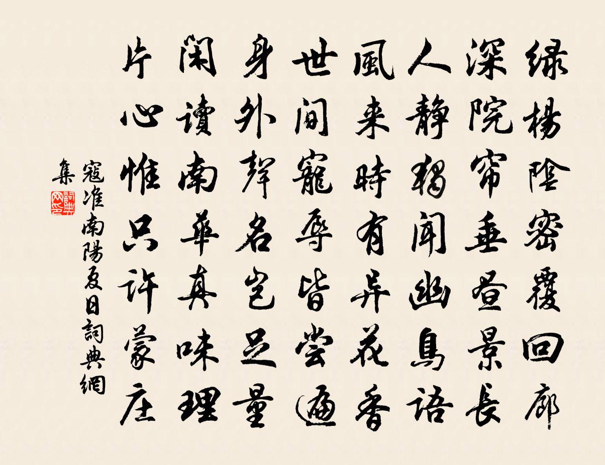 綠楊陰密覆迴廊,深院簾垂晝景長。人靜獨聞幽鳥語,風來時有異花香。