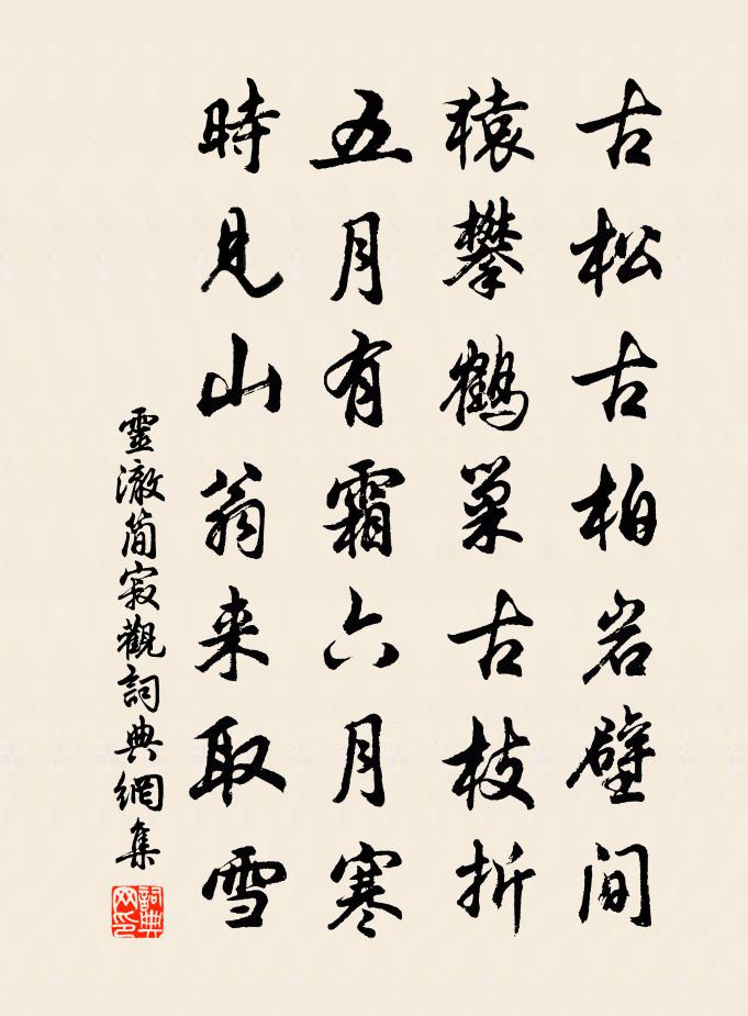 詩詞名句歷史字典書法欣賞書法字典國語詞典說文解字康熙字典古漢語字典標 題 作 者 詩 句 簡寂觀作者:靈澈 朝代:唐代簡寂觀原文古松古柏岩壁間,猿攀鶴巢古枝折。五月有霜六月寒,時見山翁來取雪。詩詞問答問:簡寂觀的作者是誰?答:靈澈問:簡寂觀寫於哪個朝代?答:唐代問:簡寂觀是什麼體裁?答:七古靈澈簡寂觀書法欣賞簡寂觀書法作品注釋全唐詩:卷810-10詩詞推薦頌古十四首雙林入滅釋可湘〔宋代〕覆水難收滿竺峰,如何臨死更摩胸。說無說有成生滅,並付春風一夢中。送薛據宰涉縣(自永樂主簿陟狀,尋複選受此官)劉長卿〔唐代〕故人河山秀,獨立風神異。人許白眉長,天資青雲器。雄辭變文名,高價喧時議。下筆盈萬言,皆合古人意。一從代閨人沈宇〔唐代〕楊柳青青鳥亂吟,春風香靄洞房深。百花簾下朝窺鏡,明月窗前夜理琴。東晉曾極〔宋代〕斷簡殘編跡可尋,諸賢興復不關心。未應全罪王夷甫,一任神州自陸沈。大酺(無射商荷塘小隱)吳文英〔宋代〕峭石帆收,歸期差,林沼年銷紅碧。漁蓑樵笠畔,買佳鄰翻蓋,浣花新宅。地鑿桃陰,天澄藻鏡,聊與漁郎分席。寄子虡陸游〔宋代〕汝官南壽春,我居東會稽;疋馬護秋塞,兩犢翻春泥。淮天沙雁過,江村雪雲低。書來動半年,相望常愴淒。父子連理枝晏殊〔宋代〕玉字秋風至。簾幕生涼氣。朱槿猶開,紅蓮尚拆,芙蓉含蕊。送舊巢歸燕拂高檐,見梧桐葉墜。嘉宴凌晨啟。金鴨挽秦國夫人李流謙〔宋代〕華笄諧淑配,綠髮負平生。桃李春如寄,鷗鷳夢不驚。周婺慚絕識,蜀寡讓孤情。口授天人學,寒窗伴短檠。江城子 嵩山中作元好問〔金代〕眾人皆醉屈原醒。笑劉伶。酒為名。不道劉伶,久矣笑螟蛉。死葬糟丘珠不惡,緣底事,赴清冷。醉鄉千古一昇平讀趙張嵲〔宋代〕赤鳳謾言最可傷,君王不謂有他腸。併疑池上將仙去,只恐留連為侍郎。王德言樞密生日十首曹勛〔宋代〕籍甚家聲孰可儔,玉堂金馬著清修。已攄荷橐三千牘,行相楓宸十二旒。頌古三十九首釋道樞〔宋代〕有禪無師真可笑,大唐國裹何處討。可憐多少路行人,噇卻酒糟隨路倒。送程子方歸蜀仇遠〔宋代〕薄葺田園溧澤邊,鄉心常夢蜀山川。梨花知幾逢寒食,麥飯誰能灑墓田。矍鑠老翁輕客路,扶攜稚子上江船。東還長橋望湖陳著〔宋代〕太湖缺處束為橋,總把吳中景物包。去百里閒山獨立,跨三州地永平交。古亭休說曾垂釣,長劍何妨更斬蛟。欲覓春晴二首郭印〔宋代〕二月垂楊長綠柯,漁村春塢景融和。沙邊細浪搖芳藻,水上紅雲映綠波。風裊釣絲時蕩漾,日移花影更婆娑。徑須集陶句題吳雅翁心遠堂黎廷瑞〔宋代〕居止次城邑,性本愛丘山。曲肱豈易沖,靈府長獨閒。秋菊有佳色,綠酒開芳顏。羲農去我久,千里乃相關。遙遙聽羅道士琴文天祥〔宋代〕斷崖千仞碧,下有寒泉落。道人揮絲桐,清風轉寥廓。飄飄襟袂舉,冰紈不禁薄。紫煙護丹霞,雙舞天外鶴。再次韻四首陳造〔宋代〕尸祝代庖良過矣,即今坐嘯免謿謳。陶朱計食魚萬尾,景{上四下各}有兒牛十頭。甫里過從勞夢寐,輞川歸去忌訪題進士孫秦延福南街居鄭谷〔唐代〕多病久離索,相尋聊解顏。短牆通御水,疏樹出南山。歲月何難老,園林未得還。無門共榮達,孤坐卻如閒。題趙昌父山居八詠已矣軒楊萬里〔宋代〕蠻觸無休日,菟裘有別天。撫松非已矣,釆菊未悠然。名句推薦將不可驕,驕則失禮,失禮則人離,人離則眾判。諸葛亮《將苑·卷一·將驕吝》 鳥下綠蕪秦苑夕,蟬鳴黃葉漢宮秋。許渾《鹹陽城東樓 / 鹹陽城西樓晚眺 / 西門》 濤瀾洶湧,風雲開闔。蘇轍《黃州快哉亭記》 以陽求陰,苞以德也;以陰結陽,施以力也。王詡《鬼谷子·捭闔》 越人語天姥,雲霞明滅或可睹。李白《夢遊天姥吟留別 / 別東魯諸公》 梅子青,梅子黃,菜肥麥熟養蠶忙。祝允明《首夏山中行吟》 言不過行,行不過道戴聖《大戴禮記·文王官人第七十二》 破帽遮顏過鬧市,漏船載酒泛中流。魯迅《自嘲》 偶因一著錯,便為人上人。曹雪芹《紅樓夢·第二回》 不識廬山真面目,只緣身在此山中。蘇軾《題西林壁》