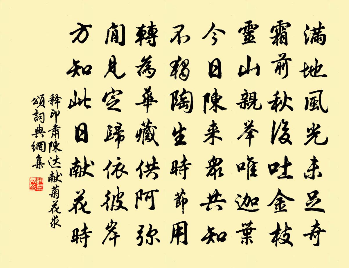 詩詞名句歷史字典書法欣賞書法字典國語詞典說文解字康熙字典古漢語字典標 題 作 者 詩 句 陳達獻菊花求頌作者:釋印肅 朝代:宋代陳達獻菊花求頌原文滿地風光未足奇,霜前秋後吐金枝。靈山親舉唯迦葉,今日陳來眾共知。不獨陶生時節用,轉為華藏供阿彌。閒見定歸依彼岸,方知此日獻花時。詩詞問答問:陳達獻菊花求頌的作者是誰?答:釋印肅問:陳達獻菊花求頌寫於哪個朝代?答:宋代釋印肅陳達獻菊花求頌書法欣賞陳達獻菊花求頌書法作品詩詞推薦江神子侯善淵〔元代〕丹華虛托假形骸。久沈埋。惹非災。冗冗蜉蝣,都被死生催。頓覺悟知亡彼我,任空色,眼中來。海底金烏初出現雪陸游〔宋代〕但苦奇寒惱病翁,豈知上瑞報年豐。一庭不掃待新月,萬壑盡平號斷鴻。繭紙欲書先研凍,羽觴才舉已尊空。若耶挽十一伯奉議四首黃公度〔宋代〕有子皆麟鳳,承家賴一夔。朝班通籍日,綸誥錫封時。堂上蘭羞罷,人間風樹悲。生榮死不朽,猶恨未期頤。清平樂 用前韻,答郭斡卿二首劉敏中〔元代〕松窗竹戶。山氣空濛處。煙柳迷人花滿路。此是中庵舊住。沙鷗久望歸家。歸心已接飛霞。他日乘軒過我,待君繡依韻和郭秘校昭亭山偶作梅堯臣〔宋代〕知君棄官後,江上尋名山。心既慣世內,跡欲還人間。昭亭忽來過,覽古興長嘆。野寺拂塵壁,丹陽已斕斒。殿角寄普明大師可準齊己〔唐代〕蓮岳三征者,論詩舊與君。相留曾幾歲,酬唱有新文。翠竇容閒憩,嵐峰許共分。當年若同訪,合得伴吟雲。減字木蘭花 示眾尹志平〔元代〕年深學道。雖未通靈神氣好。學道年深。萬景叢中無物侵。同流聽勸。薄利虛名深可遠。聽勸同流。放下諸緣宜速愛秋釋文珦〔宋代〕宋玉悲秋我愛秋,清秋行樂勝春遊。林疎盡見山中石,更有寒泉帶石流。龍井李洪〔宋代〕無熱龍宮北道場,人天瞻禮玉毫光。璽書重疊兩朝賜,更助吾皇節雨暘。隴頭吟曹勛〔宋代〕烏落黃雲塞草秋,隴頭之水東西流,水聲嗚咽鳴啾啾。馬聞思舊櫪,人聞思舊丘,年年征戰無時休。無時休,誰能太常引 浴鵠灣有詠寫奉易玄張雨〔元代〕一叢奇石古苔龕。一半浸*藍。有幾許煙嵐。怕魚鳥驚人笑談。幽幽尺宅,蕭蕭環堵,佳處要人參。休看是江南。沁園春劉將孫〔宋代〕流水斷橋,壞壁春風,一曲韋娘。記宰相開元,弄權瘡痏,全家駱谷,追騎倉皇。彩鳳隨鴉,瓊奴失意,可似人間雜詩二十七首曹勛〔宋代〕雲際翻風斷雁斜,城陰盤暮噪棲鴉。春容落景寒猶嫩,望盡遙天數縷霞。和楊同州寒食乾坑會後,聞楊工部欲到,知予白居易〔唐代〕夜飲歸常晚,朝眠起更遲。舉頭中酒後,引手索茶時。拂枕青長袖,欹簪白接蘺。宿酲無興味,先是肺神知。蔡州任氏閱世堂蘇轍〔宋代〕朱君長桐鄉,死食桐鄉社。吏民安君德,君亦愛其下。遺言於斯葬,存沒勿相舍。自知得民深,千歲誰似者。任君病目袁燮〔宋代〕年年苦目眚,過午眊不明。冶之昏轉甚,不治無由平。何如閉目坐,湛然萬慮清。非治非不治,無思亦無營。不勞飲校理盛居中家次韻二首二晁補之〔宋代〕一倒南齋玉宇醇,絕勝不醉楚江濱。驪駒且莫催歸御,鴝鵒何妨屬坐賓。我尚少年新白髮,君須痛飲敵青春。未愁八陣磧孫應時〔宋代〕江近瞿唐急,沙從魚腹磺。千秋應有恨,八陳竟難平。望斷青煙晚,愁邊白鳥明。身微定何補,且復老躬耕。歸侍丘葵〔宋代〕村莊一罇酒,誰與語悲辛。衿佩空相負,詩書不救貧。天寒負米客,日暮倚門人。遙睇長江水,西風猶愴神。繡觀音章甫〔宋代〕蜀人多巧思,組繡用功深。生綃三尺余,成此觀世音。慈悲歡喜容,如出旃檀林。蓮花隨步武,纓絡縵衣襟。手中名句推薦一時寵利有盡,千秋青史難欺。張廷玉《明史·列傳·卷一百三十三》 強整繡衾,獨掩朱扉,枕簟為誰鋪設。阮逸女《花心動·春詞》 滯雨通宵又徹明,百憂如草雨中生。薛逢《長安夜雨》 疏雨池塘見,微風襟袖知。賀鑄《南歌子·疏雨池塘見》 不食人間煙火。袁枚《隨園詩話·補遺 卷九》 燕雀安知鴻鵠之志。司馬遷《史記·陳涉世家》 父兄有惡行,子弟學之則無不肖王永彬《圍爐夜話·第三三則》 棘枝風哭酸,桐葉霜顏高。孟郊《秋懷十五首》 示上以足,示下以惠,怨自削減。來俊臣《羅織經·固榮卷第六》 望廬思其人,入室想所歷。潘安《悼亡詩三首》
