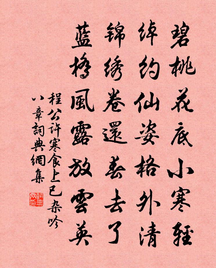 詩詞名句歷史字典書法欣賞書法字典國語詞典說文解字康熙字典古漢語字典標 題 作 者 詩 句 寒食上已雜吟八章作者:程公許 朝代:宋代寒食上已雜吟八章原文碧桃花底小寒輕,綽約仙姿格外清。錦繡卷還春去了,藍橋風露放雲英。詩詞問答問:寒食上已雜吟八章的作者是誰?答:程公許問:寒食上已雜吟八章寫於哪個朝代?答:宋代程公許寒食上已雜吟八章書法欣賞寒食上已雜吟八章書法作品詩詞推薦飯牛歌蒲壽宬〔宋代〕新秧插遍水盈疇,童穉相呼去飯牛。極目平坡菸草細,歌聲何處雨颼颼。黃魯直催繡詞帖贊岳珂〔宋代〕詞以寓意,何適非理。遊戲翰墨,亦或張弛。此篇所傳,觀蠟之比。樂而不淫,庶幾在此。贈施都正三首陳造〔宋代〕欲觀芸芸初,當求根極地。古今貉一丘,貴賤魚千里。纖雲翳太空,玄珠在深水。安得數年閒,與師商榷此。下水船黃庭堅〔宋代〕總領神仙侶。齊到青雲歧路。丹禁風微,咫尺諦聞天語。盡榮遇。看即如龍變化,一擲靈梭風雨。真游處。上苑尋和沈德遠寄江鰩韻袁說友〔宋代〕粉身截玉慰渠貪,浪跡泥塗遽著籃。坐缺江生嗟不樂,詩來東老謝分甘。世間風味鄞江頰,傳里形容太史談。欲報送湖南盧提刑赴召三首項安世〔宋代〕幸甚他鄉識老誠,孰知真意徹幽明。通身實地無奇巧,接面春風有至情。王事直須窮晝夜,宦途元不計公卿。無端雜歌謠辭雞鳴曲王建〔唐代〕雞初鳴,明星照東屋;雞再鳴,紅霞生海腹。百官待漏雙闕前,聖人亦掛山龍服。寶釵命婦燈下起,環珮玲瓏曉光和襲美醉中即席贈潤卿博士次韻陸龜蒙〔唐代〕共是虛皇簡上仙,清詞如羽欲飄然。登山凡著幾緉屐,破浪欲乘千里船。遠夢只留丹井畔,閒吟多在酒旗前。誰知餞魏州判鵬舉邵桂子〔宋代〕松下吟喔幾唱酬,卻攜螃蟹餞監州。穩挑書擔去環碧,頻寄詩筒來雪舟。畢姓弟兄千里月,故山泉石一天秋。葛峰中秋後一夕登清心閣二首楊萬里〔宋代〕昨夜云為崇,今霄月始妍。如何一日隔,便減半分圓?影里偏宜竹,光中不剩天。客來休遣去,我醉正無眠。沒安碑曾極〔宋代〕漫漫荒池浸綠蕪,殘碑一丈載龜趺。當年刻畫書勛閥,雨打風吹字已無。八月二十八日與潘少白劉君曲草酌耕養堂時劉舒岳祥〔宋代〕二子論秋夜,秋蛩是四隣。葉黃狐下隴,燈暗鼠欺人。借譽門多客,臨危俗少親。平生劉正仲,於此見情真。二月初山上作晁說之〔宋代〕與春相別雲一歲,遼鶴有恨不足加。意韻寂寥莫我適,起逐春風山逕斜。春風自與時窈窕,豈為來開桃李花。不然試院即事呈諸公張耒〔宋代〕天街落日走鳴珂,咫尺衡門不許過。催去據鞍猶鶴望,爭觀夾道已雲羅。奏篇定有凌雲賦,招隱今無扣角歌。最苦小孤山童潮〔宋代〕長江萬里來,一砥中流峙。巨浸沒根深,孤峰插漢起。倒回三峽流,獨據九江水。真是海門關,波濤險莫比。蜻蜓王鎡〔宋代〕輕綃剪翅約秋霜,點水低飛戀野塘。忽趁游蜂過牆去,可憐不識百花香。詠史上審配陳普〔宋代〕獨擁殘兵守鄴城,佇儒袁尚去擒兄。一時天地方翻覆,安把人倫罪審榮。水調歌頭(趙帥生日)趙善括〔宋代〕形勝視京兆,警蹕駐錢塘。光前詔後彈壓,誰數漢張王。幾百萬家和氣,五十餘年創見,天下一循良。有口皆歌頌採蓮子張耒〔宋代〕菡萏香蓮十頃陂,小姑貪戲採蓮池。晚來弄水船頭濕,更脫新裙裹鴨兒。玉照堂觀梅二首張鎡〔宋代〕未辦當春句法工,坐來花下泥春風。山高水遠須人領,玉潔珠光喜日烘。越女信知天下白,屈平那是澤邊窮。明朝名句推薦人世幾回傷往事,山形依舊枕寒流。劉禹錫《西塞山懷古》 君子不以言舉人,不以人廢言。孔子弟子《論語·衛靈公篇》 七國三邊未到憂,十三身襲富平侯李商隱《富平少侯》 愁里高歌梁父吟,猶如金玉戛商音。鄭思肖《二礪》 日中則昃,月盈則食佚名《易傳·彖傳下·豐》 春去秋來也,愁心似醉醺。歐陽炯《巫山一段雲·春去秋來也》 人怕三見面,樹怕一墨線。佚名《增廣賢文·下集》 憶共錦衾無半縫,郎似桐花,妾似桐花鳳。王士禎《蝶戀花·和漱玉詞》 復值接輿醉,狂歌五柳前。王維《輞川閒居贈裴秀才迪》 長楊跨武騎,細柳接戎軒。鄭愔《奉和幸望 * 送朔方大總管張仁亶》