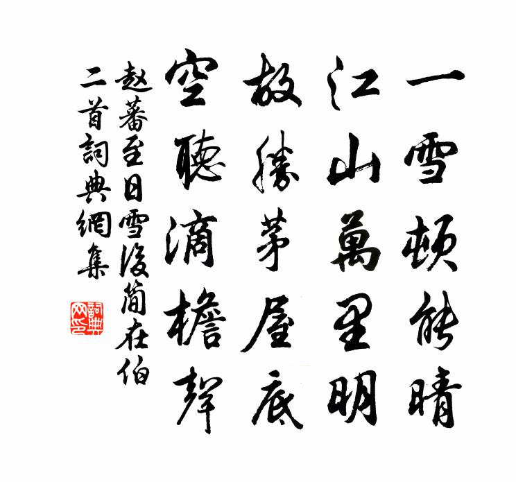 詩詞名句歷史字典書法欣賞書法字典國語詞典說文解字康熙字典古漢語字典標 題 作 者 詩 句 至日雪後簡在伯二首作者:趙蕃 朝代:宋代至日雪後簡在伯二首原文一雪頓能晴,江山萬里明。故勝茅屋底,空聽滴檐聲。詩詞問答問:至日雪後簡在伯二首的作者是誰?答:趙蕃問:至日雪後簡在伯二首寫於哪個朝代?答:宋代趙蕃至日雪後簡在伯二首書法欣賞至日雪後簡在伯二首書法作品詩詞推薦送瑞蓮新米白酒與韓監倉陳造〔宋代〕珍珠滴紅敵紫腴,君家寶此如珍珠。我家玉友亦勝友,論交遣到君座隅。秋蓮結實甘勝蜜,香粳薦新玉為爛。遙知偈頌十二首釋原妙〔宋代〕臘月三十日,時節看看至。露柱與燈籠,休更打瞌睡。覿面當機提,當機覿面覷。驀然觸瞎眼睛。照顧爛泥里有刺淳熙十二年加上太上皇帝太上皇后尊號十一首佚名〔宋代〕聖明太上,天子有尊。玉坐高拱,慈顏睟溫。震禁嘉承,朝弁昈分。盛禮縟典,邃古未聞。和丹岩衛宗武〔宋代〕芳事從今鼎鼎來。看看花片撲樓台。一和既盎寒如掃,錦繡香中圖畫開。宮詞張公庠〔宋代〕西苑池台駕幸時,內家朱轂盡陪隨。滿宮學士多題詠,不減詞臣應制詩。十七字詩佚名〔宋代〕駕幸景靈宮,諸生盡鞠躬。頭烏身上白,米蟲。龍門下作白居易〔唐代〕龍門澗下濯塵纓,擬作閒人過此生。筋力不將諸處用,登山臨水詠詩行。寄外用前韻龍輔〔宋代〕未得相攜約尚空,小箋一見一忡忡。妾意原非淥江水,無端只向畫橋東。次韻文殊五言劉子翬〔宋代〕小雨貽新句,端如印印泥。凝眸方過鳥,倚杖忽橫溪。老態猶堪強,真豪已覺低。鐘聲隔林寺,慚愧有幽棲。雙調撥不斷馬致遠〔元代〕嘆寒儒,謾讀書,讀書須索題橋柱。題柱雖乘駟馬車,乘車誰買《長門賦》?且看了長安回去!興龍節集英殿宴教坊詞致語口號臣聞天所眷命蘇軾〔宋代〕風捲雲舒合兩班,曈曈瑞日映天顏。觀書已獲千秋鏡,積德長為萬歲山。臘雪未消三務起,壬人不用五兵閒。相逢又和松碧軒三絕胡寅〔宋代〕聞說鋤耰手自持,力耕初不原天知。卻防有客攜壺到,杞菊應添一兩畦。次韻子瞻山村五絕蘇轍〔宋代〕塍間白水細無聲,日暖泥融草不生。似恐田家忘帝力,多差使者出催耕。太后閣春帖子趙湘〔唐代〕正閫成王化,開宮奉母儀。身當四海養,壽祝萬年期。偈頌七十六首釋師觀〔宋代〕邂語非乾舌,能言不是聲。剎剎塵塵爾,何處著渾身。觀音泉徐集孫〔宋代〕岩石留雲裛翠煙,古松知歷幾千年。淨瓶一滴楊枝水,涌作岩前大士泉。送前進士蔡京赴學究科(時崔相公、楊尚書掌選)劉禹錫〔唐代〕耳聞戰鼓帶經鋤,振發聲名自里閭。已是世間能賦客,更攻窗下絕編書。朱門達者誰能識,絳帳書生盡不如。幸遇贈西山磊泉庵僧周自中〔宋代〕門掩古崖碧,霜欺苔逕斑。去城無一里,此地若深山。留客吟松下,驅泉過竹間。羨師無外事,相伴白雲間。子先宗友試蘭省送以小詩李昴英〔宋代〕毫端五色織成章,皎皎清標月照梁。再戰文場推定霸,一經書法首尊王。鞭揚瘐嶺梅花早,梯上寒宮桂籍香。師道泥行終日至晡始抵中橋六絕岳珂〔宋代〕到得中橋一徑斜,岸傍沽酒兩三家。長年醉臥桑陰下,鼓吹猶煩兩岸蛙。名句推薦梅花大庾嶺頭髮,柳絮章台街里飛。李商隱《對雪二首》 越梅半拆輕寒里,冰清淡薄籠藍水。和凝《菩薩蠻·越梅半拆輕寒里》 萬事不由人做主,一心難與命爭衡。羅貫中《三國演義·第一百十三回》 冰肌玉骨,自清涼無汗。蘇軾《洞仙歌·冰肌玉骨》 十二樓中盡曉妝,望仙樓上望君王。薛逢《宮詞》 長江千里,煙淡水雲闊。李綱《六么令·次韻和賀方回金陵懷古鄱陽席上作》 龍吟虎嘯一時發,萬籟百泉相與秋李頎《聽安萬善吹觱篥歌》 為問暗香閒艷,也相思、萬點付啼痕魯逸仲《南浦·旅懷》 遊人記得承平事,暗喜風光似昔年。韋莊《長安清明》 漢水東流,都洗盡、髭鬍膏血。辛棄疾《滿江紅·漢水東流》