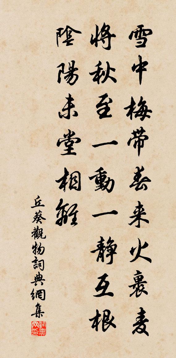 詩詞名句歷史字典書法欣賞書法字典國語詞典說文解字康熙字典古漢語字典標 題 作 者 詩 句 觀物作者:丘葵 朝代:宋代觀物原文雪中梅帶春來,火裹麥將秋至。一動一靜互根,陰陽未堂相離。詩詞問答問:觀物的作者是誰?答:丘葵問:觀物寫於哪個朝代?答:宋代丘葵觀物書法欣賞觀物書法作品詩詞推薦江神子 進道王處一〔元代〕神光涌涌透穹蒼。湊靈陽。悟真常。般運三車,都會聚明堂。撞過天門歸紫府,無衰老,免危亡。寄身浮世效風狂仲夏張耒〔宋代〕雲間趙盾益可畏,淵底武侯方熟眠。若無一雨為施澤,直恐三伏便欲然。算商酤酒有底急,束帶坐曹真欲顛。平生蝶戀花 聚骨扇完顏璟〔元代〕幾股湘江龍骨瘦。巧樣翻騰,疊作湘波皺。金縷小鈿花草門。翠條更結同心扣。金殿珠簾間永畫。一握清風,暫喜長句謝陳適用惠送吳南雄所贈紙黃庭堅〔宋代〕廬陵政事無全牛,恐是漢時陳太丘。書記姓名不肯學,得紙無異夏得裘。琢詩包紙送贈我,自狀明月非暗投。詩句視旱過雨楊萬里〔宋代〕巳旱何秋雨,無禾始水聲。病民豈天意,致此定誰生。湯爪寧須翦,桑羊可緩烹。小儒空自嘆,得到鳳凰城。王德言樞密生日十首曹勛〔宋代〕友於相愛陟通津,同氣同居善益親。自是茅家好兄弟,一堂和樂棣華春。次韻王司理二首項安世〔宋代〕對敵何曾挫一毫,避人堪笑卻成逃。莫思蓬戶飛三箭,且向椿闈帶兩髦。年少枉隨流水去,老來方悟入山高。兒童塞上傷戰士杜荀鶴〔唐代〕戰士說辛勤,書生不忍聞。三邊遠天子,一命信將軍。野火燒人骨,陰風卷陣雲。其如禁城裡,何以重要勛。李文山讀書堂史堯弼〔宋代〕堂上中聖賢,心醉百不理。堂下笑糟粕,未知其趣爾。送張中丞入台從事李德裕〔唐代〕驛騎朝天去,江城眷闕深。夜珠先去握,芳桂乍辭陰。澤國三千里,羈孤萬感心。自嗟文廢久,此曲為盧諶。堂下梅一枝開遲而花極小疑地勢使然感嘆而作趙蕃〔宋代〕梅發無衰盛,根生有瘠腴。都緣托地薄,故使著花癯。渺小吾憐爾,伶仃爾念吾。詎須詩欠興,何用竹相娛。文獻太子輓歌辭五首徐鉉〔唐代〕出處成交讓,經綸有大功。淚碑瓜步北,棠樹蒜山東。百揆方時敘,重離遂不融。故臣偏感咽,曾是嘆無三窮。採蓮秦觀〔宋代〕若耶溪邊天氣秋,採蓮女兒溪岸頭。笑隔荷花共人語,煙波渺渺盪輕舟。數聲水調紅嬌晚,棹轉舟回笑人遠。腸斷杜重威引俚語佚名〔唐代〕逢賊得命,更望復子。太平州十詠亭李覯〔宋代〕客游無日暫開顏,姑孰溪邊偶得閒。風景直疑圖畫出,古今都似夢魂間。恆溫罪逆休重問,謝傳英靈已不遠。深美開書篋見韓無咎書有感陸游〔宋代〕老覺人間萬事非,幽棲幸已脫塵鞿。殘年得飽不啻足,舊友半空誰與歸?開眼不妨成一夢,翦翎何至羨群飛。龍圖花時遍游諸家園陸游〔宋代〕花陰掃地置清尊,爛醉歸時夜已分。欲睡未成欹倦枕,輪囷帳底見紅雲。和樂天耳順吟兼寄敦詩劉禹錫〔唐代〕吟君新什慰蹉跎,屈指同登耳順科。鄧禹功成三紀事,孔融書就八年多。已經將相誰能爾,拋卻丞郎爭奈何。獨恨陳伯量輓詩二乎曹彥約〔宋代〕朴茂開城府,師資足楷模。官卑雖晚境,子仕卻亨途。不酒陳驚座,無金疏大夫。何人碑有道,老手看慈湖。頌古四十四首釋師範〔宋代〕洞山平地露屍骸,庵主將身一處埋。狼藉髑髏相枕藉,悲風愁霧不勝懷。名句推薦洞庭春溜滿,平湖錦帆張。陰鏗《渡青草湖》 萬物靜觀皆自得,四時佳興與人同。程顥《秋日》 雁聲吹過黃昏雨,籬邊月圓萋緊端木國瑚《齊天樂·菊影(雁聲吹過黃昏雨)》 林花掃更落,徑草踏還生。孟浩然《春中喜王九相尋 / 晚春》 楊柳回塘,鴛鴦別浦。綠萍漲斷蓮舟路。賀鑄《芳心苦·楊柳回塘》 朱門酒肉臭,路有凍死骨。杜甫《自京赴奉先縣詠懷五百字 / 自京赴奉先詠懷五百字》 獨行獨坐,獨唱獨酬還獨臥。朱淑真《減字木蘭花·春怨》 苕之華,其葉青青。佚名《苕之華》 竹喧歸浣女,蓮動下漁舟。王維《山居秋暝》 天清一雁遠,海闊孤帆遲。李白《送張舍人之江東》