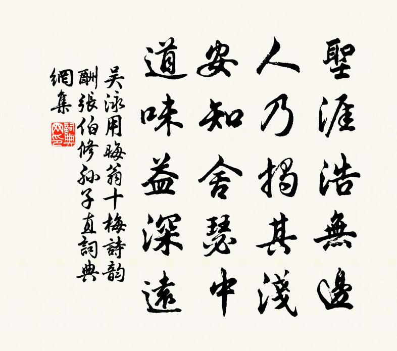 詩詞名句歷史字典書法欣賞書法字典國語詞典說文解字康熙字典古漢語字典標 題 作 者 詩 句 用晦翁十梅詩韻酬張伯修孫子直作者:吳泳 朝代:宋代原文聖涯浩無邊,人乃揭其淺。安知舍瑟中,道味益深遠。詩詞問答問:《用晦翁十梅詩韻酬張伯修孫子直》的作者是誰?答:吳泳問:該詩寫於哪個朝代?答:宋代書法欣賞用晦翁十梅詩韻酬張伯修孫子直書法作品詩詞推薦讀史陸游〔宋代〕夜對遺編嘆復驚,古來成敗浩縱橫。功名多向窮中立,禍患常從巧處生。萬里關河歸夢想,千年王霸等棋枰。人間爭讓吟邵雍〔宋代〕有讓豈無爭,無沿安有革。爭讓起於心,沿革生於跡。義軒讓以道,堯舜讓以德。湯武爭以功,桓文爭以力。荊門別張天覺魏泰〔宋代〕秋風十驛望台星,想見冰壺照座清。零雨已回公旦駕,挽須聊聽野王箏。三朝元老公方壯,四海蒼生耳已傾。白髮自諸暨抵剡潘閬〔宋代〕秋渚涵空碧,秋山刷眼青。排頭煙樹老,撲面水風醒。上瀨復下瀨,長亭仍短亭。夜船明月好,客夢滿流螢。箏張祜〔唐代〕綽綽下雲煙,微收皓腕鮮。夜風生碧柱,春水咽紅弦。翠佩輕猶觸,鶯枝澀未遷。芳音何更妙,清月共嬋娟。溪行陸游〔宋代〕疏鍾度莽蒼,遠火耿微茫。歲暮水歸壑,夜寒天霣霜。人生一蟲臂,世路幾羊腸?老大忘繩檢,狂歌盡意長。次韻司徒富公耆年會詩蘇頌〔宋代〕古人稱宴安,居處必擇地。諸公來河南,有若不期會。岩岩大司徒,早辭槐鼎貴。嘉謨納淵衷,故事留台寺。構第寄題薛象先新樓陳傅良〔宋代〕短檐風雨送蝸牛,有客來夸百尺樓。闔郡台池皆下瞰,背城湖海亦全收。清時未放徒高臥,半世何為故倦遊。解盡挾文薛君自賦五首克己讀書安貧擇交訓子為題程公許〔宋代〕靜得山林趣,間知日月長。肖風披竹素,小雨潤芸香。外飾謝文繡,飢餐須稻粱。人生有同嗜,只此絕難忘。次韻毛國鎮趙景仁唱和三首一贈毛一贈趙一自蘇轍〔宋代〕遠謫江湖舳尾銜,到來辛苦向誰談。畏人野鶴長衣嶺,厭事山僧只住庵。黃雀頓來成一飽,白醪新熟喜初酣。疏頑洛陽城外別皇甫(氵是)李賀〔唐代〕洛陽吹別風,龍門起斷煙。冬樹束生澀,晚紫凝華天。單身野霜上,疲馬飛蓬間。憑軒一雙淚,奉墜綠衣前。故鄉龍昌期〔宋代〕榿木慚桑低別壤,芋苗護稻遠分行。上書莫道便他郡,學稼終宜老故鄉。浣沙溪(九日)汪莘〔宋代〕青女催人兩鬢霜,自篘白酒作重陽。方壺老子莫淒涼。天地兩三胡蝶夢,古今多少菊花香。只將破帽送秋光。別詩二首·其一范雲〔南北朝〕洛陽城東西,長作經時別。昔去雪如花,今來花似雪。送趙添戎還漳州曹勛〔宋代〕北風號枯葉,漠漠天正寒。弛擔逆旅中,方稅遊子鞍。吾甥遽相訪,別久心萬端。意定話親舊,或悲或可歡。乃將光皇祐二年謁告歸鄉晨至治平二上方得再來愴司馬光〔宋代〕十六載重歸,順塗歌式微。青公弊廬在,白首故人稀。外飾服章改,流光顏貌非。巫鹹舊山色,相見尚依依。延壽寺僧小軒極蕭灑予為名曰林樂取莊生所謂黃庭堅〔宋代〕積雨床靈香潤,床晚風紅藥翻。盥手散經帙,烹床洗睡昏。野僧甚淳古,養拙賁邱園。風懷交四境,蓬藋底百椽。題仙遊寺朱慶餘〔唐代〕石抱龍堂蘚石乾,山遮白日寺門寒。長松瀑布饒奇狀,曾有仙人駐鶴看。范參政自建康得資政宮祠六詩寄呈趙蕃〔宋代〕一再將書托置郵,渺然殊未亦湛浮。平生願識才能見,別去於今歲又周。頌十玄談演教釋印肅〔宋代〕真淨界中才一念,未離學地終須欠。今生努力絕名言,永劫不遭塵垢垢。名句推薦昔日橫波目,今成流淚泉。李白《長相思三首·其二》 理直千人必往,心虧寸步難移。馮夢龍《醒世恆言·卷十六》 桂棹兮蘭枻,斵冰兮積雪;屈原《九歌》 故人江海別,幾度隔山川。司空曙《雲陽館與韓紳宿別》 遺民忍死望恢復,幾處今宵垂淚痕。陸游《關山月》 千虛不如一實。馮夢龍《警世通言·卷三》 花意爭春,先出歲寒枝。辛棄疾《江神子·賦梅寄余叔良》 亂花漸欲迷人眼,淺草才能沒馬蹄。白居易《錢塘湖春行》 以近知遠,以一知萬,以微知明。荀子《荀子·非相》 風住塵香花已盡,日晚倦梳頭。李清照《武陵春·春晚》