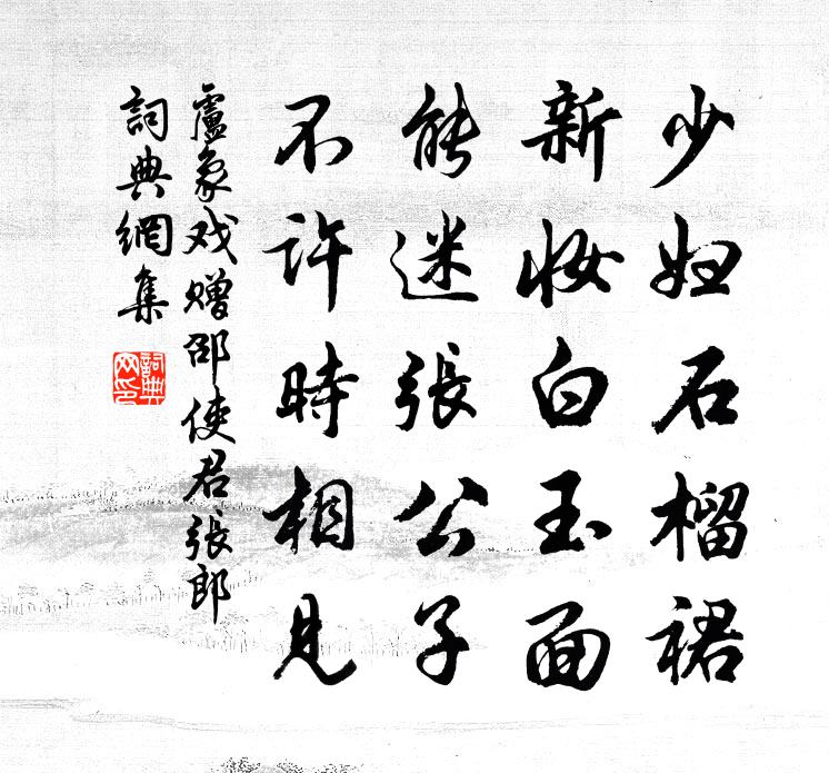 詩詞名句歷史字典書法欣賞書法字典國語詞典說文解字康熙字典古漢語字典標 題 作 者 詩 句 戲贈邵使君張郎作者:盧象 朝代:唐代戲贈邵使君張郎原文少婦石榴裙,新妝白玉面。能迷張公子,不許時相見。詩詞問答問:戲贈邵使君張郎的作者是誰?答:盧象問:戲贈邵使君張郎寫於哪個朝代?答:唐代問:戲贈邵使君張郎是什麼體裁?答:五絕盧象戲贈邵使君張郎書法欣賞戲贈邵使君張郎書法作品注釋全唐詩:卷122_18詩詞推薦金玉吟邵雍〔宋代〕聖在人中山,心從行上修。金於砂里得,玉向石中求。偈頌六十五首釋普濟〔宋代〕鐘鼓聲喧喧,鳥譽鬧中庭。圓通門不鑰,眉毛落又生。黃尉挽章二首陳造〔宋代〕落筆心猶壯,論年鬢未斑。硯捐初鑄鐵,澤失善藏山。談麈那容數,靈輀去莫攀。松阡縈望眼,衰淚可勝潸。題諶氏奉先亭曾豐〔宋代〕大協龜{左冉右龜}兆,新成馬鬣封。雨餘生亂草,霜後拱孤松。泣酹春秋酒,顰撞日暮鍾。若無翁仲在,誰鑒答丁酉皿月十日之官毗陵,舟行阻風,宿椆陂江楊萬里〔宋代〕蟲聲兩岸不堪聞,把燭銷愁且一尊。誰宿此船愁似我?船篷猶帶燭煙痕。寄老溪上人蒲壽宬〔宋代〕已知山是石,掛起碧筇條。家在黃梅樹,門當獨木橋。寡交因犬惡,默坐聽蟬調。同道何時過,心慵不見招。次韻趙帥四首陳造〔宋代〕我亦飽參僧,贏糧走百城。諸公傳句法,夫子擅詩聲。知笑屠龍誤,時須畫鶩成。峨肩出苦語,蛩夜共淒清。征西大將軍京陵王公會射堂皇太子見命作此詩陸雲〔魏晉〕祝融御節。火正緝熙。凱風徘徊。萬物欣時。秩秩初筵。薄言在茲。嘉福介祜。萬壽無期。夏暑正隆望秋得雨風賦長句釋文珦〔宋代〕夏日烈烈揚暉光,陽氣入土土力強。望秋三日雨滂滂,庶物浡然俱阜昌。雨暘時若異咎恆,秔稻薿薿如人長。西風妙智寺陳白〔宋代〕八重峰頂望群山,百穀東流去不還。惟有右軍遺蹟在,月波時落墨池間。玉樓春黃簡〔宋代〕龜紋曉扇堆雲母。日上彩闌新過雨。眉心猶帶寶觥酲,耳性已通銀字譜。密奩彩索看看午。暈素分紅能幾許。妝成薊丘覽古贈盧居士藏用之六 鄒衍陳子昂〔唐代〕大運淪三代。天人罕有窺。鄒子何寥廓。漫說九瀛垂。興亡已千載。今也則無推。吳李制屬同寓富池雙泉寺畏寒索飲因寫真愫董嗣杲〔宋代〕秋扇已棄物,寒衣還催裝。偃息覺寒侵,客況入渺茫。宿疢不時作,難恃筋力強。畏熱亦畏寒,北固人之常。今此次林子長教授韻陳造〔宋代〕伯主或能尊九九,餓錄恐復辦多多。盤姍勃窣不快意,鉛刀一割君謂何。初侍講筵有感上呈經筵諸公宋祁〔宋代〕邇英何幸奉經筵,俗狀婆娑艾服年。蘭葉初窺圖上字,奎鉤乍識禁中天。坐憑重席慚清問,能讀三墳賴眾賢。猶藉水調歌頭(壽趙倅)姚勉〔宋代〕微雪弄新霽,寒月上初弦。長庚入夢,間生採石錦袍仙。分得天孫雲織,掣斷麒麟金鎖,來自玉皇前。丹井憑泥軾題吳氏四賢堂羅鑒〔宋代〕河汾續經罷,洙泗還清風。深衣在帶垂,身退道則豐。一編通言在,萬古無盲聾。遺像今偉然,吾敬環溪公。大衍易吟四十首方回〔宋代〕謙卑六位得,豫樂四爻非。莊敬與安肆,冥冥禍福幾。上巳日久病不出示兒侄二首蘇轍〔宋代〕春氣侵脾久在床,開門桃李著泥香。牛鳴頗覺西湖近,鳳去長憐北榭荒。欲出老人無伴侶,退歸諸子解農桑。南鄰酬程嘉定楊漢州見和三首洪咨夔〔宋代〕六州鐵鑄錯,四海金為甌。興亡幾變滅,明月長清秋。憶從黨禍起,中原墮旄頭。月行九霄上,安知下民愁。年來名句推薦著葉滿枝翠羽蓋,開花無數黃金錢杜甫《秋雨嘆三首》 雨落不上天,水覆難再收。李白《妾薄命》 毀譽從來不可聽,是非終久自分明。馮夢龍《警世通言·卷四》 其日,有雨不採,晴有雲不採;晴,采之、蒸之、搗之、焙之、穿之、封之、茶之乾矣。陸羽《茶經·三之造》 柳帶搖風漢水濱,平蕪兩岸爭勻。牛希濟《臨江仙·柳帶搖風漢水濱》 中年親友難別,絲竹緩離愁。蘇軾《水調歌頭·安石在東海》 嘆江山如故,千村寥落。岳飛《滿江紅·登黃鶴樓有感》 小雨濕黃昏。重午佳辰獨掩門。李之儀《南鄉子·端午》 下馬飲君酒,問君何所之?王維《送別》 多才之士,才儲八斗;博學之德,學富五車。程登吉《幼學瓊林·卷四·文事》