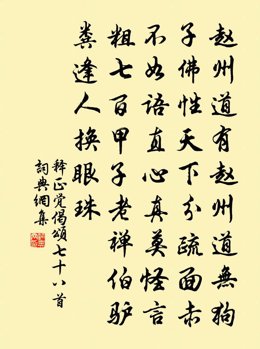 詩詞名句歷史字典書法欣賞書法字典國語詞典說文解字康熙字典古漢語字典標 題 作 者 詩 句 偈頌七十八首作者:釋正覺 朝代:宋代偈頌七十八首原文趙州道有,趙州道無。狗子佛性,天下分疏。面赤不如語直,心真莫怪言粗。七百甲子老禪伯,驢糞逢人換眼珠。詩詞問答問:偈頌七十八首的作者是誰?答:釋正覺問:偈頌七十八首寫於哪個朝代?答:宋代釋正覺偈頌七十八首書法欣賞偈頌七十八首書法作品詩詞推薦筇杖葛慶龍〔宋代〕白髮慵巾短短衣,閒行斜倚小筇枝。自家弄影猶痴絕,只似初騎竹馬時。城南尋梅得句四首陸游〔宋代〕老子今年嬾賦詩,風光料理鬢成絲。青羊宮裡春來早,初見梅花第一枝。太上皇帝合端午帖子詞汪應辰〔宋代〕漏轉銅壺永,風來玉殿清。天申佳節近,比屋盡歡聲。百舌鳥二首無則〔唐代〕千愁萬恨過花時,似向春風怨別離。若使眾禽俱解語,一生懷抱有誰知。長截鄰雞叫五更,數般名字百般聲。饒伊偈頌二十三首釋雲岫〔宋代〕盪儘是非窠窟,截斷葛藤露布。今日放開布袋,不要東去西去。拗折拄杖,向者裹住。碧眼胡僧坐九年,心膽渾如游溫陵得未得之士四人作四愛詩贈茂功茂叔王邁〔宋代〕吾愛清源徐茂功,聲名捷出日方樂。高尻一首紛餘子,屈指論心幾鉅公。我定斯文宜館閣,人言科目滯英雄。直須秋館言懷錢起〔唐代〕蟋蟀已秋思,蕙蘭仍碧滋。蹉跎獻賦客,嘆息此良時。日夕雲台下,商歌空自悲。次韻知縣兄夏夜古調蘇泂〔宋代〕非禽胡能飛,羽翰上青霄。非木胡能花,開謝隨驚飈。始予眷所生,於世免塵囂。頗知師寧蘧,貧樂富無驕。異哉樵隱釋紹曇〔宋代〕斫得塊柴擔不起,和雲颺下枕頭邊。夢魂不涉人間世,肯把黃梅破缽傳。留別賈舍人至二首李白〔唐代〕大梁白雲起,飄颻來南洲。裴回蒼梧野,十見羅浮秋。鰲抃山海傾,四溟揚洪流。意欲託孤鳳,從之摩天游。鳳苦普天樂·垂虹夜月徐再思〔元代〕玉華寒,冰壺凍。雲間玉兔,水面蒼龍。酒一樽,琴三弄。喚起凌波仙人夢,倚闌乾滿面天風。樓台遠近,乾坤表奉和襲美贈魏處士五貺詩太湖硯陸龜蒙〔唐代〕誰截小秋灘,閒窺四緒寬。繞為千嶂遠,深置一潭寒。坐久雲應出,詩成墨未乾。不知新博物,何處擬重刊。孟東野失子韓愈〔唐代〕失子將何尤,吾將上尤天。女實主下人,與奪一何偏。彼於女何有,乃令蕃且延。此獨何罪辜,生死旬日間。上呼句釋智仁〔宋代〕路遙無去伴,山疊有啼猿。和胡戢七首晁補之〔宋代〕相逢樽酒未辭深,握手盱眙十載心。車馬淒涼人夜別,出門落月與橫參。宮人斜絕句權德輿〔唐代〕一路斜分古驛前,陰風切切晦秋煙。鉛華新舊共冥寞,日暮愁鴟飛野田。一剪梅·漠漠春陰酒半佚名〔宋代〕漠漠春陰酒半酣。風透春衫,雨透春衫。人家蠶事欲眠三。桑滿筐籃,柘滿筐籃。先自離懷百不堪。檣燕呢喃,梁小三侄遠持兄嫂之命見訪於荒寒寂寞中將歸二曹勛〔宋代〕不見小阮久,相看情甚溫。肯來成宅相,端可大吾門。暖日長江路,梅花細雨村。真成好兄弟,言謝鄧忘言。題黃元靜廣先樓王炎〔宋代〕聞道樓居好,翬飛百尺余。箕裘能襲舊,丹雘遂如初。生理萬鍾粟,義方千卷書。家聲將益大,車馬炫門閭。再用粹中韻各賦牡丹梅花二首李彌遜〔宋代〕寒花入眼亂紛紛,高臥袁安雪塞門。春透交枝才照座,風搖斷萼已飄村。返魂香細寧辭折,自暖杯深不待溫。為約名句推薦大凡物不得其平則鳴韓愈《送孟東野序》 秋風蕭瑟天氣涼,草木搖落露為霜,群燕辭歸鵠南翔。曹丕《燕歌行二首·其一》 雪虐風饕愈凜然,花中氣節最高堅。陸游《落梅》 尋尋覓覓,冷冷清清,淒悽慘慘戚戚。李清照《聲聲慢·尋尋覓覓》 離心何以贈,自有玉壺冰。駱賓王《送別》 不用憑欄苦回首,故鄉七十五長亭。杜牧《題齊安城樓》 松下問童子,言師採藥去。賈島《尋隱者不遇 / 孫革訪羊尊師詩》 言不可盡信,必揆諸理;事未可遽行,必問諸心。王永彬《圍爐夜話·第二OO則》 善人同處,則日聞嘉訓;惡人從游,則日生邪情。范曄《後漢書·列傳·楊李翟應霍爰徐列傳》 觀書老眼明如鏡,論事驚人膽滿軀辛棄疾《送湖南部曲》