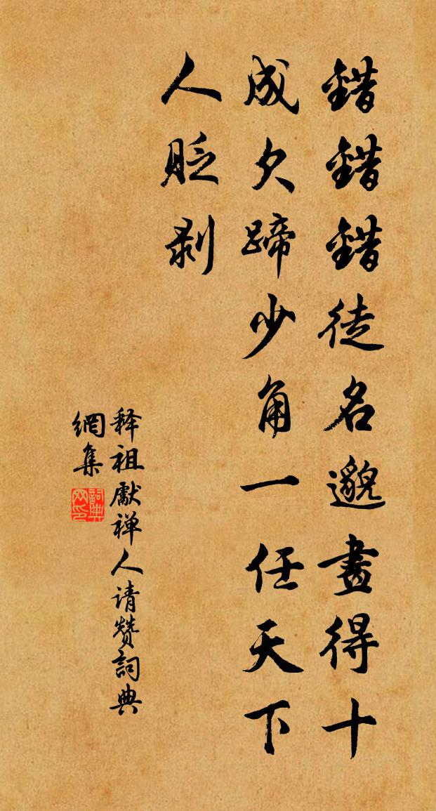 詩詞名句歷史字典書法欣賞書法字典國語詞典說文解字康熙字典古漢語字典標 題 作 者 詩 句 禪人請贊作者:釋祖先 朝代:宋代禪人請贊原文錯錯錯,徒名邈。畫得十成,欠蹄少角,一任天下人貶剝。詩詞問答問:禪人請贊的作者是誰?答:釋祖先問:禪人請贊寫於哪個朝代?答:宋代釋祖先禪人請贊書法欣賞禪人請贊書法作品詩詞推薦餞駱四二首李嶠〔唐代〕平生何以樂,斗酒夜相逢。曲中驚別緒,醉里失愁容。星月懸秋漢,風霜入曙鍾。明日臨溝水,青山幾萬重。甲第插秧歌鄭樵〔宋代〕漠漠兮水田,裊裊兮輕煙。布穀啼兮人比肩,縱橫兮陌阡。寄題張商弼葵堂堂下元不種葵花但取面勢向陽楊萬里〔宋代〕行盡葵堂西復東,葵花元自不曾逢。客來問訊名堂意,雪裡芭蕉笑殺儂。題翠蛟羅相〔宋代〕坡仙已跨老鯨去,夭矯一蛟留翠岑。頭角要歸滄海闊,鬐鱗聊舞小亭陰。停杯欲共馮夷語,倚杖不知嵐氣深。休用答劉書記見贈李山甫〔唐代〕吟近秋光思不窮,酷探騷雅愧無功。茫然心苦千篇拙,暝坐神凝萬象空。月上開襟當北戶,竹邊回首揖西風。知音噫田操四章章六句寄呈王介甫王令〔宋代〕誰能采芹,不適有獲。果蓏樹之,則食其實。豈弟君子,孔敬且力。次韻司封使君立春紀事朱長文〔唐代〕碧瓦猶藏臘雪寒,東杓初向斗旁觀。雪垂華旦天京遠,雉舞條風野老歡。官柳嫩黃迎皂蓋,園蔬新綠委金盤。詩才書壁黃損〔唐代〕一別人間歲月多,歸來人事已銷磨。惟有門前鑒池水,春風不改舊時波。定齋為楊和甫賦白玉蟾〔宋代〕水澄秋月現,雲散春山出。鏡內影去來,杯中形出沒。釋氏慧之源,儒者誠之骨。忘軀見天機,灰心契造物。落花讀《山海經》 其十三陶淵明〔魏晉〕岩岩顯朝市,帝者慎用才。何以廢共鯀,重華為之來。仲父獻誠言,姜公乃見猜;臨沒告饑渴,當復何及哉!寄趙西皋先生顧逢〔宋代〕居官但欲歸,每恨去官遲。天下蒼生福,朝中宰相時。龍蛇三寸筆,風月百篇詩。此去除書至,難言以病辭。鷓鴣天·元夕有所夢姜夔〔宋代〕肥水東流無盡期。當初不合種相思。夢中未比丹青見,暗裡忽驚山鳥啼。春未綠,鬢先絲。人間別久不成悲。誰教病起陸游〔宋代〕頹垣破屋暗藜蒿,病起不知秋已高。晨倚山楹群木脫,暮臨苔砌百蟲號。力殫編簡初何得,腰折塵埃只漫勞。賴有送何濟川學士知漢州梅堯臣〔宋代〕丞相初得君,有志重儒術。乃言天下士,徒此古清秩。遂懲衒鬻人,忝冒十八七。進君天祿閣,比眾為第一。又薦無俗念 嘆世王丹桂〔元代〕蟾烏景急,暗催人、兩鬢銀絲如織。終日區區猶不省,蓋為家緣煎逼。蝸角虛名,蠅頭微利,得也成何濟。聞身康太一石鱉崖口潭舊廬招王學士岑參〔唐代〕驟雨鳴淅瀝,颼飀谿谷寒。碧潭千餘尺,下見蛟龍蟠。石門吞眾流,絕岸呀層巒。幽趣倏萬變,奇觀非一端。偶逐春日王炎〔宋代〕小憑筍輿行稻田,麥芒桑蕾春無邊。勒迴風物未全好,小雨班班天護寒。入門烏鵲枝頭語,鴻雁好音慈母喜。車馬應天長牛嶠〔唐代〕玉樓春望晴煙滅,舞衫斜卷金條脫。黃鸝嬌轉聲初歇,杏花飄盡龍山雪。鳳釵低赴節,筵上王孫愁絕。鴛鴦對銜羅彭澤縣陳舜俞〔宋代〕古來彭澤縣,應有折腰人。百里昔猶重,先生豈不貧。菊花還在否,柳色為誰新。白髮南遷客,淒涼問水濱。閒趣陸游〔宋代〕被擁聽秋雨,兒扶上夜香。甑炊霜後稻,糟漬社前姜。馬病空思路,僧歸卻住房。風扉久嘔軋,錯認櫓聲長。名句推薦百花頭上開,冰雪寒中見。辛棄疾《生查子·重葉梅》 柳垂江上影,梅謝雪中枝。晏幾道《臨江仙·身外閒愁空滿》 穿天透地不辭勞,到底方知出處高。馮雲山《詠瀑布》 公子南橋應盡興,將軍西第幾留賓。杜審言《春日京中有懷》 器乏雕梁器,材非構廈材。趙彥昭《奉和元日賜群臣柏葉應制》 不自見,故明;不自是,故彰;不自伐,故有功;不自矜,故長。老子《老子·道經·第二十二章》 知臣莫若於君,知子莫若於父。魏徵《隋書·帝紀·卷二》 魂來楓葉青,魂返關塞蒙杜甫《夢李白二首·其一》 故人何在,煙水茫茫。柳永《玉蝴蝶·望處雨收雲斷》 疏是枝條艷是花,春妝兒女競奢華。曹雪芹《詠紅梅花得“花”字》