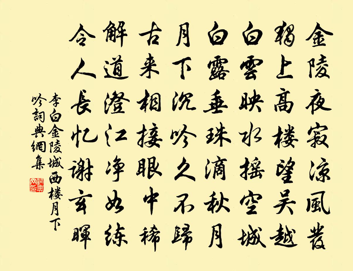 金陵城西樓即“孫楚樓”,因西晉詩人孫楚曾來此登高吟詠而得名。樓在金陵城西北覆舟山上(見《輿地誌》),蜿蜒的城垣,浩渺的長江,皆陳其足下,為觀景的勝地。這首詩,李白寫自己夜登城西樓所見所感。