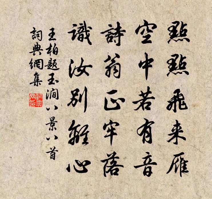詩詞名句歷史字典書法欣賞書法字典國語詞典說文解字康熙字典古漢語字典標 題 作 者 詩 句 題玉澗八景八首作者:王柏 朝代:宋代題玉澗八景八首原文點點飛來雁,空中若有音。詩翁正牢落,識汝別離心。詩詞問答問:題玉澗八景八首的作者是誰?答:王柏問:題玉澗八景八首寫於哪個朝代?答:宋代王柏題玉澗八景八首書法欣賞題玉澗八景八首書法作品詩詞推薦緣識宋太宗〔宋代〕靜非山里住,鬧即擬何之。緣識歸空寂,生前舊亦知。首吟邵雍〔宋代〕堯夫非是愛吟詩,詩是堯夫慎獨時。人壽百年無以過,心游萬仞待何為。為謀須求心無愧,作事莫幸人不知。誠書金山游賀鑄〔宋代〕輕舠放中{左氵右霝},岸遠春風壯。楫師俯仰呼,天水爭簸蕩。吾方扣其舷,聊賡小海唱。梢回即東麓,側磴聯送智光之南值雨善生〔唐代〕結束衣囊了,炎州定去游。草堂方惜別,山雨為相留。又得一宵話,免生千里愁。莫辭重卜日,後會必經秋。蜀路二首張說〔唐代〕雲埃夜澄廓,山日曉晴鮮。葉落蒼江岸,鴻飛白露天。磷磷含水石,冪冪覆林煙。客心久無緒,秋風殊未然。徭蜀葡萄唐彥謙〔唐代〕金谷風露涼,綠珠醉初醒。珠帳夜不收,月明墮清影。嘲風范成大〔宋代〕紛紅駭綠驟飄零,痴騃封姨沒性靈。報導海棠方熟睡,也須留眼為渠青。寄題千山乾隆〔清代〕千山勝景久薌哉,三度徒教寄詠回。本異唐宗曾駐輦,空傳丁令有遺台。底須石洞花岩到,原匪探奇問景來。卻笑減字木蘭花林淳〔宋代〕燭花呈燦。瑞氣滿筵春欲爛。月色中宵。疑是階前雪未消。騷人詞客。魂斷蠟梅香已籍。誰更情關。一點新愁入遠八月八日發潭州後得絕句四十首趙蕃〔宋代〕午藹紛紛無奈濃,晚來微斂見山容。鵝湖舊日經行地,清吹思乘十里松。次青陽王安石〔宋代〕十載九華邊,歸期尚渺然。秋風一乘傳,更覺負林泉。老將行王維〔唐代〕少年十五二十時,步行奪得胡馬騎。射殺中山白額虎,肯數鄴下黃須兒。一身轉戰三千里,一劍曾當百萬師。漢兵蟬朱松〔宋代〕陰陰葉底午蟬嘶,滿腹春風寄一枝。下有行人正愁絕,不知幽咽自緣飢。早衰范成大〔宋代〕早衰頭腦已冬烘,信拙心情似苦空。僚舊姓名多健忘,家人長短總佯聾。一窗暖日棋聲里,四壁寒燈藥氣中。晚景送枯崖悟上人省覲三山蒲壽宬〔宋代〕遍踏長松影,行吟入畫屏。秋江一葉渡,落日數峰青。白髮乾新夢,黃花制晚齡。片云何日會,重約在林扃。腰疼山浮圖下作賀鑄〔宋代〕茲山非峻極,名不載圖譜。投策一攀躋,未覺病腰膂。蒼松帶寒日,交陰層窣堵。儼然黃面師,粉繪色已古。我貪句陶弼〔宋代〕玉簪峰頂共登仙,銅柱溪頭再得賢。和唐壽隆上元五首胡寅〔宋代〕滿城和氣在春台,玉漏沉沉鐵鎖開。明月誰知千里共,華燈同照萬人來。市橋漸漲丰容柳,江路猶殘的皪梅。欲與送張舍人佐江州同薛璩十韻(走筆成)王維〔唐代〕束帶趨承明,守官唯謁者。清晨聽銀蚪,薄暮辭金馬。受辭未嘗易,當是方知寡。清范何風流,高文有風雅。忽佐促織蒲松齡〔清代〕宣德間,宮中尚促織之戲,歲征民間。此物故非西產;有華陰令欲媚上官,以一頭進,試使斗而才,因責常供。令名句推薦少小雖非投筆吏,論功還欲請長纓。祖詠《望薊門》 臨水一長嘯,忽思十年初。白居易《垂釣》 蔡女菱歌移錦纜,燕姬春望上瓊鉤。上官儀《詠畫障》 禮者,所以正身也;師者所以正禮也。荀子《荀子·修身》 親卿愛卿,是以卿卿;我不卿卿,誰當卿卿?劉義慶《世說新語·惑溺》 女慕貞潔,男效才良。周興嗣《千字文·全文》 過雨西風,數葉井梧愁舞。吳文英《荔枝香近·七夕》 香到酴醾送晚涼,荇風輕約薄羅裳。曲闌憑遍思偏長。葉小鸞《浣溪沙·初夏》 念去去,千里煙波,暮靄沉沉楚天闊。柳永《雨霖鈴·寒蟬淒切》 教人無處寄相思,落花芳草過前期,沒人知。孫光憲《虞美人·好風微揭簾旌起》