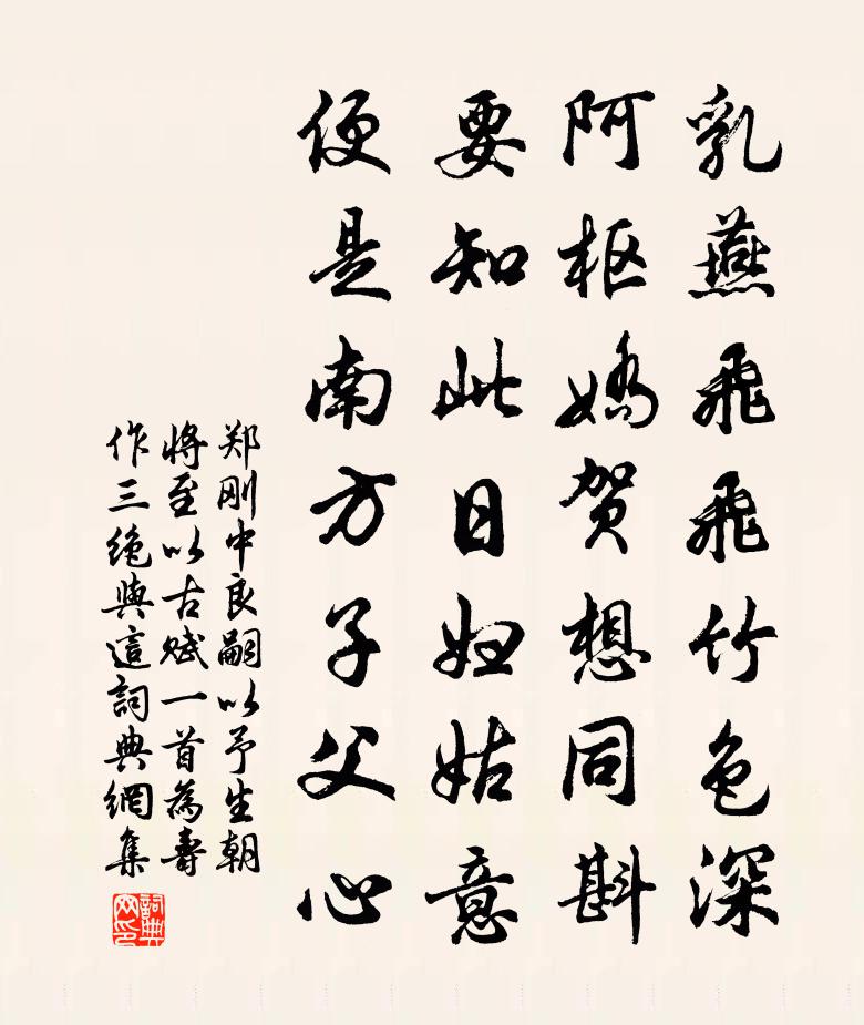 詩詞名句歷史字典書法欣賞書法字典國語詞典說文解字康熙字典古漢語字典標 題 作 者 詩 句 良嗣以予生朝將至以古賦一首為壽作三絕與這作者:鄭剛中 朝代:宋代原文乳燕飛飛竹色深,阿樞嬌賀想同斟。要知此日婦姑意,便是南方子父心。詩詞問答問:《良嗣以予生朝將至以古賦一首為壽作三絕與這》的作者是誰?答:鄭剛中問:該詩寫於哪個朝代?答:宋代書法欣賞良嗣以予生朝將至以古賦一首為壽作三絕與這書法作品詩文賞析【原題】:良嗣以予生朝將至以古賦一首為壽作三絕與這勉其省愆念咎當在念親之先詩詞推薦新歲雪霽到西湖作三首宋庠〔宋代〕水華煙熊壓回汀,客至無情亦有情。芳草不須緣短夢,一番新綠滿塘生。移住西門之溪上程公許〔宋代〕罷官來就湖州住,為愛雙流貫一城。僦屋本非嫌僻靜,開窗正要納空明。魚是幸要隨宜買,饘粥何妨逐漸營。況有南鄉子(大雪韓叔夏坐中)向子諲〔宋代〕梅與雪爭姝。試問春風管得無。除卻個人多樣態,誰如。細把冰姿比玉膚。一曲倒金壺。既醉仍煩翠袖扶。同向凌題逸樂子卷楊維楨〔元代〕煙水風塵外,先生一草堂。乾時無戰策,卻老有丹方。蒲方抄書短,松花釀酒日。有時歌欸乃,小艇在滄浪。登台州城樓夏竦〔宋代〕樓壓荒城見遠村,倚闌衣袂拂苔紋。猿啼曉樹枝枝雨,僧下秋山級級雲。招客酒旗臨岸掛,灌田溪水鑿渠分。洞中用看雲體趙崇嶓〔宋代〕上有懸石崖,下有滑石道。中有觀空人,容顏半枯槁。坐息窮年歲,抱此希世寶。雖然欠奇俊,塵醫已一掃。或雲上高明府孫世則寄書及詩依韻和酬強至〔宋代〕客顏憔悴過三閭,猶喜良朋記拙疏。忽隔重江論舊契,更言終日困新書。宦情共減中年後,樂事難同二月初。好在入瞿塘峰張嵲〔宋代〕瞿塘深窈窕,翠氣曉空濛。亂石增驚浪,長灘激迅風。舟行天塹內,身在夾城中。絕壁皆浸漢,於茲識禹功。酹江月姬翼〔元代〕夢中駭鹿,戲浮生得失、悲歡離合。見解分明猶是夢,轉轉昏沉難覺。雞口人情,羊腸世路,各自爭頭角。揮鞭舉過石頭城張祜〔唐代〕累累墟墓葬西原,六代同歸蔓草根。唯是歲華流盡處,石頭城下水千痕。東城馬上賀鑄〔宋代〕彩虹橋下水關東,接畛園林狹逕通。繁杏半開隨半落,短牆無計礙春風。王夷甫羅隱〔唐代〕把得閒書坐水濱,讀來前事亦酸辛。莫言麈尾清譚柄,壞卻淳風是此人。夜坐二首劉克莊〔宋代〕坐久烏薪盡,呼童掃葉忙。海風過雪冷,冬夜抵年長。故紙真糟粕,枯骴孰臭香。老無閒記性,讀罷轉頭忘。過江外感懷陳襄〔宋代〕江水無情含野煙,江風還似舊時天。先生隱去思成死,今日重來十六年。郡侯坐上觀琉璃瓶中游魚徐夤〔唐代〕寶器一泓銀漢水,錦鱗才動即先知。似涵明月波寧隔,欲上輕冰律未移。薄霧罩來分咫尺,碧綃籠處較毫釐。文翁虞美人(東山海棠)李彌遜〔宋代〕海棠開後春誰主。日日催花雨。可憐新綠遍殘枝。不見香腮和粉、暈燕脂。去年攜手聽金縷。正是花飛處。老來先游西湖蘇轍〔宋代〕閉門不出十年久,湖上重遊一夢回。行過閭閻爭問訊,忽逢魚鳥亦驚猜。可憐舉目非吾黨,誰與開尊共一杯。歸去酬李壺關奉使行縣憶諸公儲光羲〔唐代〕青楓江上滄浪吟,白月宮中鸚鵡林。非有淨清心,同道同房若斷金。離居忽有雲山意,清韻遙轉舟楫事。去時能憶梅竹軒為楊君道賦王冕〔元代〕湖上軒窗面面幽,山居正是御書樓。一枝晴雪連雲白,三徑清風似水流。且喜往來無俗客,只茲瀟灑勝封侯。題詩清平樂晏幾道〔宋代〕波紋碧皺,曲水清明後。折得疏梅香滿袖,暗喜春紅依舊。歸來紫陌東頭,金釵換酒消愁。柳影深深細路,花梢小名句推薦海上眾鳥不敢飛,中有鯉魚長且肥。岑參《熱海行送崔侍御還京》 記年時、舊宿淒涼,暮煙秋雨野橋寒。吳文英《霜花腴·重陽前一日泛石湖》 欲吊沉累無所,但有漁兒樵子,哀此寫離憂。張孝祥《水調歌頭·過岳陽樓作》 白日地中出,黃河天外來。張蠙《登單于台》 大成若缺,其用不弊。大盈若沖,其用不窮。老子《老子·德經·第四十五章》 相尋夢裡路,飛雨落花中。晏幾道《臨江仙·鬥草階前初見》 燕子巢方就,盆池小,新荷蔽。杜安世《鶴沖天·清明天氣》 倩何人喚取,紅巾翠袖,搵英雄淚!辛棄疾《水龍吟·登建康賞心亭》 零落江南不自由。兩綢繆。料得吟鸞夜夜愁。姜夔《憶王孫·番陽彭氏小樓作》 豈知民力艱,顆米皆琳琅。黃燮清《秋日田家雜詠》