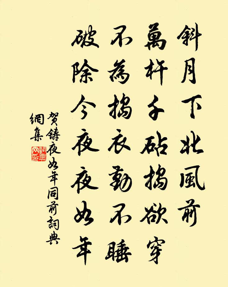 詞之首句“斜月下 ”,交代時間;“北風前”,交代氣候、節令。深秋的夜晚,銀白色的月光籠罩著大地,北風送來了陣陣凜冽的寒氣。那如水的月光,勾起了思婦對遠戍邊地親人的思念,那刺骨的北風,催促著她們儘快趕製寒衣。自然洗鍊的六個字,勾畫出一幅渺遠、淒清的畫面。在這樣的背景之中,遠遠近近傳來了此起彼伏的砧杵聲 ,急促沉重,搗之欲穿。詞由從前人詩句代出,前人有詩云“搗衣明月下,靜夜秋風飄”(庾信《題畫屏風》),“長安一片月,萬戶搗衣聲 ”(李白《子夜吳歌》),但其重點是落在“搗欲穿”三字上,詞人突出的是砧杵聲的急促沉重。從這撼人心魄的杵聲中,付出思婦對親人的體貼、關懷和刻骨銘心的思念,以聲傳情,不言情而情自見。“不為搗衣 ”句進一步向深處開掘,勒筆作勢,陡起波瀾,揮筆在句首冠以“不為”二字。明言思婦們不是為了搗衣而徹夜不眠,從而為下文作好鋪墊。