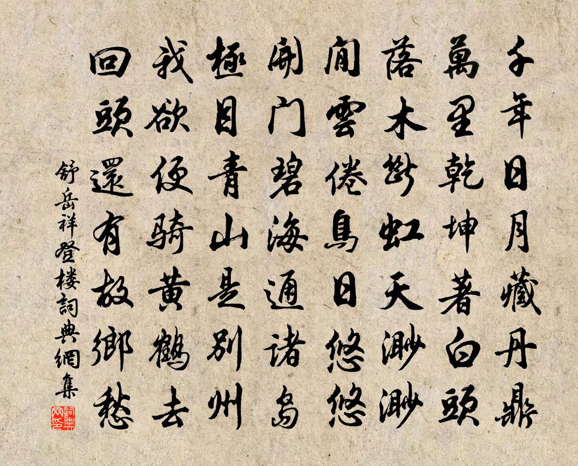 詩詞名句歷史字典書法欣賞書法字典國語詞典說文解字康熙字典古漢語字典標 題 作 者 詩 句 登樓作者:舒岳祥 朝代:宋代登樓原文千年日月藏丹鼎,萬里乾坤著白頭。落木斷虹天渺渺,閒雲倦鳥日悠悠。開門碧海通諸島,極目青山是別州。我欲便騎黃鶴去,回頭還有故鄉愁。詩詞問答問:登樓的作者是誰?答:舒岳祥問:登樓寫於哪個朝代?答:宋代舒岳祥登樓書法欣賞登樓書法作品詩詞推薦次韻陽孝本游翟家灣書院二首又一絕蘇頌〔宋代〕翟市西傍一徑開,偶攜親友陟崔嵬。莫言第舍衡門陋,已有仙翁步屧來。日欲銜山回返照,風還吹雨壓浮埃。才歸春寒吳融〔唐代〕固教梅忍落,體與杏藏嬌。已過冬疑剩,將來暖未饒。玉階殘雪在,羅薦暗魂銷。莫問王孫事,煙蕪正寂寥。老柏圖為張心田賦王冕〔元代〕高堂素壁無纖埃,上有老柏參天來。銅柯旁奮龍爪出,密葉暗擁玄雲堆。江乾水落見白石,小竹無聲弄秋碧。君不蜘蛛洪咨夔〔宋代〕已迫斜陽欲墜時,謀身只怕腳行遲。縱橫籠罩大為網,首尾經綸渾是絲。腹飽飛蟲肥似瓠,喙工毒螫利於錐。朝來【仙呂】錦橙梅_廝收拾廝定佚名〔元代〕廝收拾廝定當,越拘束著越荒唐。入門來不帶酒廝禁持,覷不得娘香胡相。恁娘又不是女娘,繡房中不是茶坊,甘曾相士約過意釣答以絕句趙蕃〔宋代〕為竹作亭還斫竹,取詩名榜更題詩。歸來十日未一往,聊待蕭然雨後時。四威儀釋慧遠〔宋代〕臥,精進誰知成懶惰。念摩訶,不如還忍餓。仲弟未歸歲晚有懷蔡淵〔宋代〕明月照席寒,生我愁百端。冉冉歲雲徂,遊子不顧還。相送荷花碧,相望楓葉丹。高樓日千回,散步東林隈。攀條和林寶文吹暑軒二絕王炎〔宋代〕木末長風送雨來,田家遠近稻花開。披襟燕坐黃堂靜,一笑江山爽氣回。王東卿惠墨戲副之以詩因次韻謝之蔡戡〔宋代〕軒冕儻來真漫爾,穩泛瀟湘弄煙水。憑君收入畫圖中,一抹雲山數千里。小洞天毛奎〔宋代〕豐登少公事,時得訪林泉。鑿破蓬丘島,潛通小洞天。岩瞻橫北面,釣隱近西偏。縹緲雲藏閣,依稀石似船。崖平提舉生辰仲並〔宋代〕東井遙觀盾日升,南風猶入舜弦鳴。鵬程九萬豈終息,椿歲八千方再榮。平世功名期鳳鳥,一時文采應長庚。浮瓜九月十八日夜忽夢作送王龜齡詩兩句枕上足成周必大〔宋代〕匈奴何敢渡江東,一士真過萬馬雄。唐室安危誰可佩,雪山輕重屬之公。天台不納尚書履,鄉縣猶乘御史驄。行樂飄飄台曹彥約〔宋代〕清風怒折腰,斷送斜川歸。吾今已歸了,無用頻吹衣。吳友翠玉軒葛紹體〔宋代〕囂市塵中無此清,竹風聲應讀書聲。一軒擁翠萬玉瘦,正好著渠難弟兄。白鶴吟示覺海元公王安石〔宋代〕白鶴聲可憐,紅鶴聲可惡。白鶴靜無匹,紅鶴喧無數。百鶴招不來,紅鶴揮不去。長松受穢死,乃以紅鶴故。北山蔡州三首孔武仲〔宋代〕愁雲昏昏掩六月,電光霍霍盤四隅。淮西一雨三書夜,長瀾積潦無處無。試登高樓望四野,平田渺渺成江湖。山源為旃檀像賦家鉉翁〔宋代〕稽首古旃檀,曾共釋迦語。旃檀釋迦面目本來同,真身幻身何事相爾汝。如人對鏡照形像,拱兮揖兮若賓主。須臾依韻酬葛秋岩陶體四首釋文珦〔宋代〕大化無端倪,至道絕馮仗。委身於一靜,足以去群妄。死生亦寄耳,遐齡豈吾望。伯倫稱達人,胡為未忘葬。四月丁卯對雨寄趙正夫黃庭堅〔宋代〕公家常匆務,退食用寢訛。相思雖勞勤,書問不能多。時雨光萬物,開雲見羲和。乾坤有美意,畎澮未盈科。凱風名句推薦迢迢牽牛星,皎皎河漢女。佚名《迢迢牽牛星》 與朋友論學,須委曲謙下,寬以居之。王陽明《傳習錄·卷下·門人陳九川錄》 庭下如積水空明,水中藻、荇交橫,蓋竹柏影也。蘇軾《記承天寺夜遊 / 記承天夜遊》 吳台直下,緗梅無限,未放野橋香度。吳文英《永遇樂·探梅次時齋韻》 繞遍迴廊還獨坐。月籠雲暗重門鎖。蘇軾《蝶戀花·雨霰疏疏經潑火》 遙憐故園菊,應傍戰場開。岑參《行軍九日思長安故園》 雲雷,屯;君子以經綸。佚名《易傳·象傳上·屯》 星河秋一雁,砧杵夜千家。韓翃《酬程延秋夜即事見贈》 春朝物候妍,愁婦鏡台前。鄭愔《春怨》 知君獨坐青軒下,此時結念同所懷。李白《早秋單父南樓酬竇公衡》