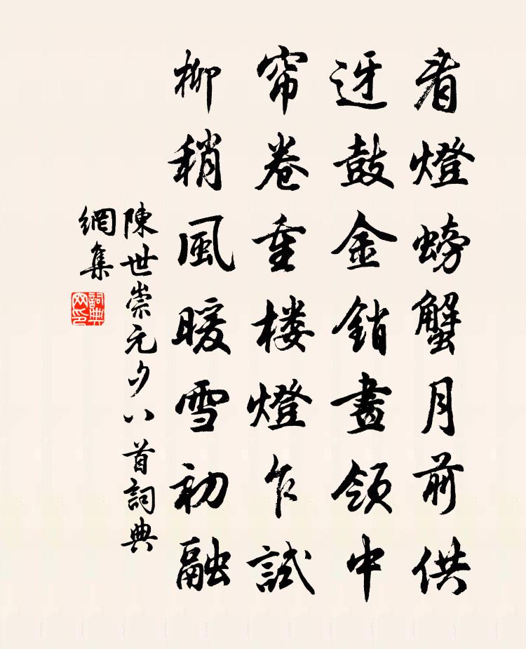 詩詞名句歷史字典書法欣賞書法字典國語詞典說文解字康熙字典古漢語字典標 題 作 者 詩 句 元夕八首作者:陳世崇 朝代:宋代元夕八首原文看燈螃蟹月前供,迓鼓金銷畫領中。簾卷重樓燈乍試,柳稍風暖雪初融。詩詞問答問:元夕八首的作者是誰?答:陳世崇問:元夕八首寫於哪個朝代?答:宋代陳世崇元夕八首書法欣賞元夕八首書法作品詩詞推薦減字木蘭花倪偁〔宋代〕雨餘還覽。隱隱遙岑花病眼。嫩綠浮湖。百頃蒲萄染不如。晨光絕勝。不許纖塵微點鏡。滿目皆詩。莫怪騷人語益寄高象州項安世〔宋代〕聞向君王乞象州,只貪州宅有高樓。山西日薄老無瘴,海外風來早見秋。蟋蟀已非今角匠,鷓{左石右鳥}猶是舊奉和襲美懷華陽潤卿博士三首陸龜蒙〔唐代〕幾降真官授隱書,洛公曾到夢中無。眉間入靜三辰影,肘後通靈五嶽圖。北洞樹形如曲蓋,東凹山色入薰爐。金墟教學退作二首陳著〔宋代〕昔年堂上來三鱣,今日溪頭領隊魚。方信卜居初意好,要教同里識詩書。往歲過廣陵值早春嘗作詩云春風十里珠簾卷彷黃庭堅〔宋代〕日邊置論誠深矣,聖處時中乃得之。莫作秋蟲促機杼,貧家能有幾絇絲。重陽日中外同歡,以詩言志,因示群官李适〔唐代〕爽節在重九,物華新雨餘。清秋黃葉下,菊散金潭初。萬實行就稔,百工欣所如。歡心暢遐邇,殊俗同車書。至化賀新郎(再和)李曾伯〔宋代〕才過黃花雨。問長堤、依依萬柳,未春何絮。一目河山銀幻出,驚詫夜光流注。巍觀矗、玉為雲柱。風卷寒廬迷過暮春贈陳器之張耒〔宋代〕牡丹開過解鞦韆,鵯鵊鳴時三月天。盡日好風吹絮雪,一池春水泛蓮錢。溪邊蒲筍供朝飯,堂上圖書伴晝眠。端坐塞下曲霍總〔唐代〕曾當一面戰,頻出九重圍。但見爭鋒處,長須得勝歸。雪沾旗尾落,風斷節毛稀。豈要銘燕石,平生重武威。壺中天慢曾覿〔宋代〕素飈漾碧,看天衢穩送、一輪明月。翠水瀛壺人不到,比似世間秋別。玉手瑤笙,一時同色,小按霓裳疊。天津橋夏夜陸游〔宋代〕庭荒蔓草長,堂豁爽氣入。悠然推枕起,聊作倚杖立。飛螢亦避雨,黏棟光熠熠。南鄰輸稅歸,小婦愁夜汲。孫大監輓詩戴表元〔宋代〕禹穴收雲氣,滄江亦斷流。真成掃地盡,同作上天游。銘誄看遺史,衣冠入隱丘。空餘平世眼,曾望李膺舟。送翼之過天台趙汝鐩〔宋代〕天台山水窟,人道是仙家。白鶴掛寒溜,赤城飛暮霞。獨攜筇杖過,莫畏石橋斜。牢記經行處,歸來向我夸。答貢甫酌騏驥池上見詒韓維〔宋代〕金行戰陽暑未北,炎郁填胸汗流液。空堂大祖不可度,欲取清風自湔滌。耽耽華廄列官守,對起二亭嚴案席。天渠嗣知客遠訪筠溪留旬餘將歸以偈送之李彌遜〔宋代〕剝啄君來破鬱陶,解包相對煮溪毛。一坡修竹無窮意,可但靈雲只見桃。挽雲屋徐侍郎王義山〔宋代〕闔朝奔逸盪無關,夜半瀟瀟風雨寒。世亂爭先尋活路,時貧輸與做窮官。平生自謂學無事,一死諒非君所難。到此丘叔喬八十陳藻〔宋代〕樂欲永千年,愁難禁一夕。大家於此且貪生,八十孩兒題向額。今朝門下慶相符,坐有繡衣為上客。況乎二弟古稀南康席上贈劉李二君黃庭堅〔宋代〕伯倫酒德無人敵,太白詩名有古風。浪許薄才酬大雅,長愁小戶對洪鍾。月明如晝九江水,天靜無雲五老峰。此賞端午帖子詞二十首皇帝合六首歐陽修〔宋代〕舜舞來遐俗,堯仁浹九區。五兵消以德,何用赤靈符。題楊氏猗猗閣胡宏〔宋代〕望處積雲深,妙見此君心。中虛抱元氣,不受一塵侵。嗟哉人生逐利名,雞犬放去猶知尋。我愛坐君閣,遊戲猗猗名句推薦流星透疏木,走月逆行雲。賈島《宿山寺》 落日無情最有情,遍催萬樹暮蟬鳴。楊萬里《初秋行圃》 重岡已隔紅塵斷,村落更年豐。元好問《人月圓·重岡已隔紅塵斷》 道由白雲盡,春與青溪長。劉昚虛《闕題》 七夕今宵看碧霄,牽牛織女渡河橋。林傑《乞巧》 燕語如傷舊國春,宮花一落已成塵。李益《隋宮燕》 水色淥且明,令人思鏡湖。李白《登單父陶少府半月台》 玉人垂釣理纖鉤。月明池閣夜來秋。吳文英《浣溪沙·秋情》 朝來嗔寂寞,不肯試新衣。馮夢龍《喻世明言·卷一》 落地為兄弟,何必骨肉親!陶淵明《雜詩》