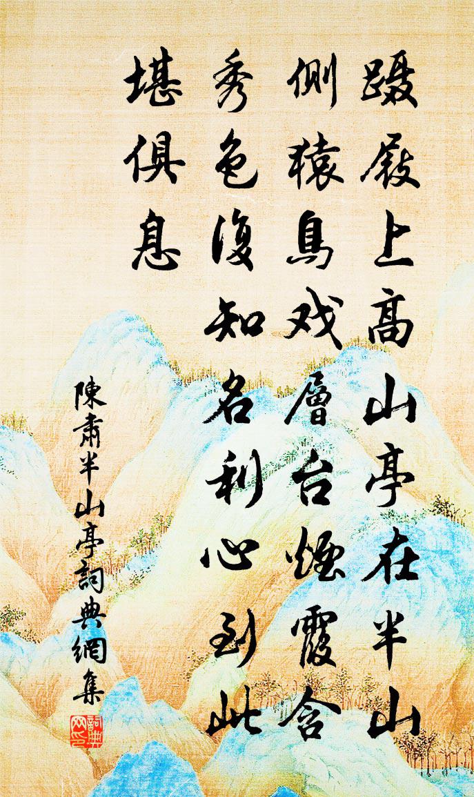 詩詞名句歷史字典書法欣賞書法字典國語詞典說文解字康熙字典古漢語字典標 題 作 者 詩 句 半山亭作者:陳肅 朝代:宋代半山亭原文躡屐上高山,亭在半山側。猿鳥戲層台,煙霞含秀色。復知名利心,到此堪俱息。詩詞問答問:半山亭的作者是誰?答:陳肅問:半山亭寫於哪個朝代?答:宋代陳肅半山亭書法欣賞半山亭書法作品詩詞推薦墓門佚名〔先秦〕墓門有棘,斧以斯之。夫也不良,國人知之。知而不已,誰昔然矣。墓門有梅,有鴞萃止。夫也不良,歌以訊之。句劉筠〔宋代〕大野幾星分婺女,清風萬古感顏烏。始皇於石〔宋代〕萬世綱常具六經,天應未遽喪斯文。焚書欲滅先王道,道在人心不可焚。何叔信生日趙蕃〔宋代〕既自科名就,方勤問學為。一官寧恨晚,萬里此其基。晁魏通家舊,沅湘識面遲。高懷每傾倒,勝日共追隨。要擬閒遊李建勛〔唐代〕攜酒復攜觴,朝朝一似忙。馬諳頻到路,僧借舊眠床。道勝他圖薄,身閒白日長。扁舟動歸思,高處見滄浪。西江月王惟一〔元代〕學道須當猛烈,始終確守初心。纖毫物慾不相侵。方得神凝氣定。動靜不離中正,陽生剝盡群陰。龍降龍伏鬼神欽挽張元常葬母夫人二首宋祁〔宋代〕嬰病曾無苦,期頤未滿年。風酸吹棘地,露泣采蘭天。庀具藏分澤,張琴委暗絃。江流終不竭,懿範此俱傳。偶題李流謙〔宋代〕遙岑數寸斜日,楊柳一江晚煙。追恨風拘雨阻,那知雁後花前。七夕溫庭筠〔唐代〕鵲歸燕去兩悠悠,青瑣西南月似鉤。天上歲時星右轉,世間離別水東流。金風入樹千門夜,銀漢橫空萬象秋。蘇小釣船歸·綠淨春深好染衣賀鑄〔宋代〕綠淨春深好染衣。際柴扉。溶溶漾漾白鷗飛。兩忘機。南去北來徒自老,故人稀。夕陽長送釣船歸。鱖魚肥。酬答覆州葉教授項安世〔宋代〕先生來赴泮林期,正是尋花問柳時。偷把春風舞雩曲,蒹葭江上避人吹。齊天樂翁孟寅〔宋代〕幽香不受春料理,青青尚餘秋鬢。磵曲岩隈,煙梳露浴,甘與菰蒲共隱。芳標瘦迥。看纓結丁香,帶縈晴荇。恨水高宗皇帝輓詞二首袁樞〔宋代〕雲集燕城擾,龍翔漢業興。風燃燎衣火,雪擁渡河水。險驗成戡定,憂勞付纂承。百年余父老,嗚咽望原陵。以人參遺段成式周繇〔唐代〕人形上品傳方誌,我得真英自紫團。慚非叔子空持藥,更請伯言審細看。嘉禾百詠楊姑廟張堯同〔宋代〕孝德襄陵久,天然與眾殊。生男不能養,應合愧楊姑。飄轉鄭克已〔宋代〕飄轉未歸客,風帆不夜舟。斷雲依水定,薄月帶沙流。香倚黃花岸,心清白露秋。林鴉棲未穩,飛亂北山頭。送張管書記(一作送張管記從軍)錢起〔唐代〕邊事多勞役,儒衣逐鼓鼙。日寒關樹外,峰盡塞雲西。河廣篷難度,天遙雁漸低。班超封定遠,之子去思齊。傳經院壁畫松(一本題上有西蜀淨眾寺五字)鄭谷〔唐代〕危根瘦盡聳孤峰,珍重江僧好筆蹤。得向遊人多處畫,卻勝澗底作真松。次韻子瞻臨皋新葺南堂五絕蘇轍〔宋代〕客去知公醉欲眠,酒醒寒月墮江煙。床頭復有三升蜜,貧困相資恐是天。較藝將畢和禹玉梅堯臣〔宋代〕窗前高樹有棲鵲,記取明朝飛向東。家布望春門外住,身居華省信難通。夜聞相府催張牓,曉聽都堂議奏中。龍閣名句推薦肝膽相照,斯為腹心之友;意氣不孚,謂之口頭之交。程登吉《幼學瓊林·卷二·朋友賓主》 料因循誤了,殘氈擁雪,故人心眼。張炎《解連環·孤雁》 空山不見人,但聞人語響。王維《鹿柴》 微暈嬌花濕欲流,簟紋燈影一生愁。納蘭性德《浣溪沙·詠五更和湘真韻》 已恨碧山相阻隔,碧山還被暮雲遮。李覯《鄉思》 貧無可奈惟求儉,拙亦何妨只要勤。王永彬《圍爐夜話·第三則》 去時梅萼初凝粉。不覺小桃風力損。歐陽修《玉樓春·去時梅萼初凝粉》 劇辛樂毅感恩分,輸肝剖膽效英才。李白《行路難三首》 惶恐灘頭說惶恐,零丁洋里嘆零丁。文天祥《過零丁洋》 湖山信是東南美,一望彌千里蘇軾《虞美人·有美堂贈述古》