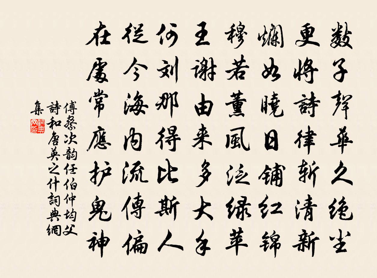 詩詞名句歷史字典書法欣賞書法字典國語詞典說文解字康熙字典古漢語字典標 題 作 者 詩 句 次韻任伯仲均父詩和唐英之什作者:傅察 朝代:宋代原文數子聲華久絕塵,更將詩律斬清新。爛如曉日鋪紅錦,穆若薰風泛1|1綠苹。王謝由來多大手,何劉那得比斯人。從今海內流傳偏,在處常應護鬼神。詩詞問答問:《次韻任伯仲均父詩和唐英之什》的作者是誰?答:傅察問:該詩寫於哪個朝代?答:宋代書法欣賞次韻任伯仲均父詩和唐英之什書法作品詩詞推薦太白釋善珍〔宋代〕脫鞾殿上醉陽狂,觸撥春風睡海棠。放逐一身窮不恨,三郎入蜀更郎當。送陸君重五首方回〔宋代〕謂生無廉吏,吾猶見此人。政聲口碑在,陰德□□新。薄俗難開眼,亨途易致身。一清當百濁,端肯混光塵。春遊陸游〔宋代〕杏花天氣喜新晴,白首書生樂太平。小陌鞦韆雖隔世,名園祓禊尚關情。山林自古流觴地,弦管誰家送酒聲?蓴菜桐花歐陽修〔宋代〕猗猗井上桐,花葉何蓑蓑。下蔭百尺泉,上聳陵雲材。翠色洗朝露,清陰午當階。幽蟬自嘒嘒,鳴鳥何喈喈。日出謁金門(初春)黃升〔宋代〕花事淺。方費化工勻染。牆角紅梅開未遍。小桃才數點。人在暮寒庭院。閒續茶經香傳。酒思如冰詩思懶。雨聲簾荊門病中寄懷貫微上人齊己〔唐代〕我衰君亦老,相憶更何言。除泥安禪力,難醫必死根。梅寒爭雪彩,日冷讓冰痕。早晚東歸去,同尋入石門。西湖曲吳龍翰〔宋代〕十里風光煙水白,嵯峨帝城紫霧隔。笛聲吹斷蒲葉風,鷺飛界破青山色。湖波鱗鱗織成縠,翠蓋紅幢機上簇。長安教授以憶梅韻賦雪詩蕃同之五首趙蕃〔宋代〕窈窕緣江路,幽深隔岸祠。為梅期載酒,因雪重賡詩。儻匪相娛樂,疇能遣歲時。出門方積凍,散策待晴曦。贈相士郭灝魏了翁〔宋代〕載小奚奴長自隨,兩牛腰大贈行詩。逢人有問輒如見,及我相遭不肯奇。每會面時長好好,合開口處或期期。道人次韻寅庵四首黃庭堅〔宋代〕大若塘邊擉網魚,小桃源口帶經鋤。詩催孺子成雞柵,茶約鄰翁掘芋區。苦楝狂風寒徹骨,黃梅細雨潤如酥。此時曾端伯自承移帥川口有懷風旨無便附信忽領教曹勛〔宋代〕衣袽先九潤,此日上瞿塘。風月動官柳,旌旗開蜀疆。詩壇凌李杜,政績過龔黃。追詔知非晚,肯令生智囊。生查子(答洪丞相謝送小冠)趙磻老〔宋代〕章甫不如人,翠綰垂楊縷。縴手送來時,羅帕緘香霧。貂嬋懶上頭,渭水知何處。風月共垂竿,脫帽須親付。游誠之來廣西相從幾一年今當赴官九江極與之張栻〔宋代〕士學端成已,工夫要自程。聖門窺廣大,中德養和平。美玉資勤珏,良才詎小成。心期須後會,拭目更增明。寄廬山簡寂觀重道者李中〔唐代〕憶昔采芝廬岳頂,清宮常接絳霄人。玉書閒展石樓曉,瑤瑟醉彈琪樹春。惟恨仙桃遲結實,不憂滄海易成塵。似醒奉呈何叔信魏昭甫三首趙蕃〔宋代〕寒廳寂寞不知春,登眺招要藉所親。始謂姑傾一杯酒,已焉顛倒白綸巾。送僧游山熊孺登〔唐代〕雲身自在山山去,何處靈山不是歸。日暮寒林投古寺,雪花飛滿水田衣。錢塘懷古柴元彪〔宋代〕百年朝市舊,登覽若為情。落日銅駝陌,東風夾馬營。路隨荊刺斷,城與黍離平。可惜西湖月,燒燈兩度晴。送張成季往江上賦得垂楊盧綸〔唐代〕垂楊真可憐,地勝覺春偏。一穗雨聲里,千條池色前。露繁光的皪,日麗影團圓。若到隋堤望,應逢花滿船。登潛山觀竇參〔唐代〕山勢欲相抱,一條微徑盤。攀蘿歇復行,始得凌仙壇。聞道葛夫子,此中煉還丹。丹成五色光,服之生羽翰。靈草又塔院洪咨夔〔宋代〕僧伽傳法處,阿育放光時。到頂直無縫,透心橫有枝。梅間詩鳳咮,竹裹酒鴟夷。醉上危層去,空明渺所思。名句推薦投我以桃,報之以李。佚名《抑》 檐流未滴梅花凍,一種清孤不等閒。鄭燮《山中雪後》 杜漸防萌,慎之在始。房玄齡《晉書·列傳·第六十八章》 樓外垂楊千萬縷。欲系青春,少住春還去。朱淑真《蝶戀花·送春》 愛向竹欄騎竹馬,懶於金地聚金沙。金地藏《送童子下山》 孤眠鸞帳里,枉勞魂夢,夜夜飛揚。佚名《鳳歸雲·閨怨》 柳花驚雪浦,麥雨漲溪田。李賀《南園十三首》 相識滿天下,知心能幾人?佚名《增廣賢文·上集》 一點殘紅欲盡時。乍涼秋氣滿屏幃。周紫芝《鷓鴣天·一點殘紅欲盡時》 文人之筆,勸善懲惡也。王充《論衡·卷二十·佚文篇》
