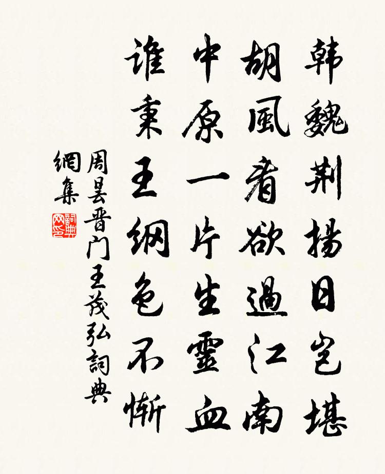 詩詞名句歷史字典書法欣賞書法字典國語詞典說文解字康熙字典古漢語字典標 題 作 者 詩 句 晉門王茂弘作者:周曇 朝代:唐代晉門王茂弘原文韓魏荊揚日豈堪,胡風看欲過江南。中原一片生靈血,誰秉王綱色不慚。詩詞問答問:晉門王茂弘的作者是誰?答:周曇問:晉門王茂弘寫於哪個朝代?答:唐代周曇晉門王茂弘書法欣賞晉門王茂弘書法作品注釋全唐詩:卷729-55詩詞推薦白髭行文天祥〔宋代〕憶昔守宣時,白上一根發。去之四五年,一化為七八。今年客衡湘,黑髭已多黃。眾黃忽一白,驚見如陵陽。白髮重至秀山售屋將歸十首方回〔宋代〕高下花千樹,東西屋百間。一毫非易得,雙手竟空不。勇銳傷輕脫,愚冥昧險艱。全城保生齒,終覺愧衰顏。子平寄惠希夷陳先生服唐福山藥方因戲作雜言文同〔宋代〕蜀江之東山色盡如赭,有道人云此是丹砂伏其下。煙雲光潤若洗濯,澗谷玲瓏如刻畫。我聞神仙草藥不在丹上生,諸公載酒賀余休致水村農卿有詩次韻劉克莊〔宋代〕指法金針不許窺,笑他貧女織寒機。謫仙曲奏調羹賜,之問詩成奪錦歸。論定會盼銀信召,眷濃漫妒玉環肥。溪邊金陵雜興二百首蘇泂〔宋代〕五陵歌舞換埃塵,地下黃金出尚新。碑字已漫青草死,酸風吹殺石麒麟。琉璃砲燈中魚葉茵〔宋代〕頭角未崢嶸,潛宮號水晶。游時雖逼窄,樂處在圓明。有火疑燒尾,無波可動情。一朝開混沌,變化趁雷轟。奉和李大夫題新詩二首各六韻。忘筌亭白居易〔唐代〕翠巘公門對,朱軒野徑連。只開新戶牖,不改舊風煙。虛室閒生白,高情澹入玄。酒容同座勸,詩借屬城傳。自笑斑竹簟佚名〔宋代〕龍鱗滿床波浪濕,血光點點湘娥泣。一片晴霞凍不飛,深沈盡訝蛟人立。百朵排花蜀纈明,珊瑚枕滑葛衣輕。閒窗歲暮言懷呈諸友王令〔宋代〕萬事無成只一吁,窮年況復嘆窮途。功名未立頭先白,貧病相仍氣尚粗。富貴早知皆有命,窮通料是不由吾。會須江城子(七夕風雨)陳著〔宋代〕紛紛都說會雙星。鵲橋成。鳳驂迎。風雨淒涼,何故鎖蒼冥。兒女空愁誰解意,須道我,試來聽。人間天上不同情晉祠泉范仲淹〔宋代〕神哉叔虞廟,地勝出嘉泉。一源其澄靜,數步忽潺湲。此異孰可窮,觀者增恭虔。錦鱗無敢釣,長生同水仙。千家挽吳君謀少卿二首劉克莊〔宋代〕昔為樞掾侍延英,驀聽臚傳第一聲。仙籍香浮廣寒殿,奏篇紙貴洛陽城。親逢明主真千載,曾謂斯人止九卿。惟有緣識宋太宗〔宋代〕不曾師受有文章,天與聰明作久長。道味自然玄境外,凡中奇異必非常。題先月閣易士達〔宋代〕新築亭台分外涼,廣寒移下水雲鄉。才當暝色千山合,便有檐前一點光。題磐庵作玻璃窗釋寶曇〔宋代〕晨曦入檐水到戶,老子肉醉人眼寒。博山一絲坐正穩,不許童稚褰帷看。和王倅見惠十篇曹勛〔宋代〕潦倒固久矣,猶涉世綱深。中經謗嫉人,屢欲魑魅尋。赫然天日照,敢改藜藿心。小桃紅·胖妓王和卿〔元代〕夜深交頸效鴛鴦,錦被翻紅浪。雨歇雲收那情況,難當,一翻翻在人身上。偌長偌大,偌粗偌胖,壓扁沈東陽。頌古二十一首釋心月〔宋代〕識得子醜寅卯句,應須繼紹此門風。如王仗劍當堂坐,佛魔俱拂一時空。夜愁曲施肩吾〔唐代〕歌者歌未絕,愁人愁轉增。空把琅玕枝,強挑無心燈。虞美人向子諲〔宋代〕以送之。時正之被召淮陽堂上曾相對。笑把姚黃醉。十年離亂有深憂。白髮蕭蕭同見、渚江秋。履聲細聽知何處。名句推薦世界微塵里,吾寧愛與憎。李商隱《北青蘿》 棗花至小能成實,桑葉雖柔解吐絲。王溥《詠牡丹》 伏雨朝寒愁不勝,那能還傍杏花行。納蘭性德《浣溪沙·伏雨朝寒愁不勝》 雪照山城玉指寒,一聲羌管怨樓間。劉著《鷓鴣天·雪照山城玉指寒》 千載休談南渡錯,當時自怕中原復。文徵明《滿江紅·拂拭殘碑》 順天意者,義政也;反天意者,力政也。墨子《墨子·26章 天志(上)》 三千丈清愁鬢髮,五十年春夢繁華。喬吉《折桂令·客窗清明》 跬步而不休,跛鱉千里;累土而不輟,丘山崇成。荀子《荀子·修身》 天外黑風吹海立,浙東飛雨過江來。蘇軾《有美堂暴雨》 以反求諸己為要法,以言人不善為至戒。胡宏《知言·文王》
