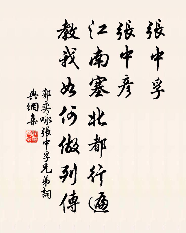 詩詞名句歷史字典書法欣賞書法字典國語詞典說文解字康熙字典古漢語字典標 題 作 者 詩 句 詠張中孚兄弟作者:郭奕 朝代:宋代詠張中孚兄弟原文張中孚,張中彥,江南塞北都行遍,教我如何做列傳。詩詞問答問:詠張中孚兄弟的作者是誰?答:郭奕問:詠張中孚兄弟寫於哪個朝代?答:宋代郭奕詠張中孚兄弟書法欣賞詠張中孚兄弟書法作品詩詞推薦次韻門下呂相公車駕視學蘇轍〔宋代〕未識吾君龍鳳章,諸儒望幸久南庠。輦回原廟初移蹕,鷺集西雝已著行。執爵稍前疑問道,獻琛不日數來王。從官近見慕巢尚書詩中屢有嘆老思退之意又於洛下…諭之白居易〔唐代〕近見詩中嘆白髮,遙知閫外憶東都。煙霞偷眼窺來久,富貴粘身擺得無。新置林園猶濩落,未終婚嫁且踟躕。應須送王節推夷仲秩滿赴闕喻良能〔宋代〕中年謝傅良多感,欲別能忘作惡無。今日與公休惜別,須知元不隔江湖。送王卿韋應物〔唐代〕別酌春林啼鳥稀,雙旌背日晚風吹。卻憶回來花已盡,東郊立馬望城池。籠禽羨歸翼,遠守懷交親。況復歲雲暮,思歸戴復古〔宋代〕躬耕海上奈無田,乍可經營買釣船。未有人供令狐米,欲從鬼借尉遲錢。回頭歸路三千里,藉手還鄉五百篇。幸遇解蹀躞楊無咎〔宋代〕迤邐韶華將半。桃杏勻於染。又還撩撥、春心倍淒黯。準擬□□狂吟,可憐無復當年,酒腸文瞻。倦遊覽。憔悴羞壽實齋侍郎王先生朱南傑〔宋代〕崧高維岳誦生申,整頓乾坤屬舊臣。天下安危關出處,性中存養自真純。便歸紫橐酬公論,已草黃麻授正人。天為慶元三年以職事至零陵訪澹岩俞徵〔宋代〕傳聞此地稀,來為細搜奇。眩眼珠泉滴,抬頭 * 垂。虛明天廣大,重疊石參差。坐久衣襟潤,聲翻語笑隨。幽深臨江仙(席上賦)畢良史〔宋代〕霜月穿簾乍白,苹風入坐偏涼。麾燈促席詫時光。桃花歌扇小,楊柳舞衫長。別乘平分風月,詞人剩引觥觴。莫將得老方回〔宋代〕方腴前臑與同甘,茄瓠朝朝滿菜籃。萬馬昔從行漠北,一蓑今得老江南。將軍夜度彈箏峽,處士秋棲掛篰岩。予奪春雪監中即事二首一晁補之〔宋代〕愁雲欲雪紛來族,微霰錚鏦先入竹。舞空蛺蝶殊未下,迸瓦明珠正相逐。僕夫無事困薪蘇,烏鳥不鳴依室屋。肺病送郭評事節判磨勘黃庶〔宋代〕塵埃衣襟改顏色,獨洗青衫三十年。足跡不入奔走途,來往銓戶鞋履穿。一時同上青雲人,往往裨補造化權。朝梳定鼎門褚載〔唐代〕郟鄏城高門倚天,九重蹤跡尚依然。須知道德無關鎖,一閉乾坤一萬年。劉資政符寶帖贊岳珂〔宋代〕公兩登西掖,前後抗論數十疏,可謂剛且勁。而扈衛江右,遭時不競。斯亦可以言命矣。夫遺學所傳,雖未足以盡裴勛父子佚名〔唐代〕矬人饒舌,破車饒楔。(父屬醆云:“裴勛飲十分。”)蝙蝠不自見,笑他樑上燕。(勛復父醆云:“十一郎亦飲安西聞捷楊時〔宋代〕鷹揚塞外得非熊,萬里金城一箭通。玉帳投壺隨燕豆,坐看飛將縛驍戎。聞西山虎梅堯臣〔宋代〕猛虎畏白日,孤客莫夜行。彼以不暴眾,此何獨忘生。飢必見人食,不食且無名。麋鹿能遠遁,安得逢怒獰。由人己亥歲感事曹松〔唐代〕澤國江山入戰圖,生民何計樂樵蘇。憑君莫話封侯事,一將功成萬骨枯。晚秋有懷鄭中舊隱白居易〔唐代〕天高風裊裊,鄉思繞關河。寥落歸山夢,殷勤采蕨歌。病添心寂寞,愁人鬢蹉跎。晚樹蟬鳴少,秋階日上多。長閒桔柏渡(在昭化縣)杜甫〔唐代〕青冥寒江渡,駕竹為長橋。竿濕煙漠漠,江永風蕭蕭。連笮動裊娜,征衣颯飄颻。急流鴇鷁散,絕岸黿鼉驕。西轅名句推薦施惠勿念,受恩莫忘。朱柏廬《朱子家訓·全文》 海水夢悠悠,君愁我亦愁。佚名《西洲曲》 二秋葉神媛,七夕望仙妃。任希古《和長孫秘監七夕》 一家之計在於和,一生之計在於勤。佚名《增廣賢文·上集》 荷花嬌欲語,愁殺蕩舟人。李白《淥水曲》 尊前只恐傷郎意,閣淚汪汪不敢垂。夏竦《鷓鴣天·鎮日無心掃黛眉》 忽然更作漁陽摻,黃雲蕭條白日暗。李頎《聽安萬善吹觱篥歌》 淚濕羅衣脂粉滿。四疊陽關,唱到千千遍。李清照《蝶戀花·淚濕羅衣脂粉滿》 寧可人負我,切莫我負人。佚名《增廣賢文·上集》 柳絲長,桃葉小。深院斷無人到。晏幾道《更漏子·柳絲長》