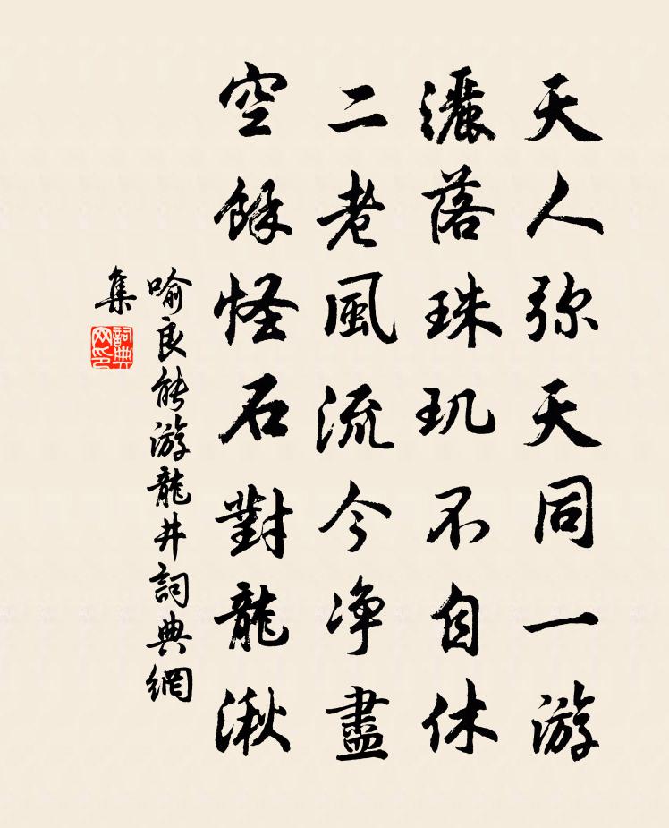 詩詞名句歷史字典書法欣賞書法字典國語詞典說文解字康熙字典古漢語字典標 題 作 者 詩 句 游龍井作者:喻良能 朝代:宋代游龍井原文天人彌天同一游,灑落珠璣不自休。二老風流今淨盡,空餘怪石對龍湫。詩詞問答問:游龍井的作者是誰?答:喻良能問:游龍井寫於哪個朝代?答:宋代喻良能游龍井書法欣賞游龍井書法作品詩詞推薦春日北歸舟中有懷薛能〔唐代〕盡日繞盤飧,歸舟向蜀門。雨乾楊柳渡,山熱杏花村。淨鏡空山曉,孤燈極浦昏。邊城不是意,回首未終恩。峽中晚春張嵲〔宋代〕臨水桃花已亂飛,向人渾似訴離披。溟濛細雨春風暴,還是青林生葉時。朝中措 賀廉侯舉兒子劉因〔元代〕金張家世費貂蟬。七葉待中冠。若就詩家攀例,生兒合喚添官。憑誰寄語,廉泉父老,斗酒相歡。今歲孫枝新長,論詩吟邵雍〔宋代〕何故謂之時,詩者言其志。既用言成章,遂道心中事。不止鍊其辭,抑亦鍊其意。煉辭得奇句,鍊意得餘味。再過黃州蘇子瞻東坡雪堂因書即事題於武昌王張舜民〔宋代〕欹帆側柂嶺邊歸,重過東坡叩竹扉。床坐凝塵風自掃,江山無主燕空飛。門前桃李添新逕,井畔梧桐長舊圍。好在賀明朝·憶昔花間初識面歐陽炯〔唐代〕憶昔花間初識面,紅袖半遮,妝臉輕轉。石榴裙帶,故將纖纖玉指偷捻,雙鳳金線。碧梧桐鎖深深院,誰料得兩情送李明府赴睦州,便拜覲太夫人岑參〔唐代〕手把銅章望海雲,夫人江上泣羅裙。嚴灘一點舟中月,萬里煙波也夢君。乙亥冬富春先生以老儒醇師居我東齊濟北張泂石介〔宋代〕鳳凰飛來眾鳥隨,神龍游處群魚嬉。先生道德如韓孟,四方學者爭賓士,濟北張泂壯且勇,楚丘李緼少而奇。二子哭劉言史孟郊〔唐代〕詩人業孤峭,餓死良已多。相悲與相笑,累累其奈何。精異劉言史,詩腸傾珠河。取次抱置之,飛過東溟波。可惜滿江紅(寄趙文仲、南仲領淮東帥憲)吳潛〔宋代〕岳後湘靈,曾孕個、擎天人物。臨古峴、綸巾羽扇,笑驅胡羯。護塞十年高叔子,出師一表儕諸葛。有孤忠、分付覺公院施鳥石台李頎〔唐代〕石台置香飯,齋後施諸禽。童子亦知善,眾生無懼心。苔痕蒼曉露,盤勢出香林。錫杖或圍繞,吾師一念深。和李令放稅張耒〔宋代〕晚田既廢麥初耕,冠蓋侵星獨出城。但見饑寒號歲晚,不聞簫鼓賽秋成。倉無農父千斯慶,稅比周人什一輕。撫字病中謝三山問訊李石〔宋代〕我昔擇師友,所至多朋儔。道義自然合,如以膠漆投。一官既已得,勢利尋戈矛。向者市道交,日親成日讎。僅餘再答靜翁並以筇竹一枝贈行四首黃庭堅〔宋代〕一筇九節添行李,用得人間處處尊。只要上山行飽飯,莫將風雪打人門。蘇小小墓權德輿〔唐代〕萬古荒墳在,悠然我獨尋。寂寥紅粉盡,冥寞黃泉深。蔓草映寒水,空郊曖夕陰。風流有佳句,吟眺一傷心。至揚州文天祥〔宋代〕眼穿只候賣柴回,今日堡城門不開。糴米已無訊息至,黃昏惆悵下山來。足姜句蘇泂〔宋代〕那知身百歲,未辦屋三間。見客慵開口,逢僧託買山。喜無他志願,幸不礙清閒。社燕秋鴻里,人生各有還。自曉存心訣晃逈〔宋代〕心息音,混融深。智先覺,念無侵。隨辦及,即漫尋。用此法,存於心。小山見梅陳廷光〔宋代〕小雪梅香已破緘,羅浮春信許先探。松林酒肆知誰醉,石壁題詩只自慚。未放翠禽呼夢覺,待教黃野縱鸞驂。行當舟行感懷張詠〔宋代〕風帆江上往來頻,漁叟應多笑此身。自愧無才酬聖澤,已甘行樂負青春。疲羸未復空忘味,網緒難條欲問津。更擬名句推薦戰陣之間,不厭詐偽。韓非及後人《韓非子·難一》 卻恨悲風時起,冉冉雲間新雁,邊馬怨胡笳。葉夢得《水調歌頭·秋色漸將晚》 紅日淡,綠煙晴。流鶯三兩聲。晏幾道《更漏子·柳絲長》 長使英雄淚滿襟,天意高難問。楊冠卿《卜運算元·秋晚集杜句吊賈傅》 海內風塵諸弟隔,天涯涕淚一身遙。杜甫《野望》 舊時茅店社林邊,路轉溪橋忽見。辛棄疾《西江月·夜行黃沙道中》 屋漏在上,知者在下。王充《論衡·卷十一·答佞篇》 弱齡寄事外,委懷在琴書。陶淵明《始作鎮軍參軍經曲阿作》 靡蕪盈手泣斜暉,聞道鄰家夫婿歸。魚玄機《閨怨》 澹月梨花,借夢來、花邊廊廡。史達祖《解佩令·人行花塢》