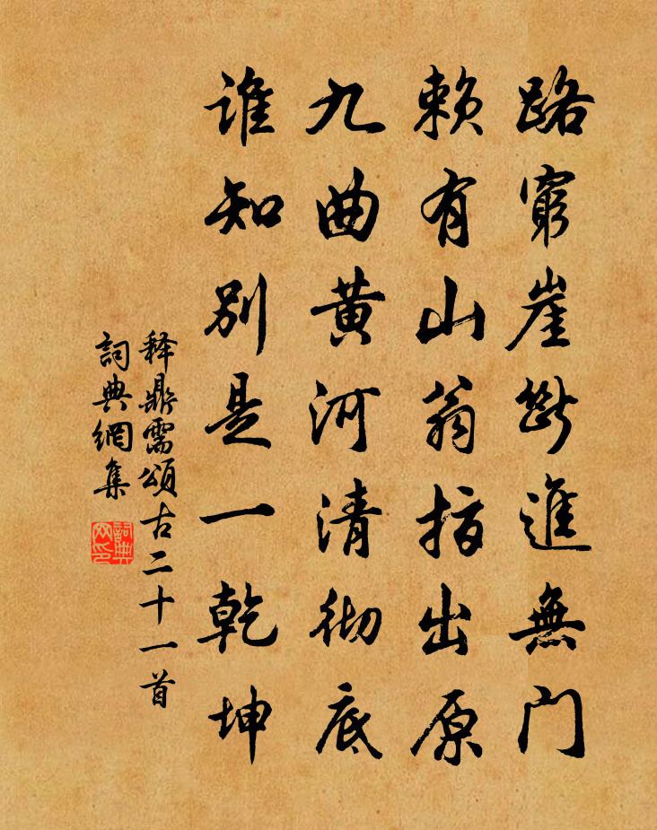 詩詞名句歷史字典書法欣賞書法字典國語詞典說文解字康熙字典古漢語字典標 題 作 者 詩 句 頌古二十一首作者:釋鼎需 朝代:宋代頌古二十一首原文路窮崖斷進無門,賴有山翁指出原。九曲黃河清徹底,誰知別是一乾坤。詩詞問答問:頌古二十一首的作者是誰?答:釋鼎需問:頌古二十一首寫於哪個朝代?答:宋代釋鼎需頌古二十一首書法欣賞頌古二十一首書法作品詩詞推薦浣溪沙·二月春花厭落梅晏幾道〔宋代〕二月春花厭落梅。仙源歸路碧桃催。渭城絲雨勸離杯。歡意似雲真薄倖,客鞭搖柳正多才。鳳樓人待錦書來。叔父給事輓詞十首黃庭堅〔宋代〕平生治獄有陰功,忠孝臨民父母同。贛上樵夫談卓令,宣城老吏識於公。投晁子止制置三首李流謙〔宋代〕讀書萬卷破,轉物一機神。道德欣為御,文章妙斲輪。聖賢同一處,天地要彌綸。汗簡窺千古,從來只數人。南柯子/南歌子周邦彥〔宋代〕膩頸凝酥白,輕衫淡粉紅。碧油涼氣透簾櫳。指點庭花低映,雲母屏風。恨逐瑤琴寫,書勞玉指封。等閒贏得瘦儀次韻弟觀用王介甫桃源行韻寫感為西湖行陳著〔宋代〕錢塘江頭駐龍馬,西湖風光甲天下。西湖西邊屋萬閒,中有沈沈醉花者。鶯鶯燕燕日日春,萍虀豆粥蠟代薪。黑殺句吳光〔宋代〕夢過一年還是魘,心更萬事竟成灰。折紅梅佚名〔宋代〕倚花闌清曉,裴回探得,南枝初綻。通春意、漏巧鬥奇,東君首先回暖。盈盈素麵。剛強點、胭脂深淺。是他自有平江尋吳薛叔不獲趙蕃〔宋代〕皋橋在何許,往者郊送翱。我行姑蘇城,半日空週遭。惟君昔我契,義不減同袍。珠林一杯酒,明朝隔江濤。年來家居陸游〔宋代〕老眊詩名減,登臨笑口開。釀泉為酒熟,倩鶴附書回。紗帽方簪菊,筇枝又探梅。清狂君勿笑,曾是薄蓬萊。王氏能遠樓范梈〔元代〕游莫羨天池鵬,歸莫問遼東鶴。人生萬事須自為,跬步江山即寥廓。請君得酒勿少留,為我痛酌王家能遠之高樓。回胡舜元賦稿李覯〔宋代〕一把長篇讀,驚嗟即過旬。誰知後來者,還似老成人。古訓但時習,英辭當日新。慚無稱薦力,空此見天麟。至浦城界聞武林失火而還陳藻〔宋代〕幾年要入武林游,今日中塗卻罷休。剩得紀行詩數首,前途有便是良謀。和李藍溪梅花韻黃庚〔宋代〕覓句逋仙琢肺肝,聲名千古冠吟壇。一詩香盡西湖水,白雪陽春和者難。書感楊再十一〔宋代〕楓江渡口草淒淒,桃浦橋邊夕照低。惟有舊家雙燕子,年年飛繞綠楊隄。白杜鵑花於石〔宋代〕蜀帝魂銷恨不窮,野花開落倚東風。吻乾無復枝頭血,幾度啼來染不紅。詠史下夏侯玄陳普〔宋代〕十家血染市朝紅,更漲餘波及李豐。老子莊生真毒手,子元子上即而翁。侍讀給事王公輓辭三首蘇頌〔宋代〕當代儒林老,誰知蘊學精。典章推練達,經術號通明。簪橐何時去,堂坊一旦成。漢庭傷賈傅,仕不至公卿。游深溪龍潭陳紀〔宋代〕危磴上嶙峋,泉聲靜更聞。雨添三尺水,僧臥半間雲。境勝詩難好,林深日易曛。忘言觀眾妙,一縷起爐熏。登九峰樓杜牧〔唐代〕晴江灩灩含淺沙,高低繞郭滯秋花。牛歌魚笛山月上,鷺渚鶖梁溪日斜。為郡異鄉徒泥酒,杜陵芳草豈無家。白頭寄贈陳杰〔宋代〕客里蕭蕭兩鬢秋,此身何止二宜休。禮文疏似嵇中散,疾病多於沈隱侯。愧我空餐有懸特,看君迎刃解全牛。夜來名句推薦長風幾萬里,吹度玉門關。李白《關山月》 風雨替花愁。風雨罷,花也應休。趙秉文《青杏兒·風雨替花愁》 冉冉秋光留不住,滿階紅葉暮。李煜《謝新恩·冉冉秋光留不住》 少年辛苦終身事,莫向光陰惰寸功。杜荀鶴《題弟侄書堂》 柳絲長,春雨細,花外漏聲迢遞。溫庭筠《更漏子·柳絲長》 雪聲偏傍竹,寒夢不離家。戎昱《桂州臘夜》 雙槳來時,有人似、舊曲桃根桃葉。姜夔《琵琶仙·雙槳來時》 倉稟無宿儲,徭役猶未已。韋應物《觀田家》 漠漠黃雲,濕透木棉裘。蔣捷《梅花引·荊溪阻雪》 閉門家裡坐,禍從天上來。馮夢龍《醒世恆言·卷十六》