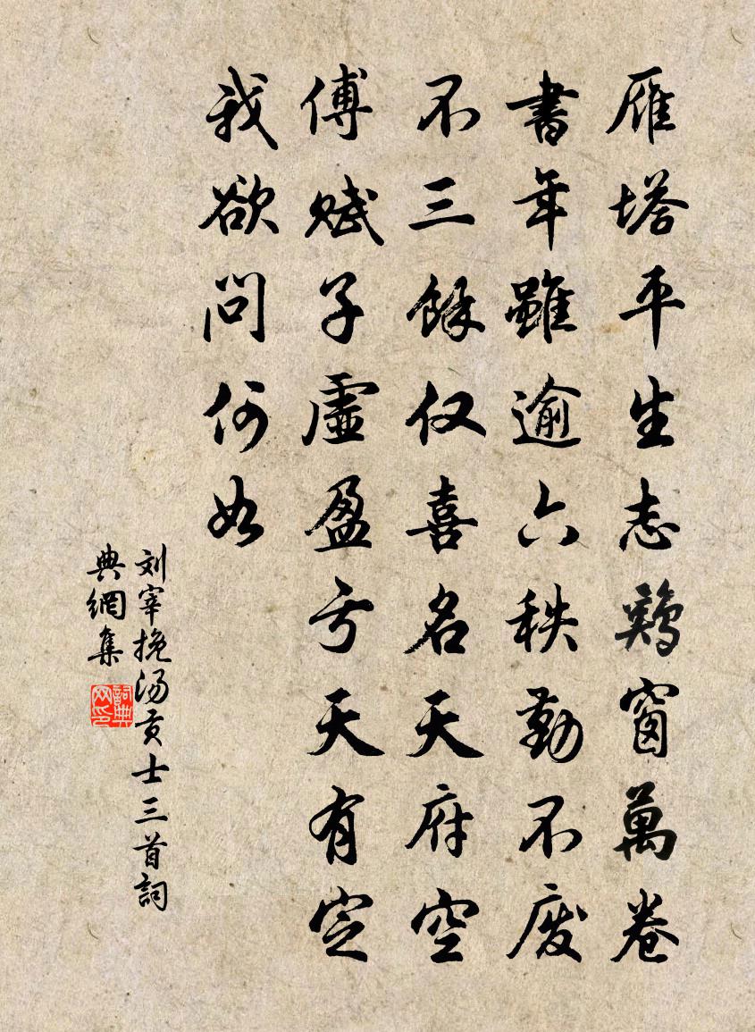 詩詞名句歷史字典書法欣賞書法字典國語詞典說文解字康熙字典古漢語字典標 題 作 者 詩 句 挽湯貢士三首作者:劉宰 朝代:宋代挽湯貢士三首原文雁塔平生志,雞窗萬卷書。年雖逾六秩,勤不廢不三餘。僅喜名天府,空傅賦子虛。盈虧天有定,我欲問何如。詩詞問答問:挽湯貢士三首的作者是誰?答:劉宰問:挽湯貢士三首寫於哪個朝代?答:宋代劉宰挽湯貢士三首書法欣賞挽湯貢士三首書法作品詩詞推薦詩一首張斗南〔宋代〕辭得官來性又便,恰如病馬解韁牽。雖無白日三聲喏,贏得清宵一枕眠。從軍詩王粲〔魏晉〕從軍有苦樂。但問所從誰。所從神且武。焉得久勞師。相公征關右。赫怒震天威。一舉滅獯虜。再舉服羌夷。西收簽判丈再枉長句次韻趙蕃〔宋代〕紛紛紅蕊一番春,寂寂清陰幾處新。陌上風光屬游女,林間觴詠聽幽人。經旬便作治聾飲,涉七還當修禊辰。無事作郡庠修學增田記成諸職事招飲王邁〔宋代〕頖宮輪奐一鮮明,多謝賢侯主夏盟,雞白碑成慚淺識,鵝黃酒滿認深情。回頭二十三年夢,接武千英萬俊名。來事代別張憲楊冠卿〔宋代〕老去安為客,春來不著家。江湖遂良覿,身世入長嗟。處死寧無地,謀生信有涯。分攜感時節,楊柳又藏鴉。游密庵三首劉子翬〔宋代〕半參樵徑繞危岑,仿佛精廬若可尋。怪底扶筇箸力健,暖風晴日送登臨。東屯呈同游諸公陸游〔宋代〕十月霜雕楓樹林,清溪白石稱幽尋。按行老子誅茆地,惆悵孤臣許國心。走馬平沙嫌路近,傳杯小閣喜寒侵。也思戚氏·晚秋天柳永〔宋代〕晚秋天,一霎微雨灑庭軒。檻菊蕭疏,井梧零亂,惹殘煙。悽然,望江關,飛雲黯淡夕陽間。當時宋玉悲感,向此小螳蜋歌楊萬里〔宋代〕清晨洗面開篷門,巨螳蜋在水上奔。前怒兩臂秋竹竿,後拖一腹春漁船。偶然拾得破蛛網,挈取四角沉重淵。柳上降香回燕汪元量〔宋代〕一從得玉旨,勒馬幽燕起。河北與河南,一萬五千里。有小白馬乘馭多時奉使東行至稠桑驛溘然而斃…題二十韻白居易〔唐代〕能驟復能馳,翩翩白馬兒。毛寒一團雪,鬃薄萬條絲。皂蓋春行日,驪駒曉從時。雙旌前獨步,五馬內偏騎。芳草西江月惠洪〔宋代〕大廈吞風吐月,小舟坐水眠空。霧窗春曉翠如蔥。睡起雲濤正涌。往事回頭笑處,此生彈指聲中。玉箋佳句敏驚鴻送襄陽馮主簿項安世〔宋代〕不隨黃綬去仇樓,歸著親前五色衣。安得紫皇知此意,喚教霜鳳帶雛飛。偈頌一百二十三首釋祖欽〔宋代〕禪禪碌碡,道道木頭。會得全無巴鼻,不會卻有來由,何似雲門六不收。望仙門晏殊〔宋代〕紫薇枝上露華濃。起秋風。管弦聲細出簾櫳。象筵中。仙酒斟雲液,仙歌轉繞樑虹。此時佳會慶相逢。慶相逢。歡水仙廖行之〔宋代〕擢擢瓊簪秀,盈盈玉頰新。隴梅真季孟,洛浦是精神。好在臨江佩,遙憐步月塵。對花惱詩思,何必霅溪蓴。史天休中散輓詞黃庭堅〔宋代〕光祿九男君獨秀,賦名幾與景仁班。淹留州縣看恬默,出入風波笑險艱。遺愛蜀中三郡有,退身林下十年閒。山川賀鄭丞相厲寺正〔宋代〕天地鍾奇在鄞鄮,代產真儒傳袞繡。明良千載會風雲,虎拜萬年同國壽。風蟬賈島〔唐代〕風蟬旦夕鳴,伴葉送新聲。故里客歸盡,水邊身獨行。噪軒高樹合,驚枕暮山橫。聽處無人見,塵埃滿甑生。謁金門黃機〔宋代〕風又雨。牆外落紅無數。人不歸來春不住。佳期還已誤。細細一團愁緒,薄倖疏狂何處。化作青鸞飛得去。問天天名句推薦萬物靜觀皆自得,四時佳興與人同。程顥《秋日》 第四橋邊,擬共天隨住。姜夔《點絳唇·丁未冬過吳松作》 伏屍百萬,流血漂櫓。賈誼《過秦論》 浮雲蔽白日,遊子不顧返。佚名《行行重行行》 夫淺知之所爭者,末矣。列子及其弟子《列子·說符》 東風裊裊泛崇光,香霧空濛月轉廊。蘇軾《海棠·東風裊裊泛崇光》 華燈縱博,雕鞍馳射,誰記當年豪舉。陸游《鵲橋仙·華燈縱博》 離離原上草,一歲一枯榮。白居易《草 / 賦得古原草送別》 落木蕭蕭,琉璃葉下瓊葩吐。王十朋《點絳唇·素香丁香》 君去滄江望澄碧,鯨鯢唐突留餘跡。李白《赤壁歌送別》