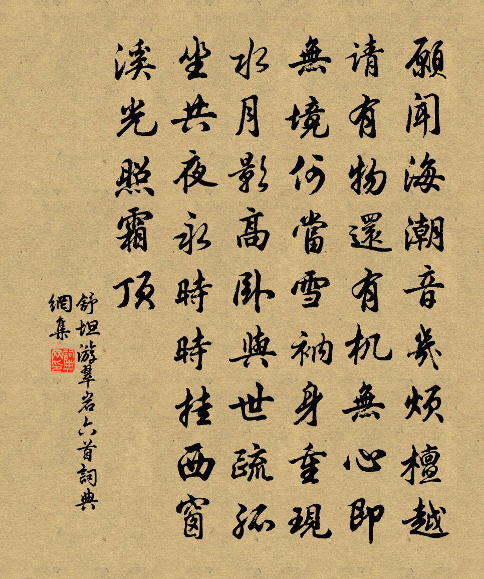 詩詞名句歷史字典書法欣賞書法字典國語詞典說文解字康熙字典古漢語字典標 題 作 者 詩 句 游翠岩六首作者:舒坦 朝代:宋代游翠岩六首原文願聞海潮音,幾煩檀越請。有物還有機,無心即無境。何當雪衲身,重現水月影。高臥與世疏,孤坐共夜永。時時掛西窗,溪光照霜頂。詩詞問答問:游翠岩六首的作者是誰?答:舒坦問:游翠岩六首寫於哪個朝代?答:宋代舒坦游翠岩六首書法欣賞游翠岩六首書法作品詩詞推薦滿庭芳馬鈺〔元代〕家緣猛棄,更不疑惑。辨認陰魂陽魄。咄出屍蟲,屏盡氣財酒色。好事先人後己,做憨憨、有似彌勒。修大道,處贈李溟秀才棲白〔唐代〕南居古廟深,高樹宿山禽。明月上清漢,騷人動楚吟。數篇正始韻,一片補亡心。孤悄欺何謝,雲波不可尋。讀竹溪詩一首劉克莊〔宋代〕不敢匆匆看,晴窗幾絕編。參它少陵髓,饒得弈秋先。友願低頭拜,師曾枕膝傳。已將牌印子,牒過竹溪邊。雙雙燕·詠燕史達祖〔宋代〕過春社了,度簾幕中間,去年塵冷。差池欲住,試入舊巢相併。還相雕梁藻井,又軟語商量不定。飄然快拂花梢,自南京之陳宿柘城張耒〔宋代〕荒城人稀荊棘老,野兔驚跳出寒草。蒼蒼落日黃雲西,驅馬城邊尋古道。入門四顧皆桑田,居民三五依道邊。暮投張良黎廷瑞〔宋代〕博浪揮椎處,惓惓報國讎。如何銷印事,獨不為韓謀。偈十三首釋法泰〔宋代〕開口有時非,開口有時是。粗言及細語,皆歸第一義。釋迦老子碗鳴聲,達磨西來屎臭氣。惟有山前水牯牛,身放中宵杜甫〔唐代〕西閣百尋餘,中宵步綺疏。飛星過水白,落月動沙虛。擇木知幽鳥,潛波想巨魚。親朋滿天地,兵甲少來書。梅花張道洽〔宋代〕和靖風流百世長,吟魂依舊化幽芳。已枯半樹風煙古,才放一花天地香。不肯面隨春冷暖,只將影共月行藏。懸知中秋夜作去年今夕仆自北關過吳興趙蕃〔宋代〕明月同千里,寒鄉又一秋。床隨檜陰側,巾與桂香浮。此夕山中趣,它年霅上游。諸兒皆楚語,老子自商謳。君子堂小集仇遠〔宋代〕樂歲欣逢節序新,公堂稱兕集嘉賓。衣冠尚想江東舊,芹藻初回泮水春。無事聊為文字飲,相看總是老成人。一瓶賦樓提乾古檜因贈其之官陳著〔宋代〕我行晝錦坊,老檜欺眼碧。樛枝巧相扶,眾星拱月璧。人力固有待,面勢本天則。愛益雨露深,風霜莫能賊。維黃送吳季野梅堯臣〔宋代〕贈言必有規,無規固無言。強言苟無補,何異秋蟲喧。君行蜀道難,不厭治輕軒。母歿未歸土,女長未出門。誰能月下自三橋泛湖歸三山陸游〔宋代〕素璧初升禹廟東,天風為我送孤篷。山橫玉海蒼茫外,人在水壺縹緲中。茅舍燈青聞吠犬,蘋汀煙淡見驚鴻。白頭試宣毫張煒〔宋代〕中山瑞獸久不出,天下筆工徒負名。近聞宛陵獲數輩,束縛管制差專精。攜入京師求鑑賞,一見不以他毫輕。呼童頌古十六首釋心月〔宋代〕賓中主,主中賓。在窟獅子,互換嚬呻,相識如今能幾人。送魯公卷之汶陽吳則禮〔宋代〕投策上前坂,薄暮寒雲滋。華轂不可停,奈此長相思。雁影正疾逝,馬鳴一何悲。歸期無淹留,黃花殊未衰。秋思陸游〔宋代〕稽山九十翁,病起無氣力。擁杖牧雞豚,乃是老人職。一杯芋糝羹,孫子喚翁食。既飽負朝陽,自愧爾何德!過黃泥坂袁說友〔宋代〕牽車緩上黃泥坂,復嶺重崗甚前日。躋攀千級下如之,十里三山三降陟。平生兩腳疲辛酸,歲晚行路熟蹣跚。人言過淨慈傅無文竹院退居顧逢〔宋代〕李涉題詩處,軒窗一室明。遊人閒半日,老子樂餘生。碧落雲無影,清風竹有聲。自言身後事,龕塔已圓成。名句推薦可憐日暮嫣香落,嫁與春風不用媒。李賀《南園十三首》 我本不棄世,世人自棄我。李白《送蔡山人》 酌酒與君君自寬,人情翻覆似波瀾。王維《酌酒與裴迪》 二月春花厭落梅。仙源歸路碧桃催。渭城絲雨勸離杯。晏幾道《浣溪沙·二月春花厭落梅》 深居俯夾城,春去夏猶清。李商隱《晚晴》 凌余陣兮躐余行,左驂殪兮右刃傷。屈原《國殤》 君不見,黃河之水天上來,奔流到海不復回。李白《將進酒》 彩線輕纏紅玉臂,小符斜掛綠雲鬟。蘇軾《浣溪沙·端午》 山雪河冰野蕭瑟,青是烽煙白人骨。杜甫《悲青坂》 垂楊低映木蘭舟。半篙春水滑,一段夕陽愁。晁補之《臨江仙·綠暗汀洲三月暮》
