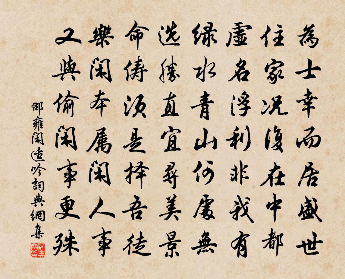 詩詞名句歷史字典書法欣賞書法字典國語詞典說文解字康熙字典古漢語字典標 題 作 者 詩 句 閒適吟作者:邵雍 朝代:宋代閒適吟原文為士幸而居盛世,住家況復在中都。虛名浮利非我有,綠水青山何處無。選勝直宜尋美景,命儔須是擇吾徒。樂閒本屬閒人事,又與偷閒事更殊。詩詞問答問:閒適吟的作者是誰?答:邵雍問:閒適吟寫於哪個朝代?答:宋代邵雍閒適吟書法欣賞閒適吟書法作品詩詞推薦登石室二首葉林〔宋代〕石徑春深疊古苔,洞天無鑰為誰開。白雲本是無心物,風趁松花作雨來。梅花七律張道洽〔宋代〕天姿雅澹似高人,萬樹千紅總後塵。花蚤花遲兩年景,枝南枝北一家春。輕輕欲折還休去,得得相看不厭頻。坐到和孔密州五絕 見邸家園留題蘇軾〔宋代〕大旆傳聞載酒過,小詩未忍著磚磨。陽關三疊君須秘,除卻膠西不解歌。(來詩有渭城之句。)東軒小室即事五首曾幾〔宋代〕鼠跡印塵幾,蝸涎篆書帷。兒童勿除去,佳處正在茲。人言有何好,此段真成痴。俗子徒敗意,幽懷定誰知。次韻子瞻見寄蘇轍〔宋代〕袞袞河渭濁,皎皎江漢清。源流既自異,美惡終未明。嗟我頑鈍質,乃與公並生。出處每自托,謳吟輒嘗賡。譬如次韻秦少游王仲至元日立春三首蘇軾〔宋代〕省事天公厭兩回,新年春日並相催。殷勤更下山陰雪,要與梅花作伴來。己卯嘉辰壽阿同,願渠無過亦無功。明年爛柯山四首。石室二禪師劉迥〔唐代〕繩床宴坐久,石窟絕行跡。能在人代中,遂將人代隔。白雲風颺飛,非欲待歸客。贈泗口苗居士鄭谷〔唐代〕歲晏樂園林,維摩契道心。江雲寒不散,庭雪夜方深。酒勸漁人飲,詩憐稚子吟。四郊多壘日,勉我舍朝簪。送桑澤還天台王廉清〔宋代〕桃花風起竹輿寒,寒食天晴石路乾。正是東君好春色,不妨詞客駐歸鞍。金聲賦就方騰踏,鐵硯才高尚考槃。如到陪致政開府太師留守相公致內翰燕集輒歌盛美司馬光〔宋代〕眉似高僧秀,顏如童子紅。忠純汲長孺,高潔夏黃公。矯矯遼東鶴,冥冥塞北鴻。自誇新酒量,豫想百分空。何太宰生日二首強至〔宋代〕河嶽靈神擁瑞來,劍川一夜起雲雷。祥風破臘吹灰琯,和氣先春報砌槐。龍邸久膺心膂托,金甌終為姓名開。年年桃李花張舜民〔宋代〕花如桃李人如玉,終日看花看不足。萬年枝上囀春風,七絲弦上調新曲。寶馬嘶風車擊轂,東市鬥雞西市鞠。但得詠蟬陸蒙老〔宋代〕綠蔭深處汝行藏,風露從來是稻粱。莫倚高枝縱繁響,也宜回首顧螳螂。拂霓裳晏殊〔宋代〕喜秋成。見千門萬戶樂昇平。金風細,玉池波浪縠文生。宿露沾羅幕,微涼入畫屏。張綺宴,傍熏爐蕙炷、和新聲次子蒼寄余清老韻吳則禮〔宋代〕從來三仕及三已,總落道人坐定里。滑稽社中黃髮將,詎與阿朔論輩行。平生芋魁曾未錯,粱肉寧殊腐腸藥。百年周路分輓詞樓鑰〔宋代〕蚤負功名志,從戎豈素心。治軍先肅靖,遊藝亦精深。湖海開豪氣,雲天廓義襟。高門尚餘慶,蘭玉正森森。已亥雜詩 84龔自珍〔清代〕白面儒冠已問津,生涯只羨五侯賓。蕭蕭黃葉空村畔,可有擁書閉戶人。陪太原鄭行軍中丞登汾上閣中丞詩曰汾樓…輒書即事上答歐陽詹〔唐代〕并州汾上閣,登望似吳閶。貫郭河通路,縈村水逼鄉。城槐臨枉渚,巷市接飛梁。莫論江湖思,南人正斷腸。水調歌頭汪莘〔宋代〕堯舜去已遠,稷契不重來。周流天上地下,我馬亦悠哉。君向雲中獨立,知與何人相俟,孔蓋逐風回。長憶目成處重陽陪諸鄉丈游水樂洞過風篁嶺龍井張飲觀雨程公許〔宋代〕凜秋天氣佳,令節天賜沐。客居意莫展,勝賞諾已宿。風澹湖不波,霧斂山更簇。畫舫厭囂喧,筍輿恣追逐。間尋名句推薦兩句三年得,一吟雙淚流。賈島《題詩後》 烈士暮年,壯心不已。曹操《龜雖壽》 象龍喚不應,竹龍起行雨張孝祥《湖湘以竹車激水粳稻如雲書此能仁院壁》 花漸凋疏不耐風,畫簾垂地晚重工,墮階縈蘚舞愁紅孫光憲《浣溪沙·花漸凋疏不耐風》 物格而後知至,知至而後意誠,意誠而後心正,心正而後身修,身修而後家齊,家齊而後國治,國治而後天下平。曾子《禮記·大學》 三春已暮花從風,空留可憐與誰同。蕭衍《東飛伯勞歌》 倉廩實,則知禮節;衣食足,則知榮辱管仲《管子·牧民》 廬山秀出南斗傍,屏風九疊雲錦張。李白《廬山謠寄盧侍御虛舟》 欲渡黃河冰塞川,將登太行雪滿山。李白《行路難·其一》 鳳凰台上鳳凰游,鳳去台空江自流。李白《登金陵鳳凰台》