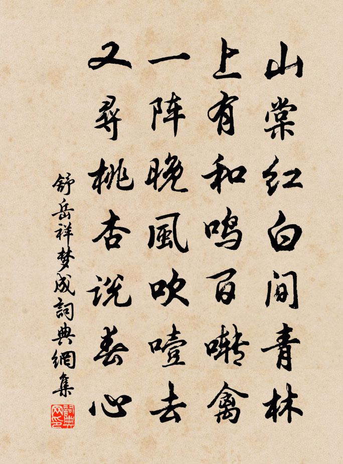 詩詞名句歷史字典書法欣賞書法字典國語詞典說文解字康熙字典古漢語字典標 題 作 者 詩 句 夢成作者:舒岳祥 朝代:宋代夢成原文山棠紅白間青林,上有和鳴百囀禽。一陣晚風吹噎去,又尋桃杏說春心。詩詞問答問:夢成的作者是誰?答:舒岳祥問:夢成寫於哪個朝代?答:宋代舒岳祥夢成書法欣賞夢成書法作品詩詞推薦蒜嶺夜行劉克莊〔宋代〕嶺頭無復一人來,漁店收燈戶不開。鬆氣滿山涼似雨,海聲中夜近如雷。擬披醉發橫簫去,只寄鄉書與劍回。他日採石汪元量〔宋代〕夜泊青山下,江空不受塵。只看波底月,便是謫仙人。好事近趙士暕〔宋代〕剪蠟綴寒條,標韻自然奇絕。不待隴頭春信,喜一枝先折。壽陽妝鑒曉初開,殘柍若飛雪。何似嫩黃新蕊,映眉心感皇恩 夏日,同延陵君遇簽事順之心遠堂,王惲〔元代〕書葉散芸香,牙*無數。案上藜羹當膏乳。地偏心遠,日與聖賢晤語。市聲飛不到、橫披處。一炷龍涎,滿甌春露狗子無佛性釋心道〔宋代〕狗子佛性無,老蚌吐明珠。西川鳴杜宇,江南啼鷓鴣。有念羅公升〔宋代〕方招東渚魂,又送北阡窆。交遊亦余幾,日覺眼中欠。向來所憎者,一一皆可念。憂愁鬢先霜,形影吾自厭。春華和傅郎歲暮還湘洲詩陰鏗〔南北朝〕蒼落歲欲晚,辛苦客方行。大江靜猶浪,扁舟獨且征。棠枯絳葉盡,蘆凍白花輕。戍人寒不望,沙禽迥未驚。湘波明堂慶成詩文天祥〔宋代〕淳熙稽古再明禋,製作規模汶上新。未植羽旄朝萬國,首將玉幣薦三神。靈車欲下天先雨,御幄虛張帝在茵。熙事九日次韻王鞏蘇軾〔宋代〕我醉欲眠君罷休,已教從事到青州。鬢霜饒我三千丈,詩律輸君一百籌。聞道郎君閉東閣,且容老子上南樓。相逢平江守禱晴即應時近元夕矣寄呈五絕句仲並〔宋代〕丹邱雨裹看春回,密霧濃雲撥不開。怪底寒窗烘曉日,朱轓親禱梵宮來。慰嚴溪張君貢士何夢桂〔宋代〕朝日景曈曈,湛露溘已晞。日暮風淒淒,啼鳥失其雛。時邁感物化,撫事成傷悲。嚴溪子張子,有兒讀父書。年少漢宮春康與之〔宋代〕雲海沈沈,峭寒收建章。雪殘鳷鵲。華燈照夜,萬井禁城行樂。春隨鬢影,映參差、柳絲梅萼。丹禁杳,鰲峰對聳宿溪館趙汝鐩〔宋代〕投宿溪頭館,途長主僕飢。濕薪難便著,惡米更須篩。風細帆來穩,山高月上遲。客懷正悽惻,漁笛蓼洲吹。送方衣民罷官東歸胡仲弓〔宋代〕咄咄復咄咄,北地多霜雪。誰能路坦夷,驥足亦遭跌。天地本不惡,鳳翅乃爾折。材大用則小,人巧已則拙。問訊傷曾秀才馬劉威〔唐代〕買得龍媒越水濆,輕桃細杏色初分。秋歸未過陽關日,夜魄忽銷陰塞雲。吳練已知隨影沒,朔風猶想帶嘶聞。臨軒隱淺挺之平甫來飲梅堯臣〔宋代〕泛淮忌水大,我行浩以漫。泝汴忌水淺,我行幾以乾。偶與困滯並,將獨為此難。窮堤有來客,芬芳可與言。共休送陸三出尉錢起〔唐代〕春草晚來色,東門愁送君。盛才仍下位,明代負奇文。且樂神仙道,終隨鴛鷺群。梅生寄黃綬,不日在青雲。樓居狂吟吳龍翰〔宋代〕覓得樓中一覺眠,將身化蝶入壺天。平生睡債何時足,春在梅花紙帳邊。夜飲一首蘇籀〔宋代〕微生無限死之徒,瓦解絲棼不易圖。一簣區區裨大壞,力行踽踽競長途。韜鈐籌策皆摧折,文籍條綱總闊疏。誰料沁園春呂岩〔唐代〕七返還丹,在我先須,煉已待時。正一陽初動,中宵漏永,溫溫鉛鼎,光透簾幃。造化爭馳,虎龍 * ,進火功夫名句推薦長江如虹貫,蟠繞其下。宋濂《閱江樓記》 江山如有待,花柳自無私。杜甫《後游》 萬事莫貴於義。墨子《墨子·47章 貴義》 提籠忘采葉,昨夜夢漁陽。張仲素《春閨思》 松葉堪為酒,春來釀幾多。張九齡《答陸澧》 若耶溪傍採蓮女,笑隔荷花共人語。李白《採蓮曲》 從今若許閒乘月,拄杖無時夜叩門。陸游《游山西村》 君在陰兮影不見,君依光兮妾所願。傅玄《車遙遙篇》 盡道豐年瑞,豐年事若何羅隱《雪》 明妃一朝西入胡,胡中美女多羞死。李白《于闐採花》