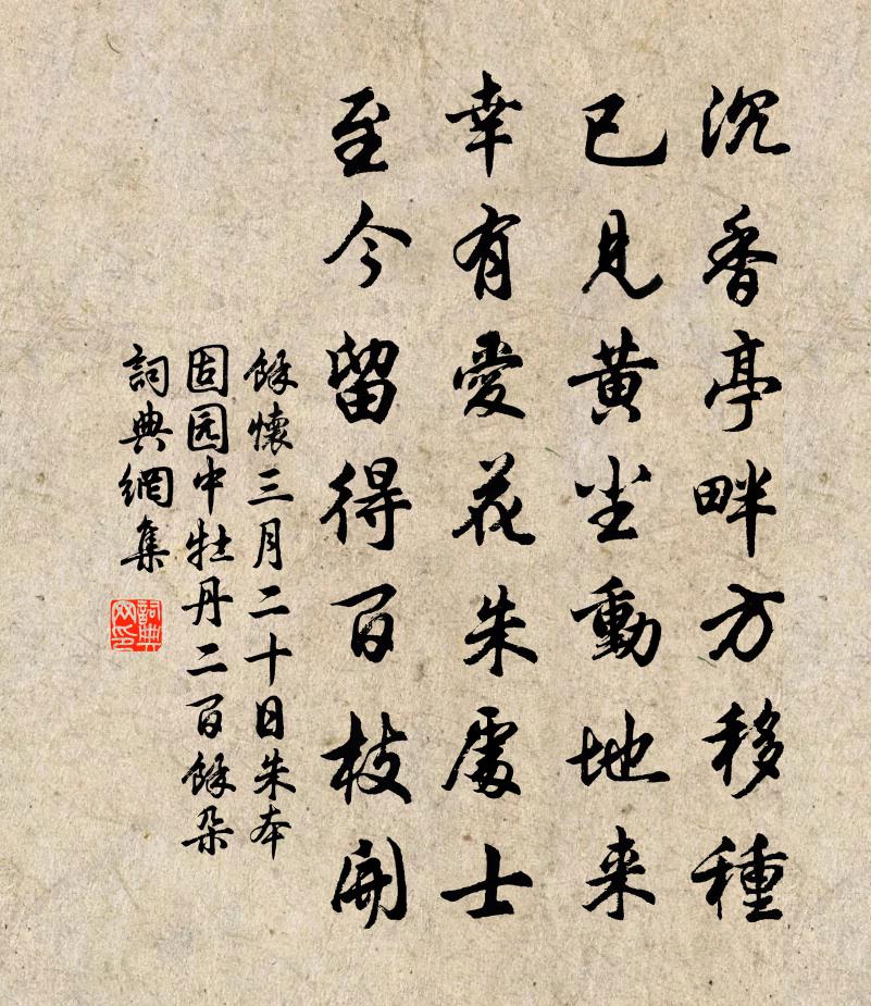 詩詞名句歷史字典書法欣賞書法字典國語詞典說文解字康熙字典古漢語字典標 題 作 者 詩 句 三月二十日朱本固園中牡丹二百餘朵作者:余懷 朝代:清代原文沉香亭畔方移種,已見黃塵動地來。幸有愛花朱處士,至今留得百枝開。詩詞問答問:《三月二十日朱本固園中牡丹二百餘朵》的作者是誰?答:余懷問:該詩寫於哪個朝代?答:清代問:該詩是什麼體裁?答:七絕書法欣賞三月二十日朱本固園中牡丹二百餘朵書法作品詩詞推薦花前嘆白居易〔唐代〕前歲花前五十二,今年花前五十五。歲課年功頭髮知,從霜成雪君看取。[五年前在杭州有詩云:五十二人頭似霜清心鏡 贈鐵李先生馬鈺〔元代〕隴西公,苦得別。六月爐頭,掉錘打鐵。養渾家、都要清閒,獨自受炙*。火燒瘡,汗滴血。萬苦千辛,何時是徹頌古十首釋曇華〔宋代〕大海波濤涌,千江水逆流。龍王宮殿裹,不見一人游。酬張秘書因寄馬贈詩裴度〔唐代〕滿城馳逐皆求馬,古寺閒行獨與君。代步本慚非逸足,緣情何幸枉高文。若逢佳麗從將換,莫共駑駘角出群。飛控孟子終身慕父母陳普〔宋代〕外物安能亂本真,終天眷慕受恩深。大人所在元無壞,不失初來赤子心。贈別藤州法曹南劍張仲明曾豐〔宋代〕黃卷堆胸次,青雲出筆頭。小迂蓬島步,聊作嶺南遊。穩口開三語,平心活一州。陰功終有報,會見襲封侯。鳴峰岩黃岩孫〔宋代〕卓道當年愛此峰,直於頂上駐禪筇。岩深疑有仙人宅,地僻全無俗客蹤。罅石引泉圍古屋,斷煙拖露滴寒松。夜來江亭晚思陸游〔宋代〕本自無閒況有忙,遠坊兀兀送年光。太空不礙雲舒捲,高枕寧論夢短長。山破霽煙千萬疊,鳥橫潮浦兩三行。年來望巫山張喬〔唐代〕溪疊雲深轉谷遲,暝投孤店草蟲悲。愁連遠水波濤夜,夢斷空山雨雹時。邊海故園荒後賣,入關玄發夜來衰。東歸探得李李世民〔唐代〕盤根直盈渚,交乾橫倚天。舒華光四海,卷葉蔭三川。南浦·春水張炎〔宋代〕波暖綠粼粼,燕飛來、好是蘇堤才曉。魚沒浪痕圓,流紅去、翻笑東風難掃。荒橋斷浦,柳陰撐出扁舟小。回首池句吳璋〔宋代〕衣無錦繡勞心織,味乏膏粱困舌耕。寄龍山譚使君五首黎廷瑞〔宋代〕流離遷徙古今同,澹沲青山往事空。四壁蟲聲秋思苦,夢中猶豫自奏豳。聞周茂叔中年有嗣以詩賀之何平仲〔宋代〕慶門崇構已多時,五百年方是此期。樹長瓊枝生較晚,珠根驪頷得來遲。桓溫貴骨天然別,韋相傳經道不衰。衡岳送信南歸雁盪山釋希晝〔宋代〕千峰鄰積水,秋勢遠相依。路在深雲里,人思絕頂歸。長天來月正,危木度猿稀。誰得同無念,寥寥此掩扉。漫天嶺張先〔宋代〕不獨高明不可謾,仍知不似泰山安。五丁破道秦通蜀,卻被行人腳下看。古八變歌佚名〔兩漢〕北風初秋至,吹我章華台。浮雲多暮色,似從崦嵫來。枯桑鳴中林,絡緯響空階。翩翩飛蓬征,愴愴遊子懷。故鄉郊廟歌辭。晉朝饗樂章。群臣酒行歌佚名〔唐代〕劍佩儼如林,齊傾拱北心。渥恩頒美祿,鹹濩聽和音。一德君臣合,重瞳日月臨。歌時兼樂聖,唯待贊泥金。萬國南康縣圃賞梨花呈長官趙必象〔宋代〕種花之暇點春芳,把酒花邊試洗妝。差勝當年潘令尹,空載桃李滿河陽。送從弟徹東歸張籍〔唐代〕緱山領印知公奏,才稱同時盡不如。奉使賀成登冊禮,陪班看出降恩書。去回在路秋塵里,受詔辭歸曉漏初。早晚名句推薦晚來天,空悄然,孤眠,枕檀雲髻偏。孫光憲《河傳·花落》 寡助之至,親戚畔之;多助之至,天下順之。孟子《孟子·公孫丑章句下·第一節》 兒童相見不相識,笑問客從何處來。賀知章《回鄉偶書二首·其一》 白髮悲明鏡,青春換敝裘。岑參《武威春暮聞宇文判官西使還已到晉昌》 風雨送春歸,飛雪迎春到。 * 《卜運算元·詠梅》 故人在其下,塵土相豗蹴。蘇軾《送頓起》 青苔滿階砌,白鳥故遲留。杜牧《題揚州禪智寺》 正雁水夜清,臥虹平帖。吳文英《暗香·送魏句濱宰吳縣解組分韻得闔字》 疏雨池塘見,微風襟袖知。賀鑄《南歌子·疏雨池塘見》 和平處事,勿矯俗為高;正直居心,勿設機以為智。王永彬《圍爐夜話·第六五則》