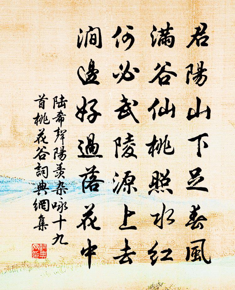 詩詞名句歷史字典書法欣賞書法字典國語詞典說文解字康熙字典古漢語字典標 題 作 者 詩 句 陽羨雜詠十九首。桃花谷作者:陸希聲 朝代:唐代陽羨雜詠十九首。桃花谷原文君陽山下足春風,滿谷仙桃照水紅。何必武陵源上去,澗邊好過落花中。詩詞問答問:陽羨雜詠十九首。桃花谷的作者是誰?答:陸希聲問:陽羨雜詠十九首。桃花谷寫於哪個朝代?答:唐代陸希聲陽羨雜詠十九首。桃花谷書法欣賞陽羨雜詠十九首。桃花谷書法作品詩詞推薦雜詠一百首靈照劉克莊〔宋代〕首如飛蓬亂,家賣漉籬供。老漢驚吾女,禪機捷乃翁。蕭宅二三子贈答詩二十首客贈石盧仝〔唐代〕竹下青莎中,細長三四片。主人雖不歸,長見主人面。送新羅法師還國孫逖〔唐代〕異域今無外,高僧代所稀。苦心歸寂滅,宴坐得精微。持缽何年至,傳燈是日歸。上卿揮別藻,中禁下禪衣。海闊滿庭芳(壽平交五十)彭止〔宋代〕月閏清秋,時逢誕節,畫堂瑞氣多多。遙瞻南極,瑞彩照盤坡。好是年才五十,身當貴、福比山河。無些事,方裙自詠白居易〔唐代〕須白面微紅,醺醺半醉中。百年隨手過,萬事轉頭空。臥疾瘦居士,行歌狂老翁。仍聞好事者,將我畫屏風。禹柏李曾伯〔宋代〕奕奕衡山禹甸之,功成手植萬年枝。蒼然柯派孤根出,如郵九州疏濬時。武夷九曲棹歌留元剛〔宋代〕七曲催船快上灘,好山留與漫郎看。經行雪瀑仙屏下,恍記齊雲夜帳寒。自罷河南,已換七尹,每一入府,悵然舊遊,白居易〔唐代〕每日河南府,依然似到家。杯嘗七尹酒,樹看十年花。[七尹酒味不同,備嘗之矣。即府中新果園。]且健須歡喜句許元〔宋代〕芍藥瓊花應有恨,維揚新什獨無名。內直奉寄聖俞博士歐陽修〔宋代〕千門鑰入斷人聲,樓閣沉沉夜氣生。獨直偏知宮漏永,稍寒尤覺玉堂清。霜雲映月鱗鱗色,風葉飛空摵摵鳴。犬馬落葉王令〔宋代〕暮秋木落剝霜紅,俄覺平林一夜空。茂遂本憑枝幹力,卻辭枝幹逐西風。至節前十日游勝因寺洪咨夔〔宋代〕霜霽午羲暖,潦收沙路晞。束山知寺古,避客怪僧稀。籜滑涉危屐,藤鉤穿密衣。月黃風不動,燈火虹橋歸。和林和靖先生梅韻胡銓〔宋代〕紛紛紅紫勿相猜,自古騷人酷嗜梅。皂蓋折花憐老杜,黃梅時雨憶方回。一生耐凍天憐惜,滿世趨炎我獨來。桃李晝夜樂 藏頭 重陽全真集卷之十三王哲〔元代〕金相隔休教錯。年間怎生作。前頭說甚惺惺,辰下重安手腳。被蟾光晷運交,平時從根摸索。事有神功,清強氣躍讀史陸游〔宋代〕蕭相守關成漢業,穆之一死宋班師。赫連拓跋非難取,天意從來未易知。奉敕祭西太一和韓川韻四首蘇軾〔宋代〕陂水初含曉淥,稻花半作秋香。皂蓋卻迎朝日,紅雲正繞宮牆。成父以子進釀法為酒酒成許分貺趣之以詩並呈趙蕃〔宋代〕蘇仙盡飲不滿勺,平生願求酒方略。空山松桂不使間,必使捐糜效斟酌。自言坐客有酣適,已雖獨醒同醉樂。是心素馨朱翌〔宋代〕眾香發越充南溟,梅花腦冰水弄沉。露積旃檀薪降真,薰陸光射琉璃缸。山川草木一天芬,素質如玉備眾馨。烏髻贈青龍印禪師李洞〔唐代〕雨澀秋刀剃雪時,庵前曾禮草堂師。居人昨日相過說,鶴已生孫竹滿池。賢者之孝二百四十首張志寬林同〔宋代〕何忽省母病,每因身疾知。可憐張里正,尚得令君疑。名句推薦雲鬟綠鬢罷梳結,愁如回飆亂白雪。李白《久別離》 無端聽畫角,枕畔紅冰薄。納蘭性德《菩薩蠻·朔風吹散三更雪》 松竹翠蘿寒,遲日江山暮。曹組《卜運算元·蘭》 如來者即諸法如義。鳩摩羅什譯《金剛經·究竟無我》 月照城頭烏半飛,霜淒萬樹風入衣。李頎《琴歌》 性孤高似柏,阿嬌金屋。陸容《滿江紅·詠竹》 人行事施予,以利之為心,則越人易和;以害之為心,則父子離且怨。韓非及後人《韓非子·外儲說左上》 遠看山有色,近聽水無聲王維《畫》 白馬誰家子,黃龍邊塞兒。李白《獨不見》 只恐夜深花睡去,故燒高燭照紅妝。蘇軾《海棠》