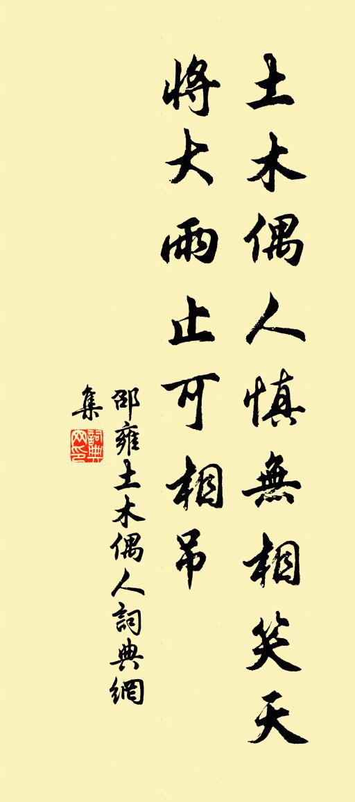 詩詞名句歷史字典書法欣賞書法字典國語詞典說文解字康熙字典古漢語字典標 題 作 者 詩 句 土木偶人作者:邵雍 朝代:宋代土木偶人原文土木偶人,慎無相笑。天將大雨,止可相吊。詩詞問答問:土木偶人的作者是誰?答:邵雍問:土木偶人寫於哪個朝代?答:宋代邵雍土木偶人書法欣賞土木偶人書法作品詩詞推薦送杜觀罷舉東遊姚合〔唐代〕秋風離九陌,心事豈雲安。曾是求名苦,當知此去難。辛勤程自遠,寂寞夜多寒。詩句無人識,應須把劍看。河陽石尚書破回鶻、迎貴主、過上黨射鷺鶿,白居易〔唐代〕塞北虜郊隨手破,山東賊壘掉鞭收。烏孫公主歸秦地,白馬將軍入潞州。劍拔青鱗蛇尾活,弦抨赤羽火星流。須知酴醿滕岑〔宋代〕群芳誰不讓天柔,笑殺金沙敢並游。少借余妍入樽酒,真堪一斗博涼州。九用喜雨韻三首吳潛〔宋代〕何消黍稷薦馨香,三尺抬頭即昊蒼。雨缶決來如此溢,風車輸與自然涼。問他金玉堆成塢,更使珠璣積在箱。逢卻秋夜獨醉戲歸陸游〔宋代〕弊袍羸馬遍天涯,恰似伶優著處家。社瓮嫩醅初泛蟻,寒缸殘燼自成花。幽窗照影烏巾折,醉手題詩淡墨斜。莫恨姑蘇台吳錫疇〔宋代〕歌舞聲消跡已陳,危台今日壓城闉。麋游莫恨終亡國,誰把鴟夷載諫臣。長沙六快詩王揆〔唐代〕湖外風物奇,長沙信難續。衡峰排古青,湘水湛寒綠。舟楫通大江,車輪會平陸。昔賢官是邦,仁澤流豐沃。今賢癸巳小至艾性夫〔宋代〕舌在貧何害,脾清瘦不妨。天心半夜子,道脈一分陽。山色春秋老,梅花天地香。半爐煨芋火,意味頗悠長。卜居屈原〔先秦〕 屈原既放,三年不得復見。竭知盡忠而蔽障於讒。心煩慮亂,不知所從。乃往見太卜鄭詹尹曰:“余有所疑,謹和老人初冬寓筆十絕洪咨夔〔宋代〕避風台上深情寵,偃月堂中盡意謀。爭奈天公無面目,滿林黃葉一番秋。戊申年七夕五絕薛映〔宋代〕銀河耿耿露溥溥,彩縷金針玉佩環。天媛貪忙為靈匹,幾時留巧與人間。泳山屐趙湘〔唐代〕鳥道人分去,同行只有筇。過橋泉照齒,穿竹蘚留蹤。夜閣吟登月,秋山醉掛松。自窺還憶謝,會著在諸峰。挽陳提舉趙善括〔宋代〕藺璧雖期復,蘇書竟不還。慶余鍾令緒,才大壓塵寰。勁正三朝老,從容半世閒。會心真是老,一笑別人間。減字木蘭花(水仙花)韋驤〔宋代〕雕闌香砌。紅紫妖韶何足計。爭似幽芳。幾朵先春蘸碧塘。玉盤金盞。誰謂花神情有限。綽約仙姿。仿佛江皋解佩雲邊許月卿〔宋代〕雲邊人種麥,天際我歸舟。月色輕寒夜,笛聲何處樓。久晴人渴雨,倦仕我思休。高士傳閒看,東籬花正幽。游城南十六首嘲少年韓愈〔唐代〕直把春償酒,都將命乞花。只知閒信馬,不覺誤隨車。春夜感懷寄席大光陳與義〔宋代〕管寧白帽且蹁躚,孤鶴歸期難計年。倚杖東南觀北變,傷心雲霧隔三川。江湖氣動春還冷,鴻雁聲回人不眠。苦憶心跡姜特立〔宋代〕心跡清虛絕點塵,更無俗慮得相親。可憐一片浮雲性,付與逍遙自在人。和元汝功元日感懷郭印〔宋代〕時少喜節物,常恨春來遲。而今新年至,懷抱不勝悲。兒童薦椒酒,未飲增長欷。陝洛果何罪,半世戎馬嘶。坐令鴛鴦湖棹歌 之四十九朱彝尊〔清代〕蘇小墓前秋草平,蘇小墓上秋瓜生。同心綰結不知處,日暮野塘空水聲。名句推薦曲終漏盡嚴具陳,月沒星稀天下旦。佚名《雞鳴歌》 闌乾倚遍重來憑。淚粉偷將紅袖印。歐陽修《玉樓春·去時梅萼初凝粉》 睢睢而盱盱,而誰與居?大白若辱,盛德若不足。列子及其弟子《列子·黃帝》 人事有代謝,往來成古今。孟浩然《與諸子登峴山》 青海陣雲匝,黑山兵氣沖。高適《塞下曲》 草滿池塘水滿陂,山銜落日浸寒漪。雷震《村晚》 蒲生我池中,其葉何離離。甄宓《塘上行》 春夢醒來么?對春帆細雨,獨自吟喔。譚嗣同《望海潮·自題小影》 終日昏昏醉夢間,忽聞春盡強登山。李涉《題鶴林寺僧舍》 雨色秋來寒,風嚴清江爽。李白《酬裴侍御對雨感時見贈》