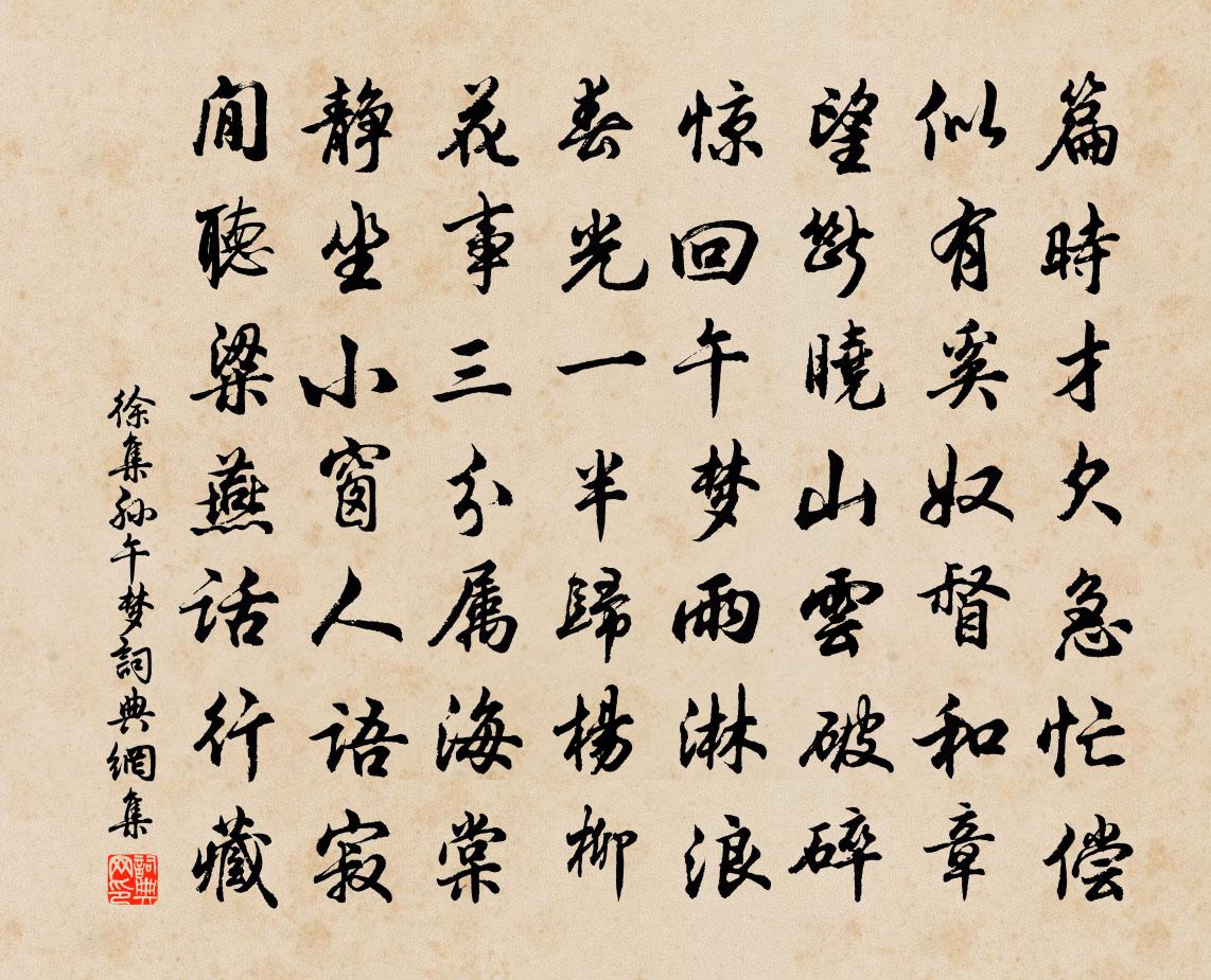 詩詞名句歷史字典書法欣賞書法字典國語詞典說文解字康熙字典古漢語字典標 題 作 者 詩 句 午夢作者:徐集孫 朝代:宋代午夢原文篇時才欠急忙償,似有奚奴督和章。望斷曉山雲破碎,驚回午夢雨淋浪。春光一半歸楊柳,花事三分屬海棠。靜坐小窗人語寂,閒聽粱燕話行藏。詩詞問答問:午夢的作者是誰?答:徐集孫問:午夢寫於哪個朝代?答:宋代徐集孫午夢書法欣賞午夢書法作品詩詞推薦閨情鄭虔〔唐代〕銀鑰開香閣,金台照夜燈。長征君自慣,獨臥妾何曾。失題三道蘇軾〔宋代〕木落沙明秋浦,雲臥煙淡瀟湘。曾學扁舟范蠡,五湖深處鳴榔。雪中六解姜夔〔宋代〕曾泛扁舟詣石湖,恍然坐我范寬圖。天寒遠掛一行雁,三十六峰生玉壺。用碩夫韻述懷二首李彌遜〔宋代〕少年正墮塵網中,晚歲臭味商山翁。辟喧苦厭俗眼白,得酒經借衰顏紅。半生事業一經足,是處生涯四壁空。故人又呈中齋文天祥〔宋代〕萬里論心晚,相看慰亂離。丹成俄已化,璧碎尚無緇。禾黍西原夢,川原落日悲。斯文今已矣,來世以為期。都中留隨州李判官劉過〔宋代〕幸白東南好,西歸未可忙。茶添橄欖味,酒借蛤蜊香。絕品宜春醉,新烹趁日長。倒囊煩厚載,歸遣北人嘗。倉使和詩出奇不窮再次韻四首劉克莊〔宋代〕百禽久已蟄於冬,春暖喧啾各不同。壺少提沽村店靜,袴無脫著小家窮。山翁吟竅黃泥蚓,閣老毫端白晝虹。社飲雙井鄭清之〔宋代〕水神何時生六翮,飛出雙泉江練白。平湖浸月渺無邊,一笑對之成揖客。轆轤初動曉星橫,夜卷寒瓊聲{左氵右砉疊嶂樓有懷吳門朱長文〔唐代〕虎邱換得敬亭山,句水松陵數舍間。天下難如兩州好,君恩乞與一身閒。慚無牒訴煩敲扑,喜有林泉數往還。猶想太令人趙氏輓詞樓鑰〔宋代〕令德比鳲鳩,芳華誓柏舟。承平猶有態,曠達了無憂。方奉平反笑,俄成汗漫遊。哀榮誰得似,同穴樂哉丘。菩薩蠻王齊愈〔宋代〕玉肌香襯冰絲縠。縠絲冰襯香肌玉。纖指拂眉尖。尖眉拂指纖。巧裁羅襪小。小襪羅裁巧。移步看塵飛。飛塵看步游清潭呂資益蟠谷絕啜羹劉過〔宋代〕香不求知色正青,青於九畹見飄零。山中若有離騷伴,痛飲吾知勝獨醒。送文懿大師淨公西遊徐鉉〔唐代〕乘興西遊誰與同,一囊詩藁一枝筇。厭棲廬岳蓮花社,卻訪南山紫閣峰。懷古有時應悵望,尋幽何處不從容。關中鶯啼序劉辰翁〔宋代〕悶如愁紅著雨,捲地吹不起。便故人渺渺,相逢前事,欲語還已。凝望久、荒城落日,五湖四海煙浪里。問而今何龐居士贊釋梵琮〔宋代〕得便宜是落便宜,傾盡家珍賣笊籬。男女聚頭無結果,這般翁子大無知。殿前歡景元啟〔元代〕月如牙,早庭前疏影印窗紗。逃禪老筆應難畫,別樣清佳。據胡床再看咱。山妻罵,為甚情牽掛?大都來梅花是我西江月侯善淵〔元代〕眉間交枝琥珀,睛分脫質龍涎。鼎中煙裊徹禪天。一顆靈光出現。太上明茲玉象,如來證此金仙。清流異派本同源晚色蔡襄〔宋代〕晚色在何處,樓高天宇低。閒雲無去住。歸燕自東西。少年游佚名〔宋代〕新竿界斷一天游。萬弩向雲頭。彩羽飛星,紅心破日,勝集總名流。好手業中施好,利物敢輕酬。捧桿箭多,旗花玉蝴蝶仇遠〔宋代〕野樹昏鴉歸盡,素煙如練,低罩平蕪。斷壁飛樓,紅翠似有還無。女牆矮、月籠粉雉,娃館靜、塵暗金鋪。問清都名句推薦河水傾潑丈余,雞鳴犬吠滿城中。蒲松齡《地震》 戰士軍前半死生,美人帳下猶歌舞。高適《燕歌行》 文豈有常體,但以有體爲常李大師、李延壽《南史·列傳·卷三十二》 孤眠鸞帳里,枉勞魂夢,夜夜飛揚。佚名《鳳歸雲·閨怨》 食者,國之寶也;兵者,國之爪也墨子《墨子·05章 七患》 及茲春未深,數畝猶足佃。王守仁《謫居糧絕請學於農將田南山詠言寄懷》 孔子亦矙其亡也,而往拜之。孟子《孟子·滕文公章句下·第七節》 古宮閒地少,水港小橋多。杜荀鶴《送人游吳》 刻舟求劍,固而不通;膠柱鼓瑟,拘而不化。程登吉《幼學瓊林·卷三·器用》 遲遲鐘鼓初長夜,耿耿星河欲曙天。白居易《長恨歌》