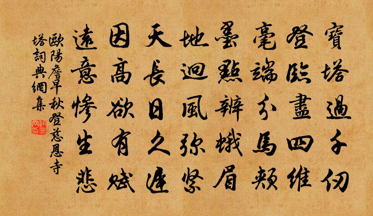 詩詞名句歷史字典書法欣賞書法字典國語詞典說文解字康熙字典古漢語字典標 題 作 者 詩 句 早秋登慈恩寺塔作者:歐陽詹 朝代:唐代早秋登慈恩寺塔原文寶塔過千仞,登臨盡四維。毫端分馬頰,墨點辨蛾眉。地迥風彌緊,天長日久遲。因高欲有賦,遠意慘生悲。詩詞問答問:早秋登慈恩寺塔的作者是誰?答:歐陽詹問:早秋登慈恩寺塔寫於哪個朝代?答:唐代問:早秋登慈恩寺塔是什麼體裁?答:五律歐陽詹早秋登慈恩寺塔書法欣賞早秋登慈恩寺塔書法作品注釋全唐詩:卷349-33詩詞推薦武康防風王廟前入西鄉山中曠游歸看邑志偶成董嗣杲〔宋代〕苕溪直西山嶙峋,莫乾矗空參北辰。荒村去縣未甚遠,日落將盡埋紅輪。覉人憩此醉徒御,僻壤曾際神禹巡。敝祠靈芝寺避暑因攜茶具汎湖共成十絕張鎡〔宋代〕白髮催愁酒量慳,軟塵盈袂飲尤難。小童正對茶鐺立,堪伴先生入畫看。春晴將游玉淵踐吳季謙待制馮可久武博山行之岳珂〔宋代〕康廬三萬丈,下有神龍淵。旁聯玉井並,仰溯銀河連。層崖積冰雪,斷岸藏風煙。崔隤五老峰,迸瀉三峽泉。鯨鯢鴛鴦湖棹歌 之十八朱彝尊〔清代〕姑惡飛鳴觸曉煙,紅蠶四月已三眠。白花滿把蒸成露,紫葚盈筐不取錢。和黃雲夫武攸見寄韻史彌寧〔宋代〕詩名千古社陵翁,身不勝窮道不窮。編簡湛酣君有味,江山彈壓我無功。穉涼庭院梧桐雨,晚照陂墉蓼荻風。如此平心胡祠監誕日方回〔宋代〕五朝遺老四專城,年號凡經十四更。八袠即今逾少壯,七人從昔冠耆英。凍窗映雪能堅坐,泥屐看山只步行。清健送靈江住金華講院釋行海〔宋代〕名自黃扉遴選來,山中亦有禰衡材。清風八詠雙溪月,講徹蓮花第一回。垓下歌項羽〔兩漢〕力拔山兮氣蓋世。時不利兮騅不逝。騅不逝兮可奈何!虞兮虞兮奈若何!四疊劉克莊〔宋代〕帝恐先生歲晚貧,清晨頒瑞到幽人。巡檐已覺成銀屋,糝地猶堪作玉塵。寄書陳維崧〔清代〕香茗才情,簪花模樣,斜舒密色箋兒。霜毫才吮,早已淚如絲。楚天樓上湘娥倚,奈湘雨湘煙十二時。說與天涯游讀通鑑雜興孫應時〔宋代〕平生作意輕羊舅,歲晚何心佞羯奴。為問荊齊是三窟,此時容有宦情無。雪中過伊南李處權〔宋代〕低陰漠漠水漫漫,楊柳如絲不忍看。見說山前風更惡,杏花無處避春寒。春恨 選二 其二 /恨春五首 其四朱淑真〔宋代〕遲遲花日上簾鉤,盡日無人獨倚樓。蝶使蜂媒傳客恨,鶯絲柳線織春愁。 碧雲信斷惟芳夢,紅葉盛時想到秋。幾小窗對客趙崇嶓〔宋代〕紙帳梅花自一真,小窗對語坐無裀。詩家供給惟風月,病與詩疏始覺貧。踏莎行(季功席上賦,時移尊就月,涼意甚佳,主人親摘阮以娛客,故云)郭應祥〔宋代〕露濕冠巾,風生襟袖。月華耿耿明好晝。主人情意十分濃,阮鹹橫膝清音奏。漸永更籌,新涼氣候。穿針乞巧看看一落索(雙調·第二)周邦彥〔宋代〕杜宇思歸聲苦。和春催去。倚闌一霎酒旗風,任撲面、桃花雨。目斷隴雲江樹。難逢尺素。落霞隱隱日平西,料想同諸公游雲公禪寺張謂〔唐代〕共許尋雞足,誰能惜馬蹄。長空淨雲雨,斜日半虹霓。檐下千峰轉,窗前萬木低。看花尋徑遠,聽鳥入林迷。地與春晚招石門陳居士游麥斜岩破新茶因讀南華齊林亦之〔宋代〕好好輕衫清晝便,短鋤欲乞此來田。只應荷蕢無青發,且謾春風二十年。又和寄惠藤篋絕句王禹偁〔宋代〕蠻藤編篋自番禺,錦袋羅囊盡不如。乞與揚州貯詩草,行春誰怕雨隨車。句俞可〔宋代〕拂座好風來橘社,隔汀長笛過松江。名句推薦虎狼也有父子之情。馮夢龍《喻世明言·卷二十一》 澄江平少岸,幽樹晚多花。杜甫《水檻遣心二首》 日光下澈,影布石上,佁然不動;柳宗元《小石潭記》 翠輦不來金殿閉,宮鶯銜出上陽花雍陶《天津橋望春》 形勝三分國,波流萬世功。潘大臨《江間作四首·其三》 早是他鄉值早秋,江亭明月帶江流。王勃《秋江送別二首》 人不通今古,馬牛如襟裾。佚名《增廣賢文·上集》 方以類聚,物以群分佚名《易傳·繫辭傳上·第一章》 為上者疑,為下者懼。上下背德,禍必興焉。來俊臣《羅織經·事上卷第二》 君為女蘿草,妾作菟絲花。李白《古意》