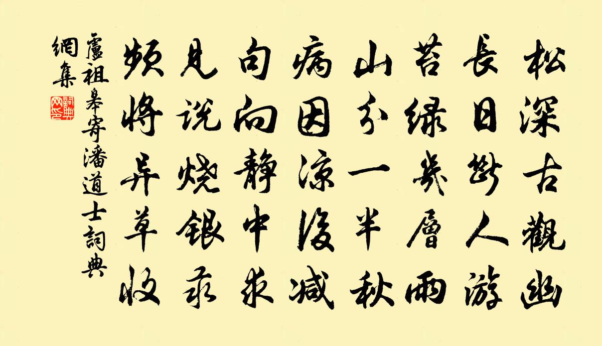 詩詞名句歷史字典書法欣賞書法字典國語詞典說文解字康熙字典古漢語字典標 題 作 者 詩 句 寄潘道士作者:盧祖皋 朝代:宋代寄潘道士原文松深古觀幽,長日斷人游。苔1/1綠幾層雨,山分一半秋。病因涼後減,句向靜中求。見說燒銀汞,頻將異草收。詩詞問答問:寄潘道士的作者是誰?答:盧祖皋問:寄潘道士寫於哪個朝代?答:宋代問:盧祖皋的名句有哪些?答:盧祖皋名句大全盧祖皋寄潘道士書法欣賞寄潘道士書法作品詩詞推薦送李方東歸(即故李校書端親弟)盧綸〔唐代〕故交三四人,聞別共沾巾。舉目是陳事,滿城無至親。身從喪日病,家自儉年貧。此去何堪遠,遺孤在舊鄰。永叔請賦車螯梅堯臣〔宋代〕素唇紫錦背,漿味壓蚶菜。海客穿海沙,拾貯寒潮退。王都有美醞,此物實當對。相去三千里,貴力致以配。翰林憶壽春廢虎坑余以春二月至郡主吏舉所職稱霍…去郡三載李紳〔唐代〕匪將履尾求兢惕,那效探雛所患爭。當路絕群嘗誡暴,為貓驅獮亦先迎。每推至化宣餘力,豈用潛機害爾生。休逐偈頌一百五十首釋心月〔宋代〕有句無句,如藤倚樹。樹倒藤枯,毒蛇橫路。咄咄咄,縮頭去。滿庭芳(重陽前席上次元直韻)佚名〔宋代〕寒日穿簾,澄江憑檻,練光浮動餘霞。蓼汀蘆岸,黃葉襯孤花。天外征帆隱隱,殘雲共、流水無涯。登臨處,瓊枝婆餅焦邵定〔宋代〕婆餅焦,罪在妾,妾不能家家道缺。冬裘不完夏糧絕,愁得鬢成雪。朝看婆鬢兮眼滴血,暮思婆鬢兮心刮鐵。草枯奉和魯望漁具十五詠藥魚皮日休〔唐代〕吾無竭澤心,何用藥魚藥。見說放溪上,點點波光惡。食時競夷猶,死者爭紛泊。何必重傷魚,毒涇猶可作。頌古一○一首釋子淳〔宋代〕白藕未萌非隱的,紅花出水不當陽。遊人莫用傳訊息,自有清風透遠香。夜坐戲作陸游〔宋代〕束書舊隱棋岩下,慣碾春風傲北窗。喚起口生塵土夢,賴君圭璧一雙雙。吳李堅甫中舍文同〔宋代〕往年曾憶過長安,短紙書名詣門下。君時延我坐終日,灑掃東軒留看畫。橫圖巨軸不知數,但見匣中時一把。甲猶代仍六弟吊程貢元三首許月卿〔宋代〕嚚訟漸成俗,如君今豈多。仲尼仁者靜,下惠聖之和。夜月數聲笛,春風一再歌。紛紛當泚顙,視此石嵯峨。七月望郡庠賦秋聲詩且欲不犯題字及見所作良陳著〔宋代〕氣應商聲慘又清,人閒難聽亦難名。非神非鬼洞庭樂,為鶴為風淝水兵。老葉自吟高處調,寒蛩相趁鬧中鳴。西風早歲趙蕃〔宋代〕早歲耽詩老不工,但余多難似詩窮。忽來數紙丁寧甚,恍憶他時繾綣同。幕府十年公勿厭,風霜滿面我思東。幾因時人為黃筌語佚名〔唐代〕黃筌畫鶴,薛稷減價。挽吳茂新侍郎三首劉克莊〔宋代〕衰老歸休矣,公曾慫恿之。門無今雨客,笥有隔年詩。友課招魂些,兒徵積善碑。白頭哭同社,心折可勝悲。再用前韻賦蘇軾〔宋代〕樂天霜鬢如霜菅,始知謝遣素與蠻。我兄綠髮蔚如故,已了夢幻齊人間。蛾眉勸酒聊爾耳,處仲太忍茂弘孱。三杯泰伯廟迎享送神辭三章龔頤正〔宋代〕登歌兮堂上屢舞兮堂下。君來享兮清酤,溪毛陸離兮筐筥。蓴鯽芳鮮兮亦有肥羜,君不來兮使我心苦。憶小女銀娘韋莊〔唐代〕睦州江上水門西,盪槳揚帆各解攜。今日天涯夜深坐,斷腸偏憶阿銀犁。少日劉克莊〔宋代〕少日關河要指呼,晚歸田裡似囚拘。氣衰不敢高聲語,腕弱才能小楷書。座有老兵持共飲,路逢醉尉避前驅。子元上徐舍人鉉許堅〔唐代〕幾宵煙日鎖棲台,欲寄侯門薦禰才。滿面塵埃人不識,謾隨流水出山來。名句推薦一笛當樓,謝娘懸淚立風前史達祖《玉蝴蝶·晚雨未摧宮樹》 長相思,摧心肝。李白《長相思三首》 塞下秋來風景異,衡陽雁去無留意。范仲淹《漁家傲·秋思》 擁紅妝,翻翠蓋,花影暗南浦。高觀國《祝英台近·荷花》 香醪欲醉茱萸節,壯志還為出塞歌。石茂華《九月九日登長城關》 秋至搗羅紈,淚滿未能開。江淹《悼室人》 萋萋芳草小樓西,雲壓雁聲低。劉基《眼兒媚·秋思》 父兄教子弟,必正其身以率子,無庸徒事言詞也。王永彬《圍爐夜話·第三三則》 榆柳蕭疏樓閣閒,月明直見嵩山雪。孟郊《洛橋晚望》 夜吟敲落霜紅,船傍楓橋系。吳文英《荔枝香近·送人游南徐》