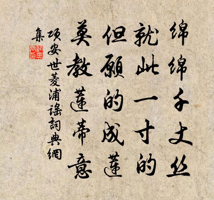 詩詞名句歷史字典書法欣賞書法字典國語詞典說文解字康熙字典古漢語字典標 題 作 者 詩 句 菱浦謠作者:項安世 朝代:宋代菱浦謠原文綿綿千丈絲,就此一寸的。但願的成蓮,莫教蓮蒂意。詩詞問答問:菱浦謠的作者是誰?答:項安世問:菱浦謠寫於哪個朝代?答:宋代項安世菱浦謠書法欣賞菱浦謠書法作品詩詞推薦寄江南諸相知四錫〔宋代〕詩成奏入冕旒前,小諫官資驟轉遷。帶職喜為仙館吏,立班常近御爐煙。清華拜命知深忝,謇諤非才愧昔賢。多謝浪淘沙(示吳應奎)陳著〔宋代〕遲飯甑炊紅。青翦蔬叢。雞聲鄰里狎田翁。兵後故人能有幾,歲晚江空。誰信淡交中。依舊情濃。白頭青眼轉惺憁燭影搖紅(用林卿韻)劉克莊〔宋代〕拙者平生,不曾乞得天孫巧。那回忝扈屬車來,豈是齊卿小。此膝不曾屈了。更休文、腰難運掉。前賢樣子,表聖寄僧知乾裴說〔唐代〕貌高清入骨,帝里舊臨壇。出語經相似,行心佛證安。妙源首座請贊釋智遇〔宋代〕道不可傳,貌不可繪。冷坐深雲,虎視百怪。源遠流長滅正宗,不比瞎驢趁機大隊。謝開叔司封用無事求得最多邵雍〔宋代〕客問人間事若何,堯夫對曰不知佗。居林之下行林下,無事無求得最多。王子直輓詞二首強至〔宋代〕流水身飄忽,青雲意闊疏。儒林看作傳,使者合求書。野月隨丹旐,山煙濕素車。寢門今日淚,一灑為無餘。陪高計使柱史謝庾使刑郎登梅仙山丹青閣趙汝騰〔宋代〕侵雲祠宇絕荒涼,目眴憑虛興寄長。仙者遠遊非穆穆,天之視下亦蒼蒼。貴公業趁塵泥腐,小尉名爭日月光。此地始見二毛鮑溶〔唐代〕玄發迎憂光色闌,衰華因鏡強相看。百川赴海返潮易,一葉報秋歸樹難。初弄藕絲牽欲斷,又驚機素翦仍殘。顏生自愛釋文珦〔宋代〕自愛予生愛性真,真存渾不管渠嗔。從來有水有山處,著得無名無利人。騰踏豈須夸駔駿,幽潛端可養精神。盡向菩薩蠻 贈雁張翥〔元代〕人隨雁雁俱南去。雁應先到憑傳語。若問錦書無。人歸不得書。歸期還信否。準在梅花後。煙樹短長亭。只爭三四挽青陽俞夫人吳泳〔宋代〕彼美宜家室,之媛友瑟琴。漆園歌未歇,灃浦佩還沉。懿範貽彤管,佳銘得藁砧。臥龍山下路,風雨亂愁心。偈頌一百三十六首釋惟一〔宋代〕一月在天,影含眾水。只如雙劍峰頭月,何似芙蓉溪上月。芙蓉溪上月,何似泐潭潭底月。若道同,東西各一涯,臨川橋歌陳騤〔宋代〕壯兮滄溟跨螮蝀。疑若有神施磨礲,鞏然不動如華崧。環瞻山幄凝翠空,俯睨谿紋識微風。夜半橫浮沆瀣中,朝來韓康公輓詞三首蘇軾〔宋代〕西第開東閣,初筵點後塵。笙歌邀白髮,燈火樂青春。扶路三更罷,回頭一夢新。賦詩猶墨濕,把卷獨沾巾。惜雙雙/惜分飛佚名〔宋代〕冒雪披風開數點。萬花厭、欺寒探暖。掩映閒庭院。月下疏影橫斜,幽香遠。命友開尊同宴玩。聽麗質、歌聲宛轉寄子由二首張耒〔宋代〕丈席他年聞至言,艱難不敢墜周旋。文詞老去真何益,道妙平生薄有緣。人事眼前惟欲睡,丹經肘後更難傳。清秋洞元觀方岳〔宋代〕空林綠氣冷香彝,山帶斜暉半入溪。幽鳥似嫌人至數,瞥然飛過隔林啼。自題小園白居易〔唐代〕不鬥門館華,不鬥林園大。但斗為主人,一坐十餘載。回看甲乙第,列在都城內。素垣夾朱門,藹藹遙相對。主人雜詠一百首孫思邈劉克莊〔宋代〕藥品用昆蟲,遂虧全活功。至今仙未得,只在蜀山中。名句推薦刷羽同搖漾,一舉還故鄉。沈約《詠湖中雁》 善處事者,但就是非可否,審定章程,而不必利於己。王永彬《圍爐夜話·第九則》 執一者至貴也,至貴者無敵。呂不韋《呂氏春秋·覽·離俗覽》 青春花姊不同時。淒涼生較遲。吳文英《醉桃源·芙蓉》 昨日鄰家乞新火,曉窗分與讀書燈。王禹偁《清明》 君不見,高堂明鏡悲白髮,朝如青絲暮成雪。李白《將進酒》 石澗凍波聲,雞叫清寒晨。李賀《自昌谷到洛後門》 嶺水爭分路轉迷,桄榔椰葉暗蠻溪。李德裕《謫嶺南道中作》 使人有面前之譽,不若使人無背後之毀陳繼儒《小窗幽記·集醒篇》 君寵益嬌態,君憐無是非。王維《西施詠》