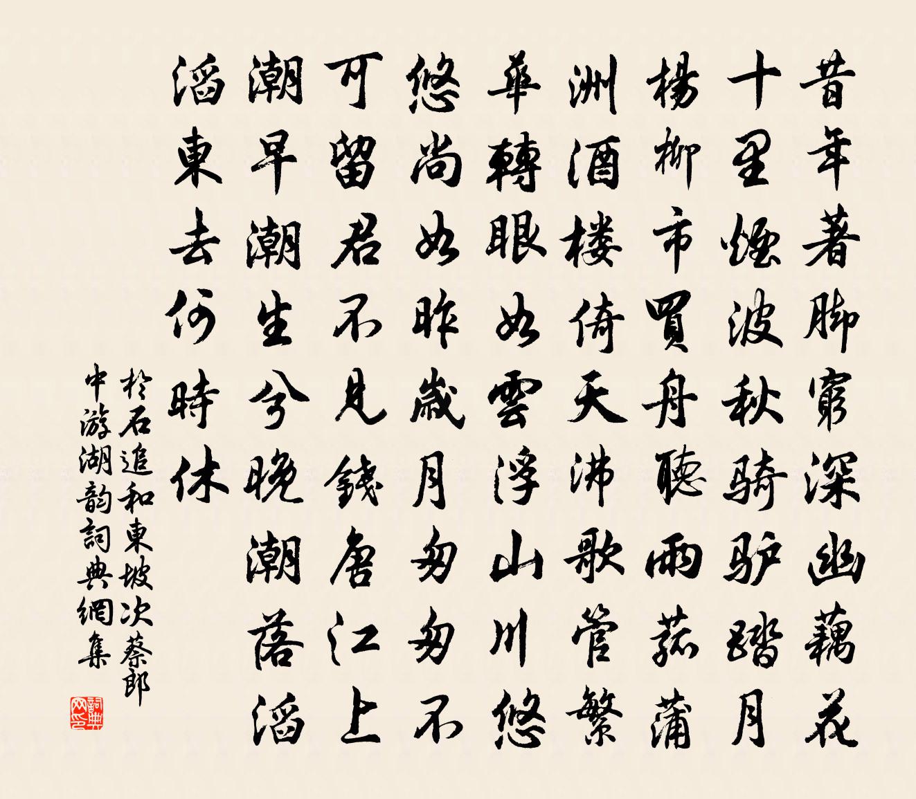 詩詞名句歷史字典書法欣賞書法字典國語詞典說文解字康熙字典古漢語字典標 題 作 者 詩 句 追和東坡次蔡郎中游湖韻作者:於石 朝代:宋代追和東坡次蔡郎中游湖韻原文昔年著腳窮深幽,藕花十里煙波秋。騎驢踏月楊柳市,買舟聽雨菰蒲洲。酒樓倚天沸歌管,繁華轉眼如雲浮。山川悠悠尚如昨,歲月匆匆不可留。君不見錢唐江上潮,早潮生兮晚潮落,滔滔東去何時休。詩詞問答問:追和東坡次蔡郎中游湖韻的作者是誰?答:於石問:追和東坡次蔡郎中游湖韻寫於哪個朝代?答:宋代於石追和東坡次蔡郎中游湖韻書法欣賞追和東坡次蔡郎中游湖韻書法作品詩詞推薦俗游合阜山劉過〔宋代〕仙梯難上塵緣重,俗駕勒回仙有靈。煙靄模糊雨昏黑,數峰疑在眼中青。史氏鐵笛艾性夫〔宋代〕蘄川老竹未為奇,橫截涼州黑玉枝。陽燧無煙山鬼鑄,蓬壺乘月浪仙吹。一聲響裂千崖石,九曲亭標二老詩。俗耳題方家峪劉寺山門顧逢〔宋代〕灑墨起雲端,神威聳眾觀。直疑鮮甲動,相對骨毛寒。瞠目真如活,騰空似不難。傳聞風雨夜,雷電繞闌乾。題崔端公園林李端〔唐代〕上士愛清輝,開門向翠微。抱琴看鶴去,枕石待雲歸。野坐苔生席,高眠竹掛衣。舊山東望遠,惆悵暮花飛。偈頌一百零二首釋紹曇〔宋代〕不可以智知,金剛手把八棱槌。不可以識識,鎮州出個大蘿蔔。不可以語言造,山禽聚集啼清曉。不可以寂默通,和陸魯望白菊司馬都〔唐代〕恥共金英一例開,素芳須待早霜催。繞籬看見成瑤圃,泛酒須迷傍玉杯。映水好將蘋作伴,犯寒疑與雪為媒。夫君沁園春呂渭老〔宋代〕復把元宵,等閒過了,算來告誰。整二年三歲,尊前笑處,知他陪了,多少歌詩。豈信如今,不成些事,還是無聊棖花董嗣杲〔宋代〕穠芳比似橘花肥,當日曾從細雨移。老有縐顏羞晚出,清無柔性結春知。雪香四月蜂攢處,風味重陽蟹健時。院落寄相之並示坰吳則禮〔宋代〕一飲一石陶靖節,誰言此理可消憂。飽知渭北黃花酒,不似淮南白雁秋。快解檣竿倒檣尾,要鳴船鼓轉船頭。魏郎玉蝴蝶(五之三·仙呂調)柳永〔宋代〕是處小街斜巷,爛游花館,連醉瑤卮,選得芳容端麗,冠絕吳姬。絳唇輕、笑歌盡雅,蓮步穩、舉措皆奇。出屏幃菩薩蠻蔡伸〔宋代〕當時攜手今千里。可堪重到相逢地。觸目盡關心。流鶯尚好音。無人知我意。只有涓涓淚。寂寞到斜陽。羅衣裛舊和徐思遠歲除王洋〔宋代〕節物催人莫自悲,開顏且喜看君詩。飯拋宿歲因輕棄,酒為迎上故重違。照鏡不收寒鷺影,藏鉤新與少年期。何須南樓陸游〔宋代〕十年不把武昌酒,此日闌邊感慨深。舟楫紛紛南復北,山川莽莽古猶今。登臨壯士興懷地,忠義孤臣許國心。倚杖贈無庵於道人六言一首劉克莊〔宋代〕無盡空諸有,孤立何須同參。道人不置產業,寄孟家廢庵。次韻張姑夫感舊晁說之〔宋代〕用舊為邦不務新,舜琴何事有埃塵。焚香秘殿期王母,躍馬荒郊訪異人。爾保丘園為爾土,吾憐盜賊本吾民。四愁清平樂曹勛〔宋代〕趙家燕燕。宜在昭陽殿。春入館娃深宮宴。秀色從來未見。淺顰輕笑都宜。臨風好是腰肢。今夜松江歸路,月明愁張飛廟殷堯藩〔唐代〕威名垂萬古,勇力冠當時。回首三分國,何人賦黍離。橫池蘇軾〔宋代〕明月入我池,皎皎鋪紵縞。何日變成緇?太玄吾懶草。題廬陵義士傳郭彥章〔宋代〕淮海風回吹血腥,青原不改舊時青。中朝將帥論功賞,不及江南一白丁。日曜上人還潤州皎然〔唐代〕送君何處最堪思,孤月停空欲別時。露茗猶芳邀重會,寒花落盡不成期。鶴令先去看山近,雲礙初飛到寺遲。莫倚名句推薦聞道故林相識多,罷官昨日今如何李頎《送陳章甫》 寵辱不驚,肝木自寧陳繼儒《小窗幽記·集靈篇》 公子南橋應盡興,將軍西第幾留賓。杜審言《春日京中有懷》 暮從碧山下,山月隨人歸。李白《下終南山過斛斯山人宿置酒》 父兄有善行,子弟學之或不肖王永彬《圍爐夜話·第三三則》 群山萬壑赴荊門,生長明妃尚有村。杜甫《詠懷古蹟五首·其三》 燕子不曾來,小院陰陰雨。蔣春霖《卜運算元·燕子不曾來》 送君歸去愁不盡,又惜空度涼風天。王昌齡《送狄宗亨》 楚天千里清秋,水隨天去秋無際。辛棄疾《水龍吟·登建康賞心亭》 人心統耳目官骸,而於百體為君,必隨處見神明之宰王永彬《圍爐夜話·第十二則》