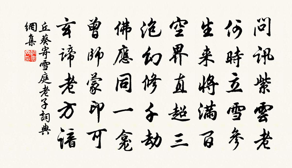 詩詞名句歷史字典書法欣賞書法字典國語詞典說文解字康熙字典古漢語字典標 題 作 者 詩 句 寄雪庭老子作者:丘葵 朝代:宋代寄雪庭老子原文問訊紫雲老,何時立雪參。生來將滿百,空界直超三。泡幻修千劫,佛應同一龕。曾師蒙印可,玄諦老方諳。詩詞問答問:寄雪庭老子的作者是誰?答:丘葵問:寄雪庭老子寫於哪個朝代?答:宋代丘葵寄雪庭老子書法欣賞寄雪庭老子書法作品詩詞推薦柳文丙〔唐代〕何事動吟喔,長□翠色和。垂陰千樹少,送別一枝多。帶霧籠彭澤,搖風舞汴河。只因隋帝植,民力幾銷磨。冒雨渡浦陽江方鳳〔宋代〕痴雲千頃壓江壖,寂寞籃輿破午煙。樹杪樓台看近郭,流頭波浪忽滔天。舟依曲港難回楫,徑轉高陵每得筌。誰向飯牛圖王冕〔元代〕君不見百里奚飯牛而牛肥,胸中經緯無人知;又不見老甯戚時不時兮長嘆息。偶爾君臣稱際會,伯道相高非盛德。金字經·樵隱馬致遠〔元代〕擔挑山頭月,斧磨石上苔。且做樵夫隱去來。柴,買臣安在哉?空岩外,老了棟樑材。始生七章章八句上皇子嘉王生辰陳傅良〔宋代〕獵人愛麛麌,漁人愛鯤鮞。萬物欣自遂,況也民秉彝。家有舉桉婦,人有譍門兒。王心至於此,壽不數耆頤。東鄰妙(木蘭花)賀鑄〔宋代〕張燈結綺籠馳道。六六洞天連夜到。韶華吹斷紫雲回,怊悵人間新夢覺。傾城猶記東鄰妙。尊酒相逢留一笑。廬郎蝶戀花蘇軾〔宋代〕雨後春容清更麗。只有離人,幽恨終難洗。北固山前三面水。碧瓊梳擁青螺髻。一紙鄉書來萬里。問我何年,真箇懷素友子西韋應物〔唐代〕廣陌並游騎,公堂接華襟。方歡遽見別,永日獨沉吟。階暝流暗駛,氣疏露已侵。層城湛深夜,片月生幽林。往款葮川獨泛盧照鄰〔唐代〕倚棹春江上,橫舟石岸前。山暝行人斷,迢迢獨泛仙。東林寺二首黃庭堅〔宋代〕勝地東林十八公,廬山千古一清風。淵明豈是難拘束,正與白蓮出處同。澶守諫議韓壽禱雨有應晁補之〔宋代〕長蜺飲井井欲乾,白鼉鳴窟淒風寒。公馬未駕陰漫漫,公歸濕幙濡旌幡。霜刀不染鵝頸殷,塗龍安享雩舞閒。隰桑孱陵道中項安世〔宋代〕草冷霜融晚,天寒日出遲。亂鴉鳴古柳,獨犬吠疏籬。歲暮方為客,身閒豈有期。一生村疃里,羨殺牧牛兒。中岩十八詠喚魚潭晁公溯〔宋代〕潭水清見底,老僧來喚魚。與渠同法食,持缽施齋余。九月八日司空圖〔唐代〕已是人間寂寞花,解憐寂寞傍貧家。老來不得登高看,更甚殘春惜歲華。六月晦發霅川廣德兄與諸友飲餞於漁山已而皆張栻〔宋代〕平生苕霅夢,邂逅此登臨。青山秀而遠,溪水潔且深。浮玉千古色,飛鳳何年音。小丘辟茺薈,修竹初成林。居然癸酉閏十二月朔旦入夜雪復作靜言歲斯人艱食王之道〔宋代〕宿雁驚江渚,餓彪嘯林丘。不知雪如許,但怪風颼颸。起看堂前柳,枯梢戛鳴球。安得萬家春,角我饑寒憂。旋支過寶帶橋有詠乾隆〔清代〕金閶清曉放舟行,寶帶春風波漾輕。孔五十三易疏泄,漲痕猶見與橋平。喜遷鶯(春感)易祓〔宋代〕帝城春晝。見杏臉桃腮,胭脂微透。一霎兒晴,一霎兒雨,正是催花時候。淡煙細柳如畫,雅稱踏青攜手。怎知道漁家傲佚名〔宋代〕冤家。一點神魂初托魄。青蓮華里琉璃宅。毫相法音非間隔。雖明白。到頭不似金台客。九品高低隨報獲。或經劫晨興懷寺中用前韻史浩〔宋代〕薛公言慷慨,端可諷馴犀。器廣蜃江小,名高雁嶺低。宸居清瑣闥,禁路紫騮蹄。揆德宜長處,何因夢白雞。名句推薦人皆可罪,罪人須定其人。來俊臣《羅織經·問罪卷第十》 志不強者智不達。墨子《墨子·02章 修身》 明月別枝驚鵲,清風半夜鳴蟬。辛棄疾《西江月·夜行黃沙道中》 更無柳絮因風起,惟有葵花向日傾。司馬光《客中初夏》 願春暫留,春歸如過翼。周邦彥《六醜·落花》 布被秋宵夢覺,眼前萬里江山。辛棄疾《清平樂·獨宿博山王氏庵》 和氣吹綠野,梅雨灑芳田。李世民《詠雨》 長袖善舞,多錢善賈。韓非及後人《韓非子·五蠹》 念去來、歲月如流,徘徊久、嘆息愁思盈。周邦彥《綺寮怨·上馬人扶殘醉》 一片春愁待酒澆。江上舟搖,樓上簾招。蔣捷《一剪梅·舟過吳江》