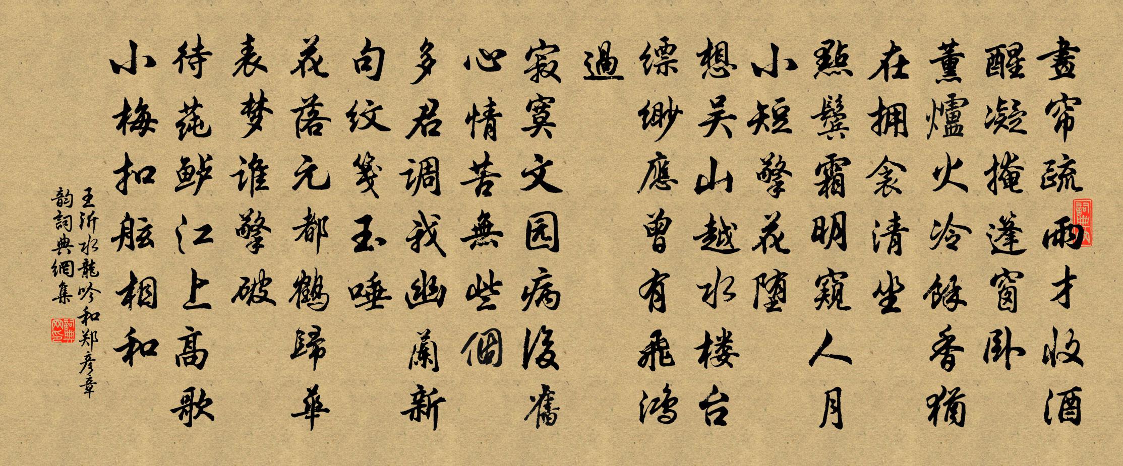 詩詞名句歷史字典書法欣賞書法字典國語詞典說文解字康熙字典古漢語字典標 題 作 者 詩 句 水龍吟 和鄭彥章韻作者:王沂 朝代:元代水龍吟 和鄭彥章韻原文畫簾疏雨才收,酒醒凝掩篷窗臥。薰爐火冷,余香猶在,擁衾清坐。點鬢霜明,窺人月小,短擎花墮。想吳山越水,樓台縹緲,應曾有,飛鴻過。寂寞文園病後,舊心情、苦無些個。多君調我,幽蘭新句紋箋玉唾。花落元都,鶴歸華表,夢誰擎破。待蓴鱸江上,高歌小梅,扣舷相和。詩詞問答問:水龍吟 和鄭彥章韻的作者是誰?答:王沂問:水龍吟 和鄭彥章韻寫於哪個朝代?答:元代問:水龍吟 和鄭彥章韻是什麼體裁?答:詞王沂水龍吟 和鄭彥章韻書法欣賞水龍吟 和鄭彥章韻書法作品詩詞推薦台中聽雪洪咨夔〔宋代〕淅瀝松廳夜,空山一樣聲。冰霜元自勁,水月更添清。衾薄難留夢,窗虛易得明。庭烏催奏墨,未曉已先鳴。寄湘陰閻少府乞釣輪子溫庭筠〔唐代〕釣輪形與月輪同,獨繭和煙影似空。若向三湘逢雁信,莫辭千里寄漁翁。篷聲夜滴松江雨,菱葉秋傳鏡水風。終日初出金門,尋王侍御不遇,詠壁上鸚鵡李白〔唐代〕落羽辭金殿,孤鳴咤繡衣。能言終見棄,還向隴西飛。戲答林園白居易〔唐代〕豈獨西坊來往頻,偷閒處處作遊人。衡門雖是棲遲地,不可終朝鎖老身。金閶送別圖唐寅〔明代〕金閶楊柳麥塵絲,又送吾兒上路岐。若到長安見知己,為言貧甚轉工詩。高竹八首邵雍〔宋代〕高竹如碧幢,翠柳若低蓋。幽人有軒榻,日夜與之對。宇靜覺神開,景閒喜真會。與其喪吾真,孰若從吾愛。浪淘沙慢·夢覺透窗風一線柳永〔宋代〕夢覺透窗風一線,寒燈吹息。那堪酒醒,又聞空階,夜雨頻滴。嗟因循、久作天涯客。負佳人、幾許盟言,便忍把運判再以前韻見寄韓維〔宋代〕突兀朱堂冠北城,雲峰滿目互陰晴。憑欄不負思山意,對酒何煩考鼓聲。清話從容雙塵禿,雕章溫麗百金輕。歸軒懷梅水村十絕用張小山韻趙必象〔宋代〕鄰牆砧杵送秋聲,雲掩香幃六曲屏。燈下回文題未就,梅花明月一床冰。宮詞三十三首曹勛〔宋代〕女裳緣飾麗青紅,俗競浮華廢百工。聖意與民敦儉素,盡除金翠復淳風。柳絮羅鄴〔唐代〕處處東風撲晚陽,輕輕醉粉落無香。就中堪恨隋堤上,曾惹龍舟舞鳳凰。次韻張錄攜書見過方岳〔宋代〕家在屏山東復東,高軒肯過白雲中。石橋自是神仙處,竹屋相傳工律工。日暮春江愁李白,山寒秋菊老龜蒙。時平三伏中積雨如秋程公許〔宋代〕峨眉三日雨,客館六月秋。幽懷無與娛,欹枕清夜遊。炎官失聲勢,萬木皆商謳。一涼德我厚,耿耿何隱憂。憂愁祝英台近周密〔宋代〕殢餘酲,尋舊雨,愁與病相半。綠意陰陰,絲竹靜深院。絕憐事逐春移,淚隨花落,似翦斷、鮫房珠串。喜重見。陳寺丞續荔枝譜劉克莊〔宋代〕蔡公絕筆山川歇,荔子蕭條二百年。選貌略如唐進士,慕名幾似晉諸賢。豈無品劣聲虛得,亦有形佳味不然。題遍枯木竹石圖唐寅〔明代〕綠雲飛興風翎長,翠葆輕搖玉節香。舊曲不彈瑤瑟怨,秋風秋雨夢瀟湘。夜泊垂虹孫嵩〔宋代〕螮蝀無晴雨,橫空不計年。長身欺浪渺,鉅力厭風顛。懷古方聞笛,題詩且住船。飛鳴中夜雁,何處得洲眠。西江月馬鈺〔元代〕守拙宜乎寧耐。曾分秀氣三台。龍吟虎嘯去還來。明月清風自在。五道霞光覆載。神珠養就辭胎。一聲霹靂洞門開慶清朝仇遠〔宋代〕山束灘聲,月移石影,寒江夜色空浮。丹青古壁,風幡橫臥東流。小艤載雲輕棹,湖痕漸落葑泥稠。津亭外,隔船蒙恩除吏部侍郎子侄以詩相慶葛立方〔宋代〕雞窗不夢筆頭花,分合扶犁霅水涯。禁掖俄膺九芝檢,仙逵許從五香車。厚陵戎部尊荷橐,徽廟司成踵棣華,無似名句推薦故父母、學、君三者,莫可以為治法。墨子《墨子·04章 法儀》 古之君子,過則改之。孟子《孟子·公孫丑章句下·第九節》 畫棟朝飛南浦雲,珠簾暮卷西山雨。王勃《滕王閣詩》 窮年憂黎元,嘆息腸內熱。杜甫《自京赴奉先縣詠懷五百字 / 自京赴奉先詠懷五百字》 春色惱人眠不得,月移花影上欄乾。王安石《春夜》 識時務者為俊傑,昧先幾者非明哲。程登吉《幼學瓊林·卷三·人事》 琵琶金翠羽,弦上黃鶯語。韋莊《菩薩蠻》 雨余溪水掠堤平,閒看村童謝晚晴。陸游《觀村童戲溪上》 輕衫未攬,猶將淚點偷藏史達祖《夜合花·柳鎖鶯魂》 仗酒祓清愁,花銷英氣姜夔《翠樓吟·淳熙丙午冬》