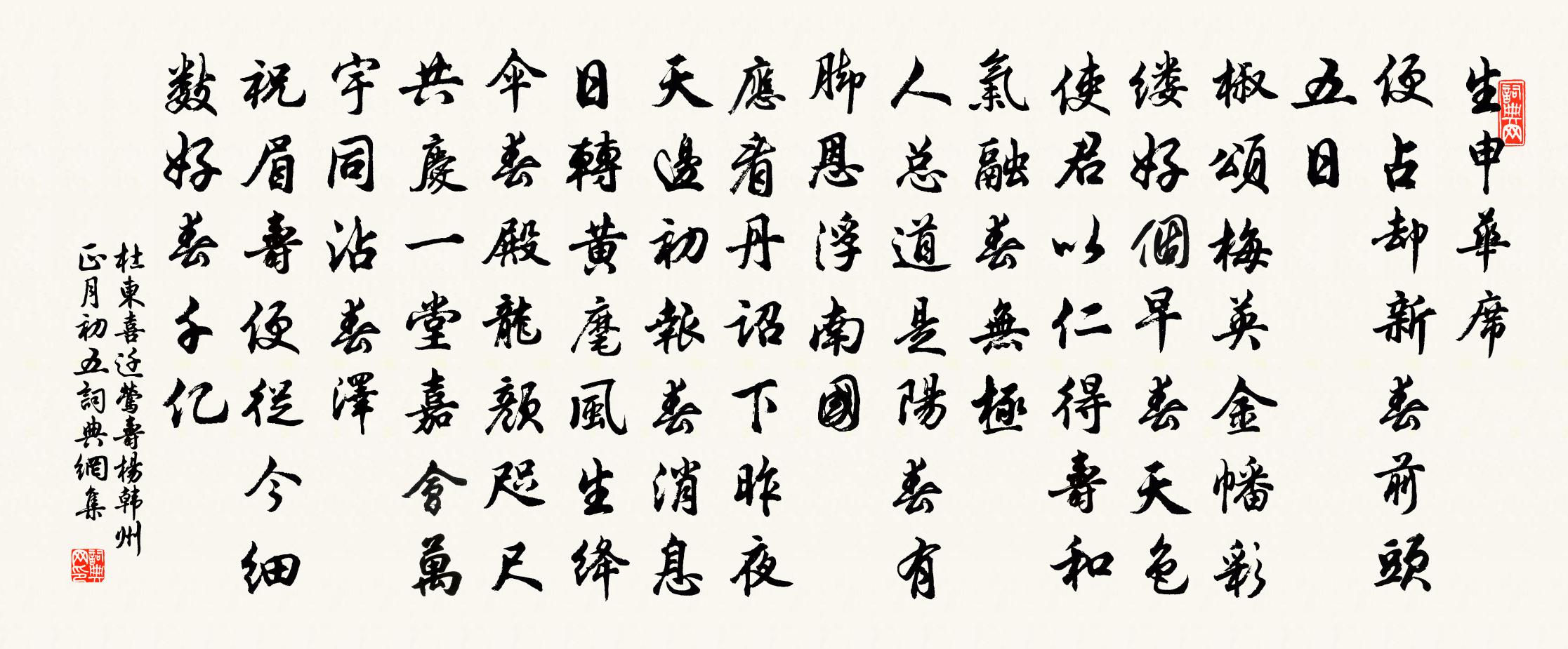 詩詞名句歷史字典書法欣賞書法字典國語詞典說文解字康熙字典古漢語字典標 題 作 者 詩 句 喜遷鶯(壽楊韓州·正月初五)作者:杜東 朝代:宋代原文生申華席。便占卻新春,前頭五日。椒頌梅英,金幡彩縷,好個早春天色。使君以仁得壽,和氣融春無極。人總道,是陽春有腳,恩浮南國。應看,丹詔下,昨夜天邊,初報春訊息。日轉黃麾,風生絳傘,春殿龍顏咫尺。共慶一堂嘉會,萬宇同沾春澤。祝眉壽,便從今細數,好春千億。詩詞問答問:《喜遷鶯(壽楊韓州·正月初五)》的作者是誰?答:杜東問:該詩寫於哪個朝代?答:宋代問:該詩是什麼體裁?答:詞書法欣賞喜遷鶯(壽楊韓州·正月初五)書法作品詩詞推薦滿江紅黃人傑〔宋代〕居士生朝,元來是、湖山勝日。長共薦、霜前籬落,半黃橙桔。酒壓浮蛆新旨釅,香浮瑞獸祥煙密。更小蠻、清唱己亥雜詩·其五龔自珍〔清代〕浩蕩離愁白日斜,吟鞭東指即天涯。落紅不是無情物,化作春泥更護花。雜劇·翠紅鄉兒女兩團圓高茂卿〔元代〕楔子(搽旦扮李氏同二淨福童、安童上)(搽旦詩云)人無千日好,花無百日紅。早時不算計,過後一場空。老身送師相陳大觀文喻良能〔宋代〕地總全閩控百蠻,政成治最二年間。五千里見耕桑盛,百萬人欣日月閒。答高山人兼呈權顧二侯李白〔唐代〕虹霓掩天光,哲後起康濟。應運生夔龍,開元掃氛翳。太微廓金鏡,端拱清遐裔。輕塵集嵩岳,虛點盛明意。謬揮題淵明軒賀鑄〔宋代〕淵明新榜揭門眉,夫子高情俗不知。未仰秫秔供歲計,本於松菊有心期。臥來不淺羲皇興,歸去何慙鄉里兒。窗破歲暮呈真翰林戴復古〔宋代〕歲事朝朝迫,家書字字愁。頻沽深巷酒,獨倚異鄉樓。詩骨梅花瘦,歸心江水流。狂謀渺無際,忍看大刀頭。清快吟錢時〔宋代〕清似秋岩琴上月,快如春峽棹前波。三間茅屋埋頭坐,一榻薰風信口歌。因憶灊樓讀書之樂呈介甫王令〔宋代〕憶昨灊樓幸久留,乾坤談罷論睢鳩。它時已恨相從少,此日能忘共學不。南去溪山隨夢斷,北來身世若雲浮。行藏賀李觀察禱河神降雨耿湋〔唐代〕質明齋祭北風微,騶馭千群擁廟扉。玉帛才敷雲淡淡,笙鏞未撤雨霏霏。路邊五稼添膏長,河上雙旌帶濕歸。若出【中呂】十二月過堯民歌_靜慘慘煙霞佚名〔元代〕靜慘慘煙霞嶺外,響潺潺澗水橋西。光燦燦銀河倒瀉,高聳聳碧玉盤堆。滿山滿樹幽微景致,錦模糊一帶屏圍。更西歸有期喜而復作虞儔〔宋代〕懶於塵土踏京華,張翰西風久憶家。江上魚肥應可膾,田家酒熟未容賒。狂蹤泛泛渾猶梗,病眼昏昏只俗花。為報清音亭憩暑徐沖淵〔宋代〕水落石澗鳴,中含太古音。安得微妙人,寫入朱弦琴。六月天不雨,赤日雲無陰。道人憩其側,脫巾臥青林。好風遊子吟陳陶〔唐代〕棲烏喜林曙,驚蓬傷歲闌。關河三尺雪,何處是天山。朔風無重衣,仆馬飢且寒。慘戚別妻子,遲回出門難。男兒寄題明月禪院二首釋贊寧〔宋代〕參差峰岫晝雲昏,入望交蘿濁浪奔。震澤涌山來北岸,華陽連洞到東門。日生樹掛紅霞腳,風起波搖白石根。聞有寄閩中溪寺釋文珦〔宋代〕獨宿閩溪寺,中宵夢自驚。月斜移樹影,風急轉灘聲。起對清秋色,難為遠客情。雲山千萬疊,何處是神京。頌古二十七首釋雲賁〔宋代〕兩手擎來教放下,空身立地更疑猜。根塵識界無尋處,多謝春風爛漫開。石州慢(書所見寄子野、公明)張炎〔宋代〕野色驚秋,隨意散愁,踏碎黃葉。誰家籬院閒花,似語試妝嬌怯。行行步影,未教背寫腰肢,一搦猶立門前雪。依閉門陸游〔宋代〕殘發凋零不滿巾,閉門聊得養天真。恐傷藥草停除地,為惜松槎禁伐薪。獨木架成新略彴,一峰買得小嶙峋。蕭然覓酒於宋伯潛廖行之〔宋代〕典衣無策漸朝衫,早計君毋笑拊驂。未辨牆頭仍翁下,空喔斗北與箕南。蒲萄不作涼州想,庚癸猶酬褐父談。折簡名句推薦同為懶慢園林客,共對蕭條雨雪天。白居易《雪夜小飲贈夢得》 錦瑟華年誰與度?賀鑄《青玉案·凌波不過橫塘路》 閣雪雲低,卷沙風急,驚雁失序。吳文英《永遇樂·探梅次時齋韻》 劇辛樂毅感恩分,輸肝剖膽效英才。李白《行路難三首》 西窗下,風搖翠竹,疑是故人來。秦觀《滿庭芳·碧水驚秋》 苦心中常得悅心之趣;得意時便一失意之悲。洪應明《菜根譚·概論》 流水落花春去也,天上人間。李煜《浪淘沙令·簾外雨潺潺》 八月長江萬里晴,千帆一道帶風輕。崔季卿《晴江秋望》 秋風蕭瑟天氣涼,草木搖落露為霜,群燕辭歸鵠南翔。曹丕《燕歌行二首·其一》 何處飛來林間鵲,蹙踏松梢微雪。辛棄疾《賀新郎·把酒長亭說》