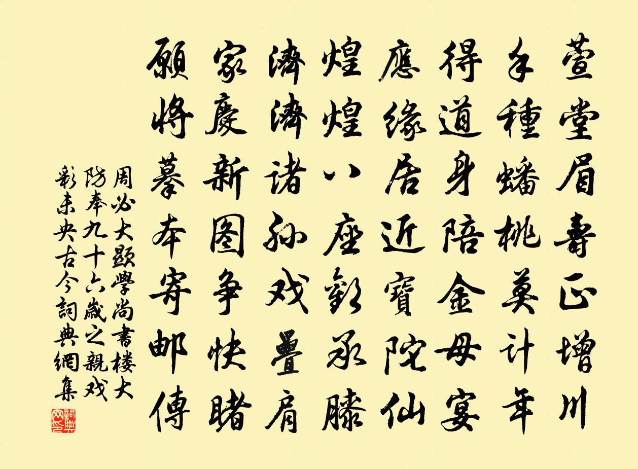 詩詞名句歷史字典書法欣賞書法字典國語詞典說文解字康熙字典古漢語字典標 題 作 者 詩 句 顯學尚書樓大防奉九十六歲之親戲彩未央古今作者:周必大 朝代:宋代原文萱堂眉壽正增川,手種蟠桃莫計年。得道身陪金母宴,應緣居近寶陀仙。煌煌八座歡承膝,濟濟諸孫戲疊肩。家慶新圖爭快睹,願將摹本寄郵傳。詩詞問答問:《顯學尚書樓大防奉九十六歲之親戲彩未央古今》的作者是誰?答:周必大問:該詩寫於哪個朝代?答:宋代書法欣賞顯學尚書樓大防奉九十六歲之親戲彩未央古今書法作品詩文賞析【原題】:顯學尚書樓大防奉九十六歲之親戲彩未央古今鮮儷遠蒙五詩皆和鄙句謹次韻為慶詩詞推薦塞下行贈韋士潁歸鄂渚上江陵謁閫相柴望〔宋代〕長安二月春正濃,長江二月風正急。城頭楊柳雪絮飛,道傍黏雨沱潦濕。邯鄲誰家俠少年,上馬意氣揮金鞭,下馬唐律十首方岳〔宋代〕松露滴深幽,山寒草逕秋。蔓藤行伏兔,野竹上牽牛。日月雙車轂,乾坤一傳郵。功名成底事,何苦覓封侯。醉落魄(務觀席上索賦)韓元吉〔宋代〕樓頭晚鼓。佳人莫唱黃金縷。良宵鐙火還三五。腸斷扁舟,明日江南去。離觴欲醉誰能許。風前蝶鬧蜂兒舞。明年奉和族祖紫嚴翁謾興十首汪炎昶〔宋代〕地稈山故崇,河黃濟故清。彼豈超然中,但婢吾無能。我家壁中書,不知相牛經。句韋澳〔唐代〕莫將韋監同殷監,錯認容身是保身。送鄧漕移帥揚州二首周必大〔宋代〕聞道維揚地望雄,風流人物似江東。六龍前日臨淮海,五馬由來說醉翁。璧月幾橋留夜色,珠簾十里待春風。遙知喜適鶯 贈道友王哲〔元代〕問公為善。這大道無方,如何迴轉。猛舍浮華,搜尋玄妙,閒里做成修練。認取起初真性,捉住根源方便。本來面朱元晦寄詩劉貢父有風藉溪先生之意詞甚妙而胡宏〔宋代〕幽人遍愛青山好,為是青山青不老。山中雲出雨乾坤,洗過一番山更好。夜坐黎廷瑞〔宋代〕梧桐月轉影翩翩,竹屋抄書夜未眠。林下不知秋遠近,西風一葉墮燈前。以日者命狀寄王龜齡唐文若〔宋代〕試把流年子細看,休將蠖屈比鵬摶。君家大有回天力,不為區區作好官。顯禪人求頌釋正覺〔宋代〕顯處機須隱,忙時智自閒。泥牛初出海,玉馬復臨關。寒水澄涵月,流雲靜倚山。回途分化柄,不作舊家慳。送從上人馳書至京西釋正覺〔宋代〕衲帔蒙頭自照人,月明堂上轉機輪。肯傳千里鶺鴒語,要作十分棠棣春。雪嶺同風當日事,石頭束篾舊時麟。家林挽葛簽判二首劉宰〔宋代〕先帝龍飛第一春,霜袍濟濟對嚴長。祗今舊侶能多少,又對西風哭此人。新年五首蘇軾〔宋代〕北渚集群鷺,新年何所之。盡歸喬木寺,分占結巢枝。生物會有役,謀身各及時。何當禁畢弋,看引雪衣兒。苦雨方岳〔宋代〕稼欲登場只等晴,入倉方始是收成。雨須小住為佳耳,已約鄰翁話太平。和鄰女搔綿吟趙希逢〔宋代〕門外數聲風動竹,知是客來矩輿輻。嫣然一笑為誰開,眼前喜見人如玉。奚奴側背□錦囊,共看嬌容理蟹筐。可堪次韻子儀初夏偶作黃庶〔宋代〕醉紅芳寂寞,吟綠又裝成。急雨荷宜聽,清風簟可迎。燕忙諳物態,花盡見時情。獨有無言意,不知枯與榮。獄空喻良能〔宋代〕公庭日將夕,吏報空獄岸。雖無春草鞠,已有蛛絲蔓。歡樂見鳥烏,呻吟絕鵝雁。諒非片言折,聊發一笑粲。步蟾宮(守歲)章謙亨〔宋代〕團欒小酌醺醺醉。廝捱著、沒人肯睡。呼盧直到五更頭,便鋪了妝檯梳洗。庭前鼓吹喧人耳。驀忽地、又添一歲。清心鏡 本名紅窗迥馬鈺〔元代〕我當初,為庵主。勤勤接待,雲朋霞侶。時時地、疏遠塵緣,漸漸成覺悟。悟心開,便得遇。本師遣我,專來化度名句推薦不知何處火,來就客心然。沈佺期《寒食》 漢帝重阿嬌,貯之黃金屋。李白《妾薄命》 明朝事與孤煙冷,做滿湖、風雨愁人。吳文英《渡江雲三犯·西湖清明》 暗教愁損蘭成,可憐夜夜關情張炎《清平樂·候蛩淒斷》 平生多感激,忠義非外獎。李白《酬裴侍御對雨感時見贈》 聚散匆匆,雲邊孤雁,水上浮萍。劉過《柳梢青·送盧梅坡》 快上西樓,怕天放、浮雲遮月。辛棄疾《滿江紅·中秋寄遠》 誰見汀洲上,相思愁白蘋。劉長卿《餞別王十一南遊》 昨別今已春,鬢絲生幾縷。韋應物《長安遇馮著》 沙岸菊開花,霜枝果垂實。崔元翰《奉和聖制重陽旦日百寮曲江宴示懷》