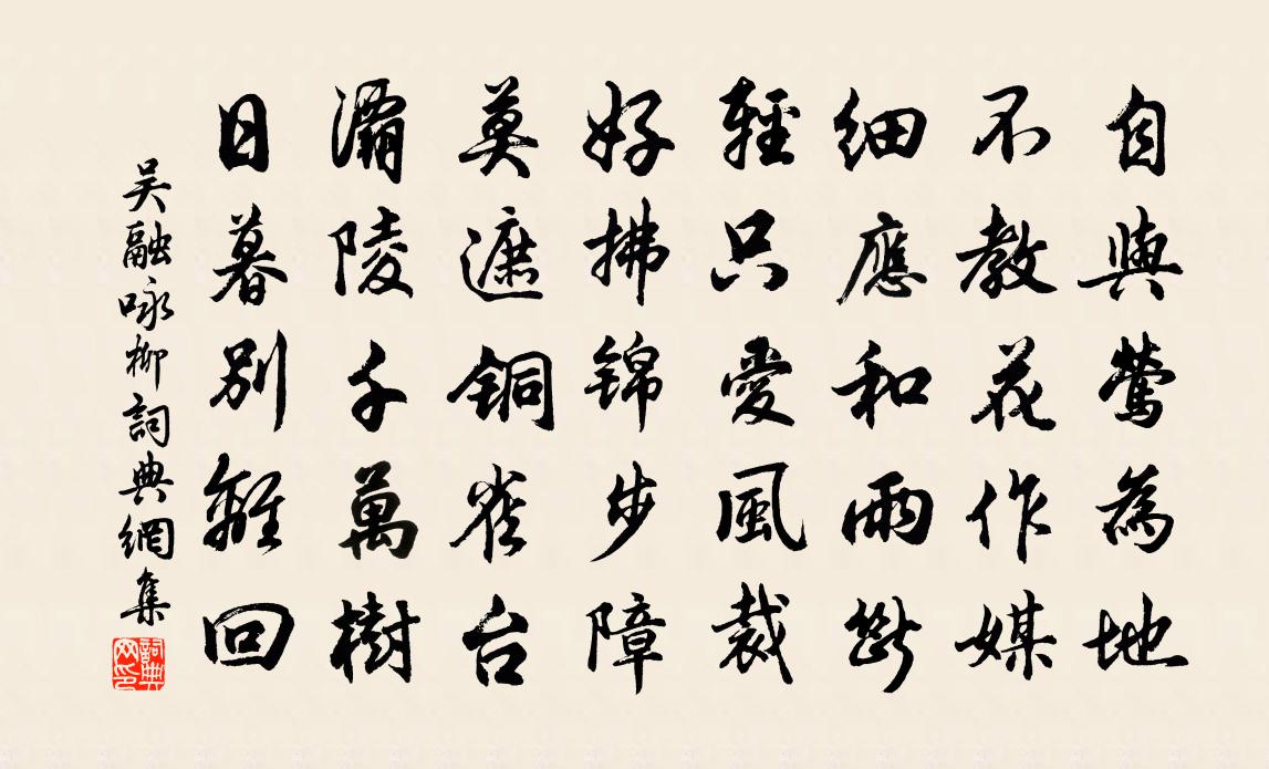詩詞名句歷史字典書法欣賞書法字典國語詞典說文解字康熙字典古漢語字典標 題 作 者 詩 句 詠柳作者:吳融 朝代:唐代詠柳原文自與鶯為地,不教花作媒。細應和雨斷,輕只愛風裁。好拂錦步障,莫遮銅雀台。灞陵千萬樹,日暮別離回。詩詞問答問:詠柳的作者是誰?答:吳融問:詠柳寫於哪個朝代?答:唐代問:詠柳是什麼體裁?答:五律吳融詠柳書法欣賞詠柳書法作品注釋全唐詩:卷685-12詩詞推薦聞邕盜王令〔宋代〕病中雙淚語前流,藜藿無端肉食憂。常嘆平時輕死士,未知誰手付天矛。好將弓劍隨軍去,況是英雄得志秋。若使會將作崔監東園姚合〔唐代〕牆北走紅塵,牆東接白雲。山光衣上見,藥氣酒中聞。此會誠堪惜,窮秋日又曛。人間唯有醉,醉後復何雲。寄王介卿曾鞏〔宋代〕憶昨走京塵,衡門始相識。疏簾掛秋日,客庖留共食。紛紛說古今,洞不置藩域。有司甄棟乾,度量棄樗櫟。振轡相和歌辭。採蓮曲二首戎昱〔唐代〕雖聽採蓮曲,詎識採蓮心。漾楫愛花遠,回船愁浪深。煙生極浦色,日落半江陰。同侶憐波靜,看妝墮玉簪。涔陽千秋歲秦觀〔宋代〕水邊沙外,城郭春寒退。花影亂,鶯聲碎。飄零疏酒盞,離別寬衣帶。人不見,碧雲暮合空相對。憶昔西池會,鵷送石士志推官赴調洪咨夔〔宋代〕石友抱奇璞,朅來掾吾邦。昂然凌霄姿,莒鼎獨力扛。入幕有此士,諸人亮難雙。決事風赴谷,喔詩雨翻江。青衫跋王介甫游鐘山圖張栻〔宋代〕林影溪光靜自如,蕭疎短鬢獨騎驢。可能胸次都無事,擬向山中更著書。身里出門釋正覺〔宋代〕放曠還來荊棘林,倒騎牛自醉吟吟。誰嫌煙雨鬧蓑笠,只個虛空不掛針。偈頌七十六首釋師範〔宋代〕土宿頷下長髭鬚,淨飯宮中生悉達。西在此土絕知音,千古萬古阿刺刺。被酒獨行,遍至子云威徽先覺四黎之舍,三首蘇軾〔宋代〕總角黎家三四童,口吹蔥葉送迎翁。莫作天涯萬里意,溪邊自有舞雩風。黃雀餉師渾甫家仲安史堯弼〔宋代〕深秋風露豆苗肥,一粒才貪觸禍機。萬裡頭顱無處覓,刺天那復見群飛。醉芙蓉陳簡軒〔宋代〕璚姬秋宴集蓬壺,酒暈微微上雪酥。笑倚西風渾不定,因臨流水欲相扶。綠雲香減霜初冷,紅玉痕消日又晡。妝鏡夜泊毗陵無錫縣有寄羅隱〔唐代〕草蟲幽咽樹初團,獨系孤舟夜已闌。濁浪勢奔吳苑急,疏鐘聲徹惠山寒。愁催鬢髮凋何易,貧戀家鄉別漸難。他日莊器之賢能良居鏡湖上作吾亦愛吾廬六詩見張鎡〔宋代〕吾亦愛吾廬,試聽談向背。維南匯平湖,浙水實分派。兩峰屹三塔,形勢遠襟帶。城中那有此,到處憐湫隘。拿舟雪牛釋心月〔宋代〕露迥迥地趁不去,時復深村荒草行。一色皮毛都換了,荷擔須是者眾生。送姚先生歸宜山三首陳師道〔宋代〕宇定心清面發丹,下床投杖覺輕安。此身已許壺丘子,他日爭尋靖長官。仲躬示侍郎丈筩字韻詠雪次韻李洪〔宋代〕溪汀渺渺躍鳧翁,織浪雕雲訝許同。散漫六霙疑剪水,連娟萬舞趁迴風。瞻山遐想崑邱勝,宴坐方觀 * 空。繡斧旅中有感復有前韻陳棣〔宋代〕擿埴憑誰為指南,囊空羞澀不容探。年光有限堂堂去,世事無心細細參。故舊白頭驚未識,比隣青眼喜相諳。此生讀史六首蘇轍〔宋代〕江河浪如屋,要須滄海容。可憐狄仁傑,猶復負婁公。古斷腸曲三十首周端臣〔宋代〕依舊斜陽燕子樓,共誰把酒話閒愁。韋娘去後西風老,爛漫黃花滿院秋。名句推薦樹繞村莊,水滿陂塘。秦觀《行香子·樹繞村莊》 秋逼暗蟲通夕響,征衣未寄莫飛霜。張仲素《秋夜曲》 君子上交不諂,下交不瀆佚名《易傳·繫辭傳下·第五章》 彌傷孤舟夜,遠結萬里心。權德輿《月夜江行 / 旅次江亭》 燈半昏時,月半明時。徐再思《折桂令·春情》 復值接輿醉,狂歌五柳前。王維《輞川閒居贈裴秀才迪》 范增一去無謀主,韓信原來是逐臣。嚴遂成《烏江項王廟》 銅盤燭淚已流盡,霏霏涼露沾衣周邦彥《夜飛鵲·河橋送人處》 元宵佳節,融和天氣,次第豈無風雨。李清照《永遇樂·落日熔金》 送數聲驚雁,下離煙水,嘹唳度寒雲。孔夷《南浦·旅懷》