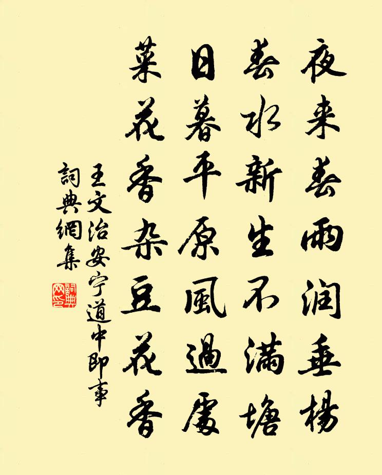 詩詞名句歷史字典書法欣賞書法字典國語詞典說文解字康熙字典古漢語字典標 題 作 者 詩 句 安寧道中即事作者:王文治 朝代:清代安寧道中即事原文夜來春雨潤垂楊,春水新生不滿塘。日暮平原風過處,菜花香雜豆花香。詩詞問答問:安寧道中即事的作者是誰?答:王文治問:安寧道中即事寫於哪個朝代?答:清代問:安寧道中即事是什麼體裁?答:七絕王文治安寧道中即事書法欣賞安寧道中即事書法作品注釋姜葆夫、韋良成選注《常用古詩》詩詞推薦賦杜子美劉夢得遺事李復〔宋代〕壁間石刻圖經在,瀼外祠堂繪像真。秋去書懷傳北客,歸時遺曲祠蠻神。十年口語投荒謫,千里兵戈下峽身。嗟我句王安石〔宋代〕濃綠萬枝一點紅,動人春色不須多。廬陵劉兄焱袖詩編稿相訪借所和施從可唱酬韻程公許〔宋代〕清愁如海渺無邊,強整衰容傍酒船。若許白鷗同保社,五湖秋水碧於天。次韻長沙鄭監廟公選曹彥約〔宋代〕先生清德徹寒泉,應俗周旋更折旋。遊宦向來徒溷耳,盛名今得孰多焉。詩嚴尚作蜂腰格,志大寧憂馬腹鞭。卻似頌古二首釋曇密〔宋代〕塞北平沙闊,黃河袞底流。征帆才及岸,蠻狄一時收。偶作二首趙蕃〔宋代〕舊箑已成揮,還披御臘衣。乘除因人事,變化亦天機。道路飄零久,形容少壯非。無徒微祿眷,長與故人違。摸魚兒(玉林君為遺蛻山中桃花賦也。花與主人,何幸如之,用韻和謝)馮取洽〔宋代〕嘆劉郎、那回輕別,霏霏三落紅雨。玄都觀里應遺恨,一抹斷煙殘縷。愁望處。想霧暗雲深,忘卻來時路。新花舊偈頌四十一首釋普寧〔宋代〕諸方安居結制,靈岩結制安居。雖是一般規矩,於中大有差殊。趙州東壁掛葫蘆。寄韓玉璵二首董嗣杲〔宋代〕涼夢幾迴繞孤嶼,想見絕得人間暑。西湖瀛嶼綠更熾,君胡為兮不安處。信美非土固所慮,樓台近水何多阻。自顧送張寺丞知常州項安世〔宋代〕吾鄉人物鄭與張,堂堂介圭出琳琅。論文合草北扉制,論經合講金華藝。兩途未遂如命何,四方為君充撫摩。鄭公和趙季行用蘭花韻三首劉宰〔宋代〕結根喦谷謝群芳,多謝光風為發揚。騷客毋煩賦紉佩,省郎行矣趣含香。留春令(梅)高觀國〔宋代〕玉清冰瘦,洗妝初見,春風頭面。等得黃昏月溪寒,愛顧影、臨清淺。歷盡冰霜空羞怨。怨粉香消減。江北江南舊春寒高翥〔宋代〕料峭東風破客衣,春寒不比臘前時。絕憐牆角櫻桃樹,全似梅花雪後枝。福州開元寺塔周朴〔唐代〕開元寺里七重塔,遙對方山影擬齊。雜俗人看離世界,孤高僧上覺天低。唯堪片片紫霞映,不與蒙蒙白霧迷。心若次山房岐絲吟韻何夢桂〔宋代〕南北本同歸何人泣異岐。玄黃本同質,何人悲素絲。悲泣不自己,吾故憫翟朱。聖賢急救世,猶或與心違。二子救樵人十詠樵風陸龜蒙〔唐代〕朝隨早潮去,暮帶殘陽返。向背得清飆,相追無近遠。采山一何遲,服道常苦蹇。仙術信能為,年華未將晚。登嚴子陵釣台吳龍翰〔宋代〕萬乘從君腳底眠,客星便入史官占。東都基業隨流水,今日斯台尚姓嚴。頌古三十一首釋原妙〔宋代〕泥佛不度水,毗嵐風忽起。大地黑漫漫,衲僧爭敢視。金佛不度爐,鐵裹夜明珠。一槌俱粉碎,清光何處無。木佛送程給事知越州周直孺〔宋代〕三吳冠蓋並驅弛,名德如公亦已稀。胥口沈珠唐相事,會稽懷綬漢臣歸。光華書繡家山近,浩蕩秋風畫鷁飛。十萬舍北溪上垂釣陸游〔宋代〕大耋還家萬事非,垂竿好在綠苔磯。風和山雉挾雌過,村晚吳牛將犢歸。春漲新添塘灩灩,夕雲仍帶雨霏霏。此生名句推薦山遠天高煙水寒,相思楓葉丹。李煜《長相思·一重山》 竹徑通幽處,禪房花木深。常建《題破山寺後禪院》 嗟余聽鼓應官去,走馬蘭台類轉蓬。李商隱《無題·昨夜星辰昨夜風》 聰以知遠,明以察微。司馬遷《史記·五帝本紀》 近者說,遠者來。孔子弟子《論語·子路篇》 鳥飛反鄉,兔走歸窟,狐死首丘,寒將翔水,各哀其所生。劉安及其門客《淮南子·說林訓》 有一言,無一行,胃(謂)之誣。佚名《黃帝四經·十大經·雌雄節》 殘酒憶荊高,燕趙悲歌事未消。陳維崧《南鄉子·邢州道上作》 疏懶意何長,春風花草香。黃庭堅《菩薩蠻·半煙半雨溪橋畔》 臥看滿天雲不動,不知雲與我俱東。陳與義《襄邑道中》