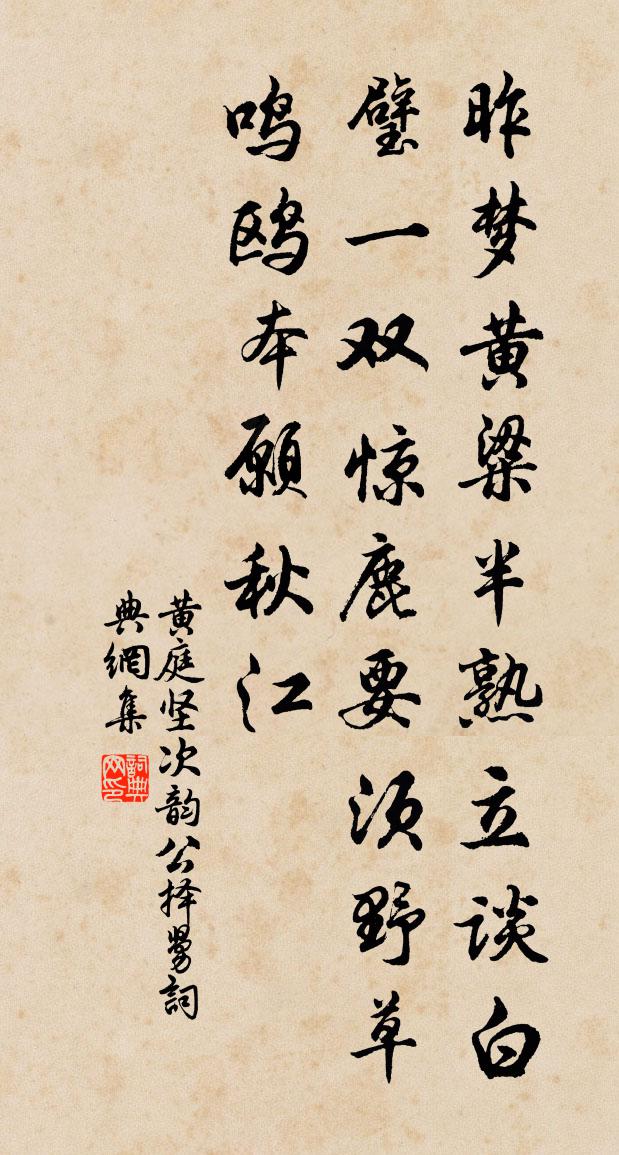詩詞名句歷史字典書法欣賞書法字典國語詞典說文解字康熙字典古漢語字典標 題 作 者 詩 句 次韻公擇舅作者:黃庭堅 朝代:宋代次韻公擇舅原文昨夢黃粱半熟,立談白璧一雙。驚鹿要須野草,鳴鷗本願秋江。詩詞問答問:次韻公擇舅的作者是誰?答:黃庭堅問:次韻公擇舅寫於哪個朝代?答:宋代問:黃庭堅的名句有哪些?答:黃庭堅名句大全黃庭堅次韻公擇舅書法欣賞次韻公擇舅書法作品詩詞推薦聞馬文天祥〔宋代〕過海安來柰若何,舟人去後馬臨河。若非神物扶忠直,世上未應僥倖多。象弈各有等級四絕品四人高下文天祥〔宋代〕擊柱論功不忍看,築壇刑馬誓河山。當年絳灌知何似,只在春秋魯衛間。題所居西齋張耒〔宋代〕幽居不厭小,小院有深庭。一曲秋風地,低檐夕照明。脫條株有態,止水瑩含清。中有支離客,吟腰瘦沉卿。改祭修齋決疑頌釋遵式〔宋代〕鬼道常饑渴,當生憐愍心。能蠲口中食,佛贊福田深。徐偃王廟楊伯岩〔宋代〕當年大德瑞朱弓,仁在斯民千古同。故國已無徐子土,靈祠今有梵王宮。水流檐影晴江上,山接鐘聲暮靄中。攬轡三月十六日至柯橋迎子布東還陸游〔宋代〕我似傷禽帶箭飛,更憐汝作雁行稀。異時恐抱終身恨,此日寧知徒步歸。萬里外應勞遠夢,三年前已掛朝衣。斷編木蘭花慢 送親家丈(原作又從南塘本改)問元好問〔金代〕又東門送客,側身西望長嗟。算萬里功名,幾番風雨,何限雲沙。相看已過半百,甚年年、各在一天涯。秋氣偏催泊江城下董嗣杲〔宋代〕雪後抵江城,江雲轉凝冱。我舟艤沙淺,煮酒御沉霧。少年繆誤多,今繆亦如故。流年無藥挽,如水必東注。失笑世路胡仲弓〔宋代〕春山寂寂鎖雲蘿,林外鉤輈聲最多。不是哥哥行不得,只愁世路有風波。贈通川詩僧肇書記葉適〔宋代〕海闊淮深萬里通,吟情浩蕩逐春風。卻尋斗水龍湫住,裁剪雲煙字字工。汪直卿相招以病爽約因成拙句並呈子大王炎〔宋代〕一聲鶗鴃落紅稀,試問春余幾許時。多謝佳招頻卜日,自慚衰配卻愆期。但能有酒肯留客,莫恨無花空折枝。邑下初夏閒吟,兼呈韋賓客白居易〔唐代〕孟夏清和月,東都閒散官。體中無病痛,眼下未饑寒。世事聞常悶,交遊見即歡。杯觴留客切,妓樂取人寬。雪鬢酒泉子李珣〔唐代〕寂寞青樓,風觸繡簾珠碎撼。月朦朧,花暗澹,鎖春愁尋思往事依稀夢,淚臉露桃紅色重。鬢欹蟬,釵墜鳳,思悠偈頌一百六十首釋宗杲〔宋代〕三個與四個,七個與八個。數目甚分明,無人數得過。既是數目分明,為甚麽無人數得過。道士著白襴,且非真措竹石屏歌謝遁澤王柏〔宋代〕好古博雅時遁澤,往歲贈我墨圖柏。今年揆予初度臨,又復持贈竹石屏。柏以祝我老,竹以堅我心。長歌短歌先後秋暮書懷張舜民〔宋代〕再到崆峒寺,題名尚宛然。存亡如昨日,筋力想當年。禍福歸玄鸐,晨昏聽杜鵑。此間無虎豹,好著養生編。貞牟書事陳與義〔宋代〕留侯辟穀年,漢鼎無餘功。子真策不售,脫跡市門中。神仙非異人,由來本英雄。撫世獨餘事,用舍何必同。眷此宿溪村書齋趙希邁〔宋代〕故人能下榻,為喜客相過。不住夜泉滴,常疑春雨多。風來琴自響,冰合硯難磨。明日還分袂,羈吟誰共喔。贈韋德卿秀才趙蕃〔宋代〕蚌繇珠剖孰為冤,鶴豈鳴皋且唳天。對策未居金馬上,夜書猶即短檠邊。子誠異嗜如昌歜,我愧沉痾非藉船。永好故刑部李尚書荊谷山集會張九齡〔唐代〕嘗聞繼老聃,身退道彌耽。結宇倚青壁,疏泉噴碧潭。苔石隨人古,煙花寄酒酣。山光紛向夕,歸興杜城南。名句推薦知之者不如行之者,行之者不如安之者。王通《中說·卷六·禮樂篇》 秋霜欲下手先知,燈底裁縫剪刀冷。白居易《空閨怨》 池上碧苔三四點,葉底黃鸝一兩聲。晏殊《破陣子·春景》 奸不容細,私告任坐使然也。韓非及後人《韓非子·制分》 竹塢無塵水檻清,相思迢遞隔重城。李商隱《宿駱氏亭寄懷崔雍崔袞》 待浮花、浪蕊都盡,伴君幽獨。蘇軾《賀新郎·夏景》 獨坐幽篁里,彈琴復長嘯。王維《竹里館》 三萬里河東入海,五千仞岳上摩天。陸游《秋夜將曉出籬門迎涼有感》 莊生曉夢迷蝴蝶,望帝春心托杜鵑。李商隱《錦瑟》 同居長乾里,兩小無嫌猜。李白《長干行二首》